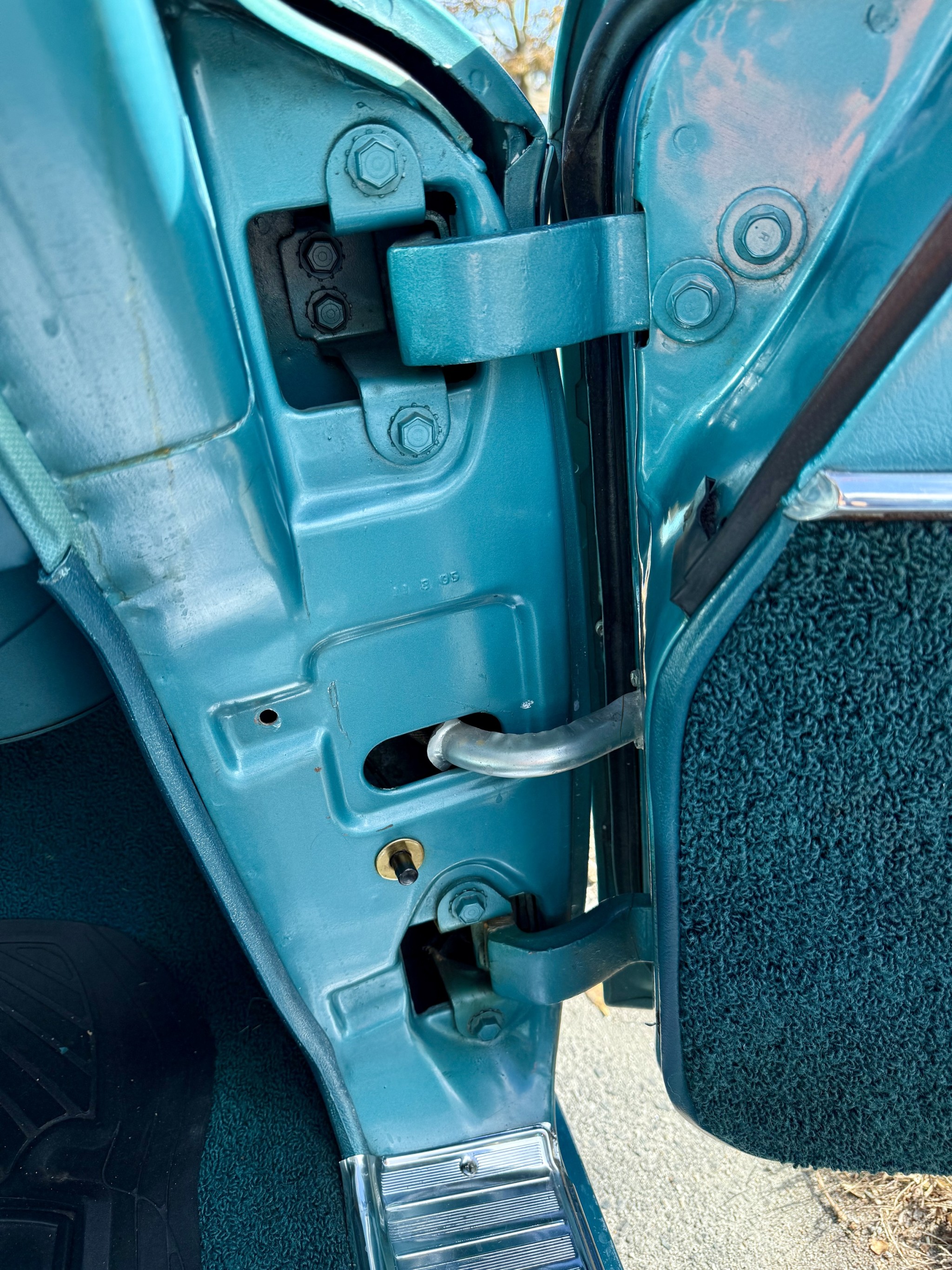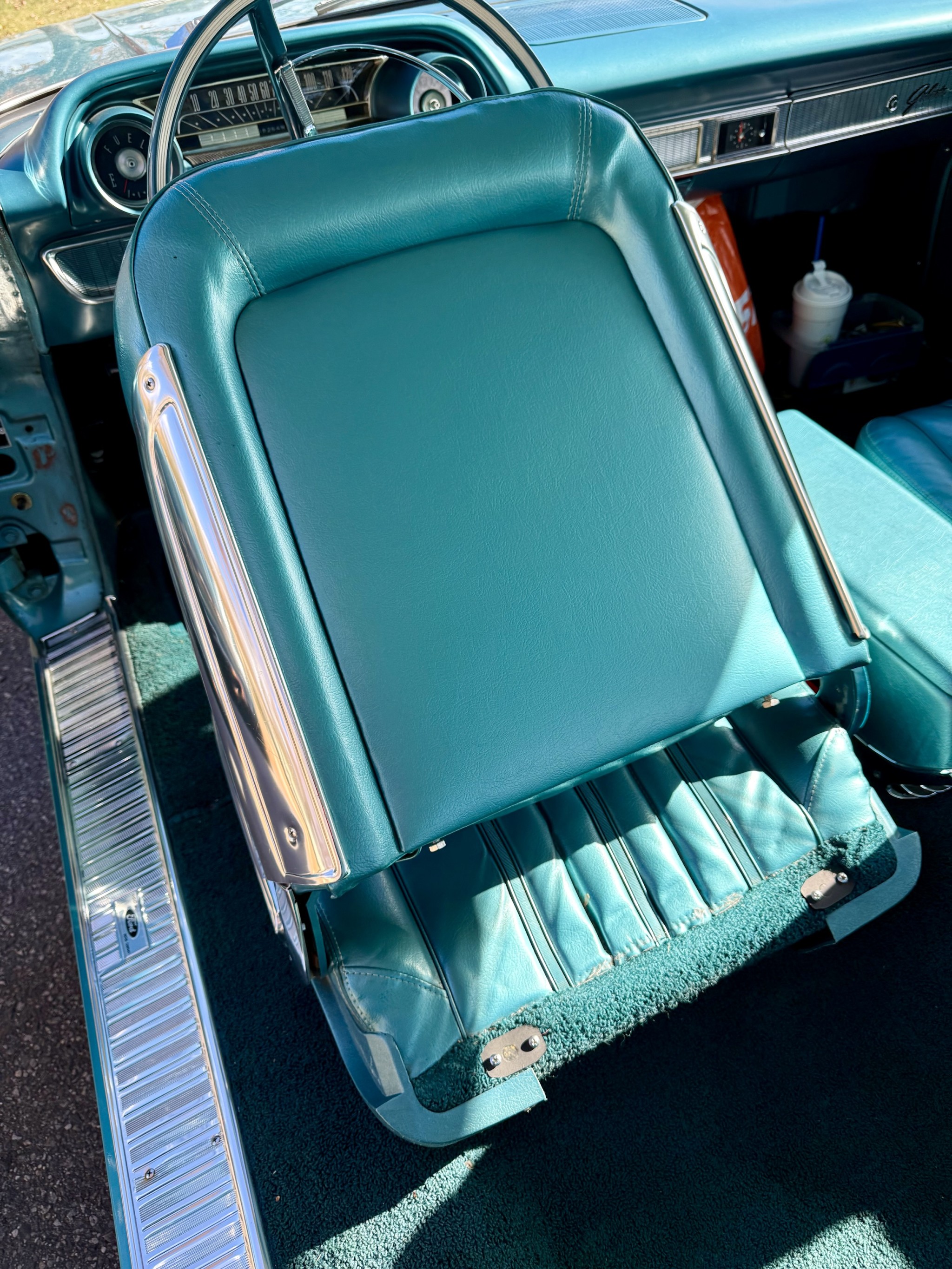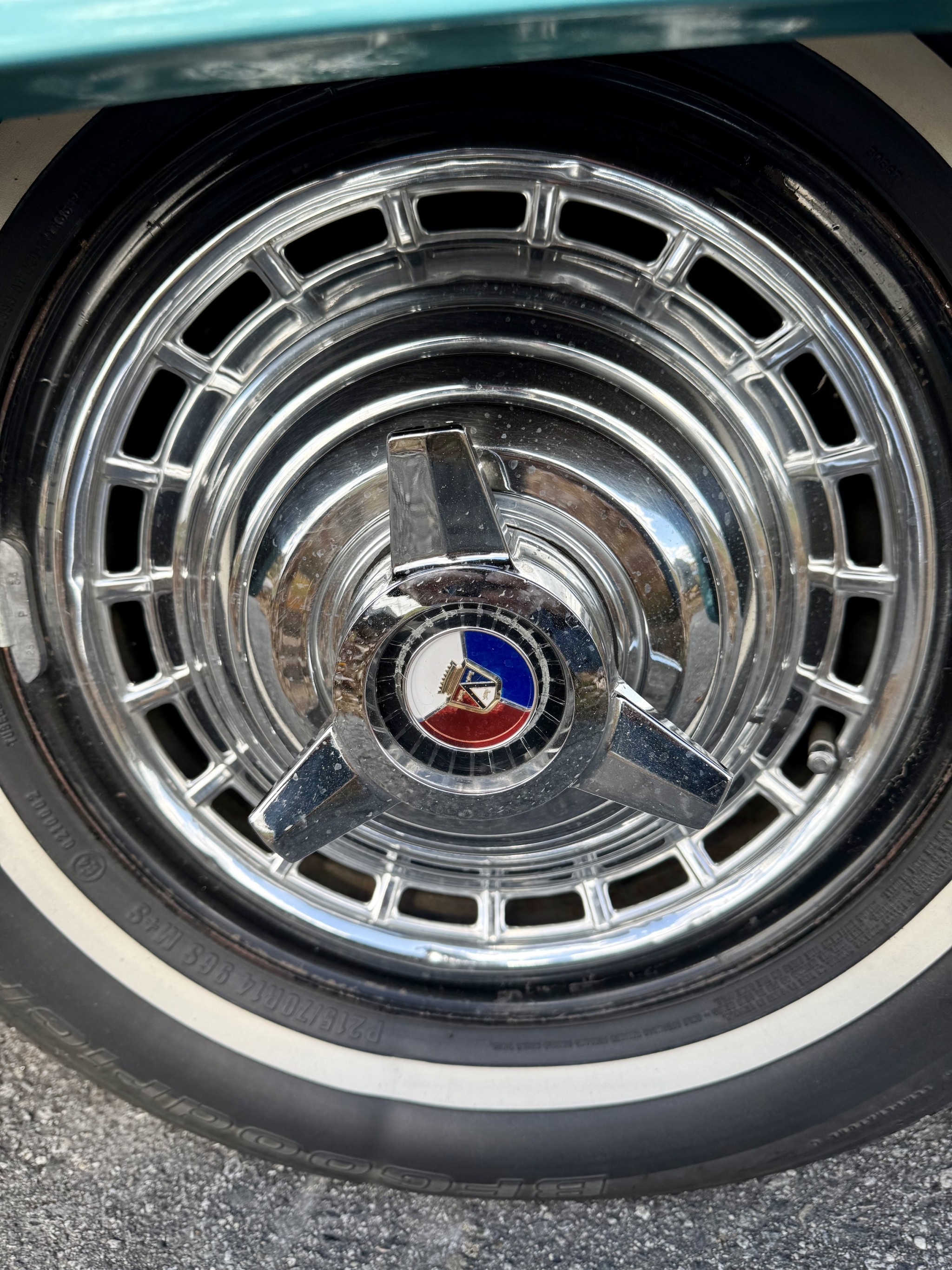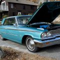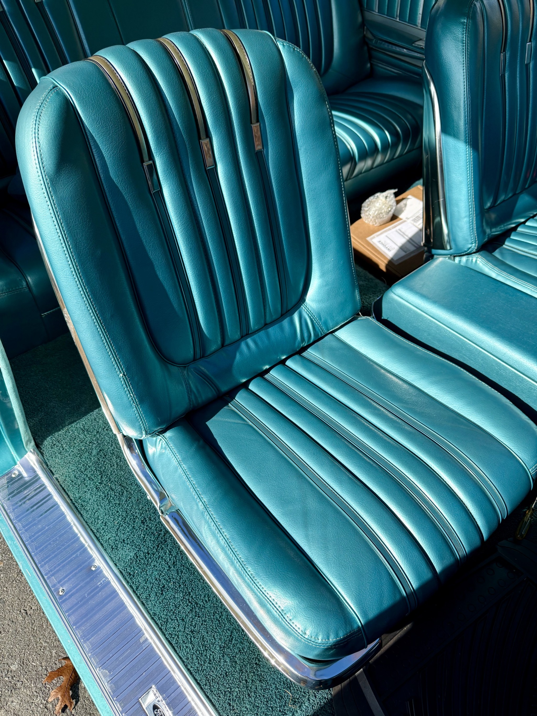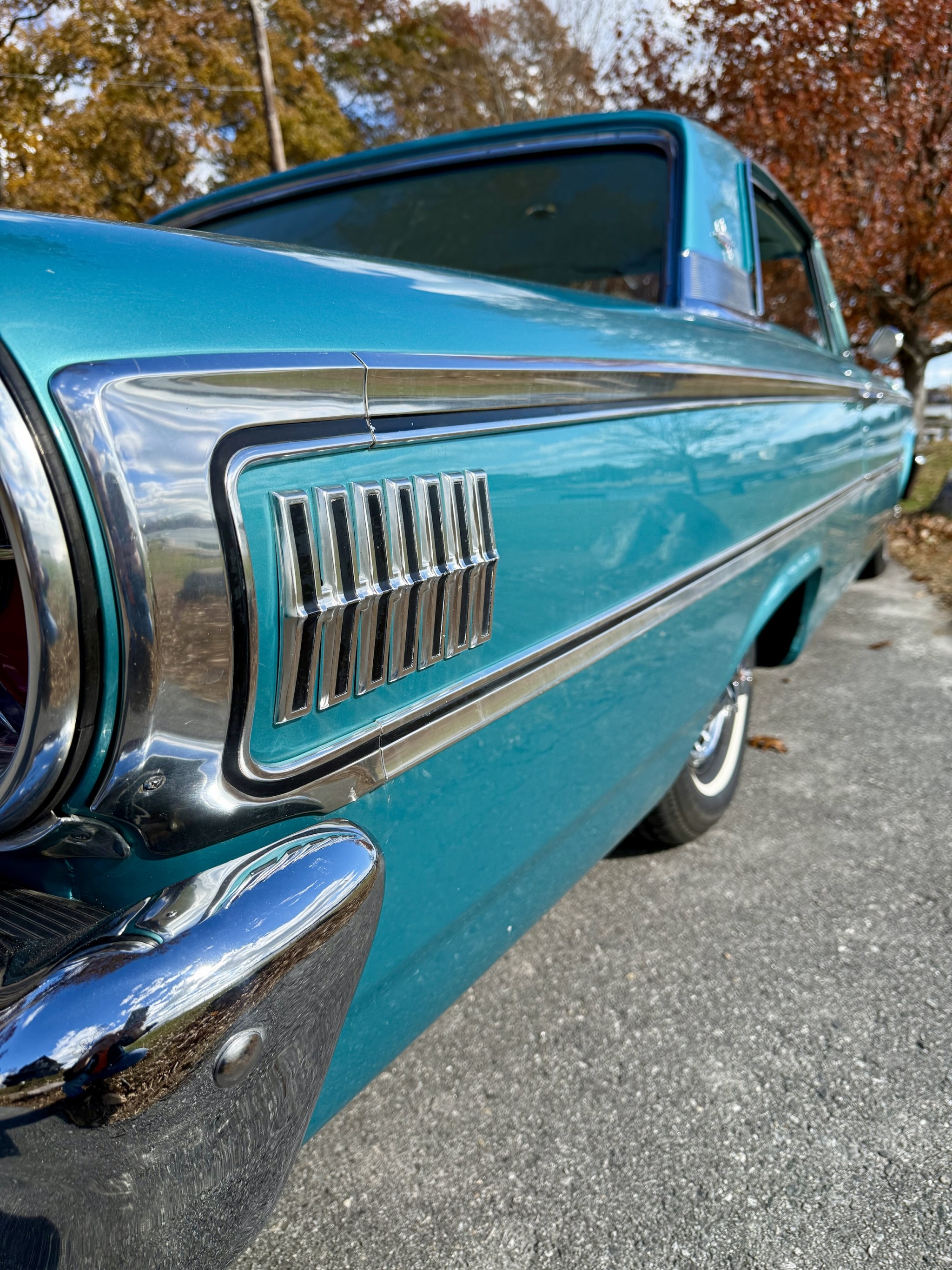 Perhaps more unusual than the two-barrel/four-speed combination is the fact that the original owner didn’t order a radio, so you’ll find a radio-blanking plate that would have been more at home in a Ford 300 than a top-of-the-line Galaxie. The interior trim is code 87 (Light Turquoise), and it’s a dazzling combination with the car’s Ming Green Metallic paint.