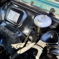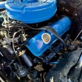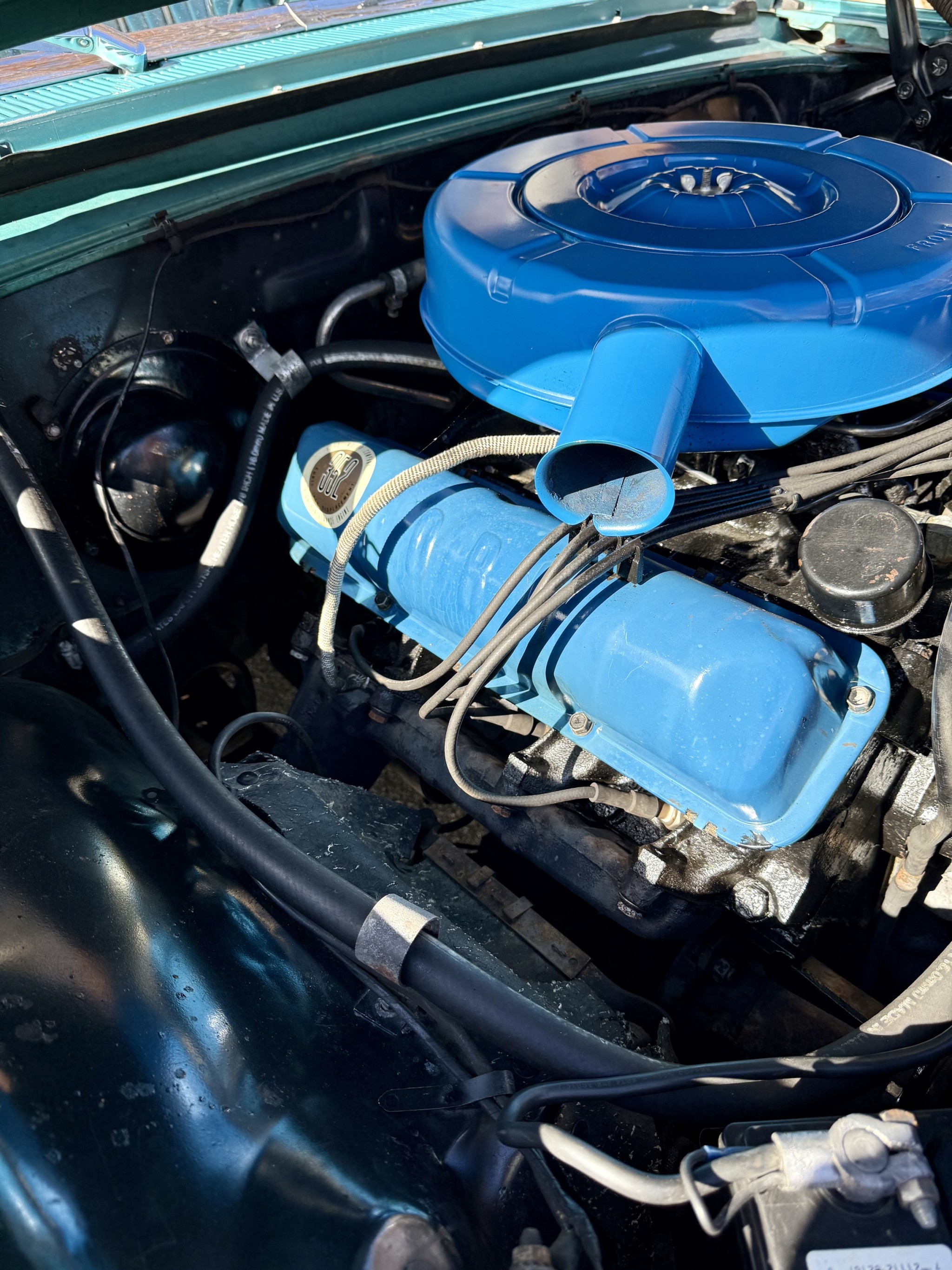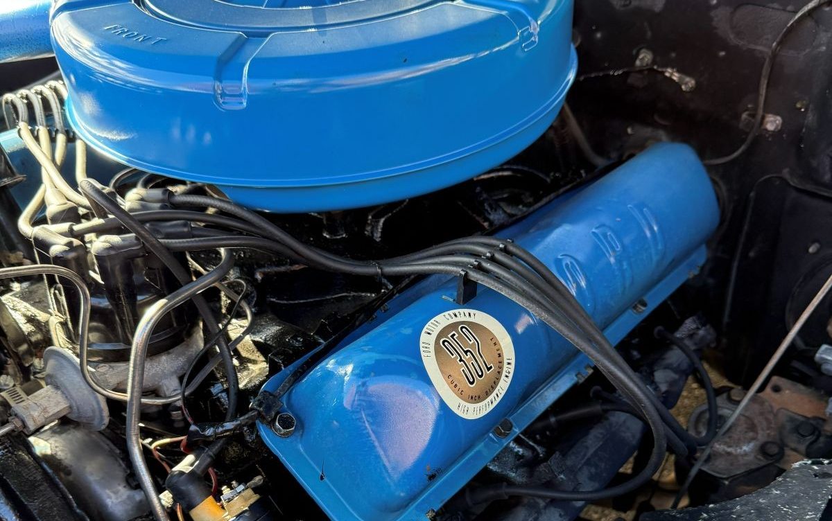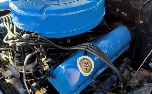 The engine won’t surprise anyone; it’s the X-Code 352 two-barrel that produced 220 horsepower on regular gas. The blue valve covers and air cleaner, in combination with a black engine block, heads, and intake manifold, are correct for a 1963 352; a Ford Blue engine was still three years off in 1963, and Ford used disparate valve cover/air cleaner colors to differentiate their engines. This car has power steering but no power brakes, which wasn’t an uncommon combination in the 1960s.