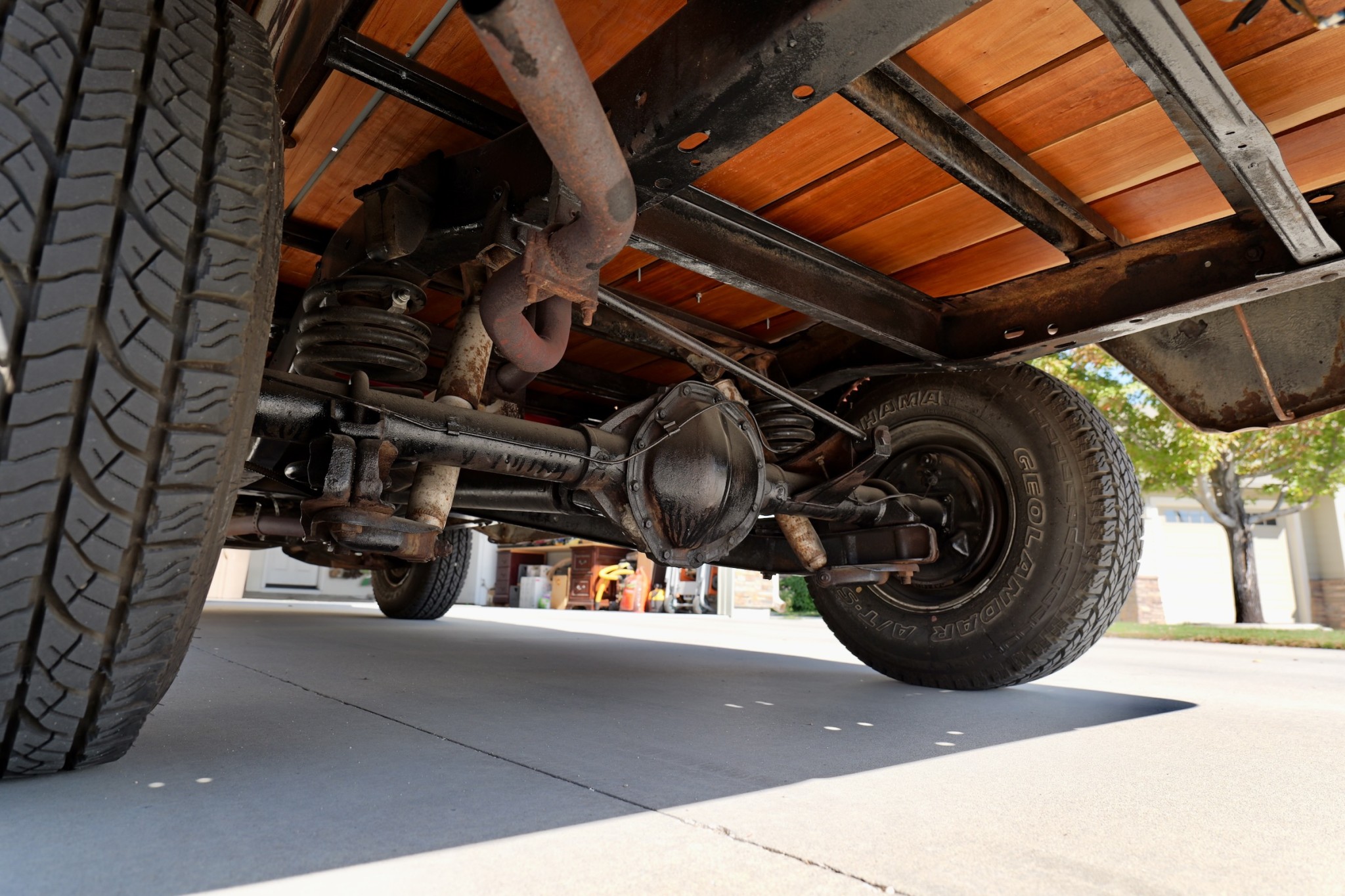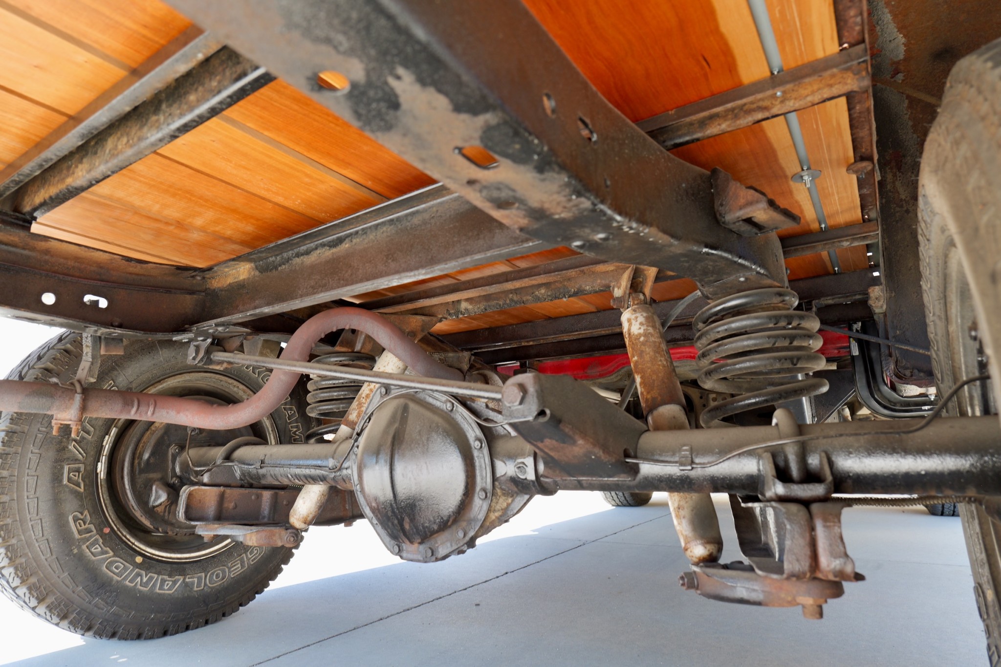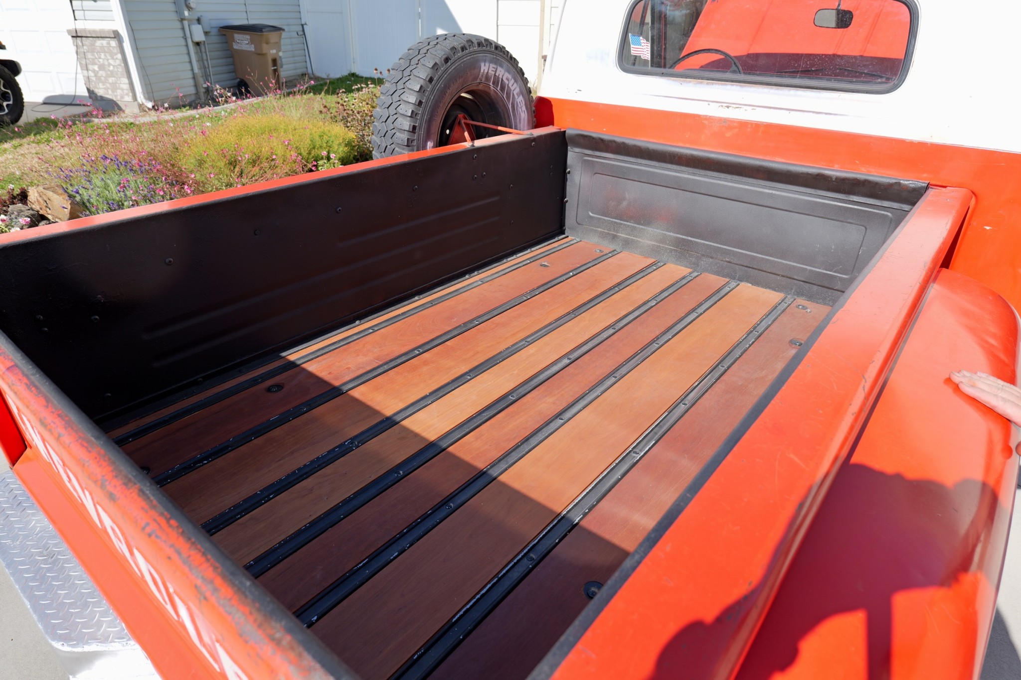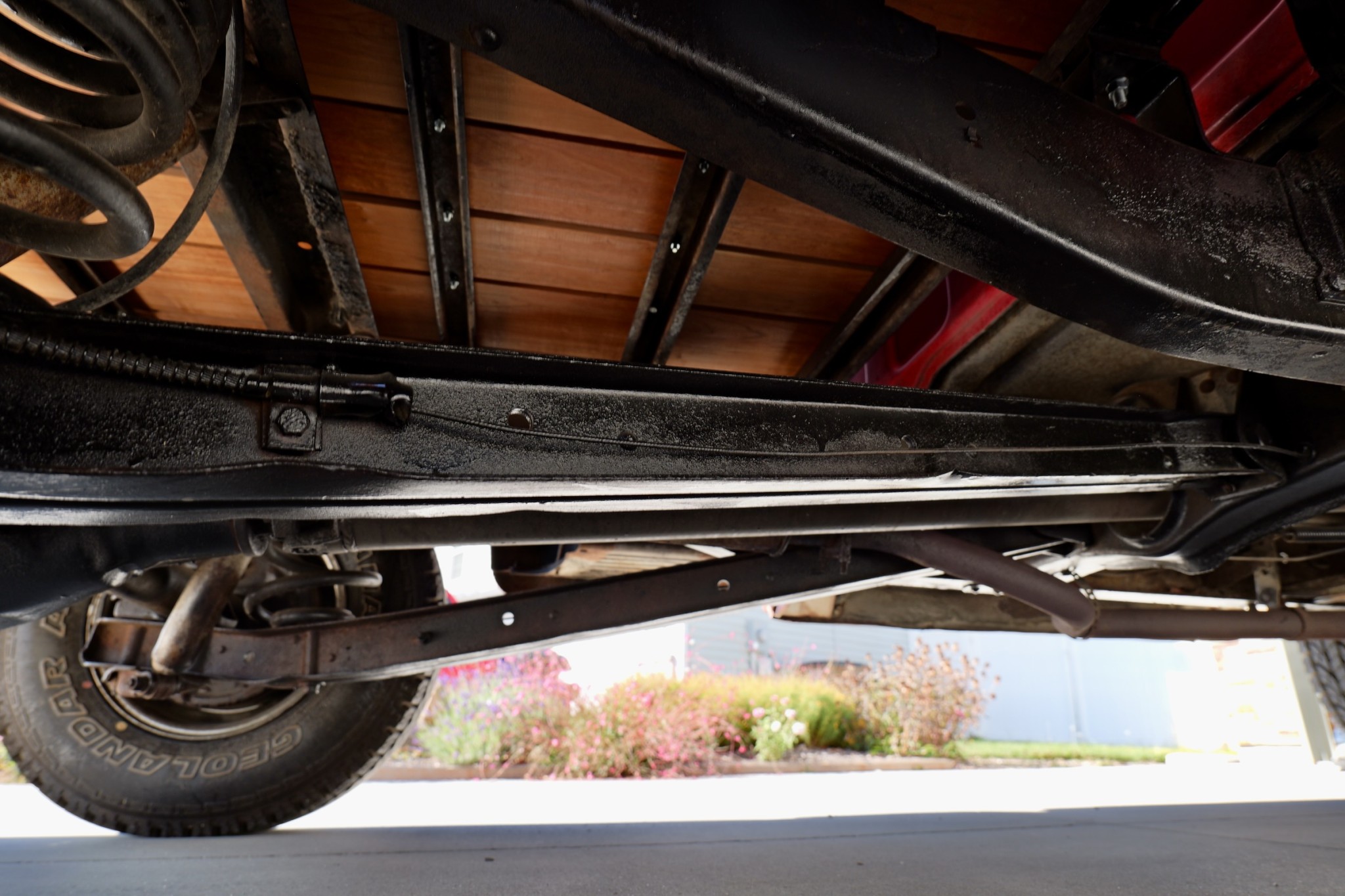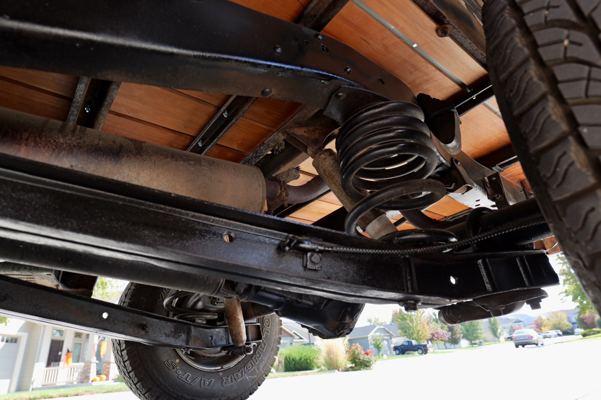 This truck’s only weakness is some rust in the front fenders and door bottoms. The cab corners and floors look to be in solid original condition. The seller replaced the wood in the truck bed with custom-cut cherry wood, which looks great. We didn’t find any signs of rust in the frame or bed structure.