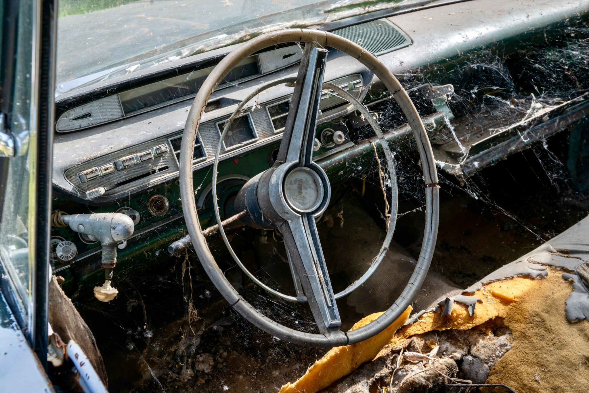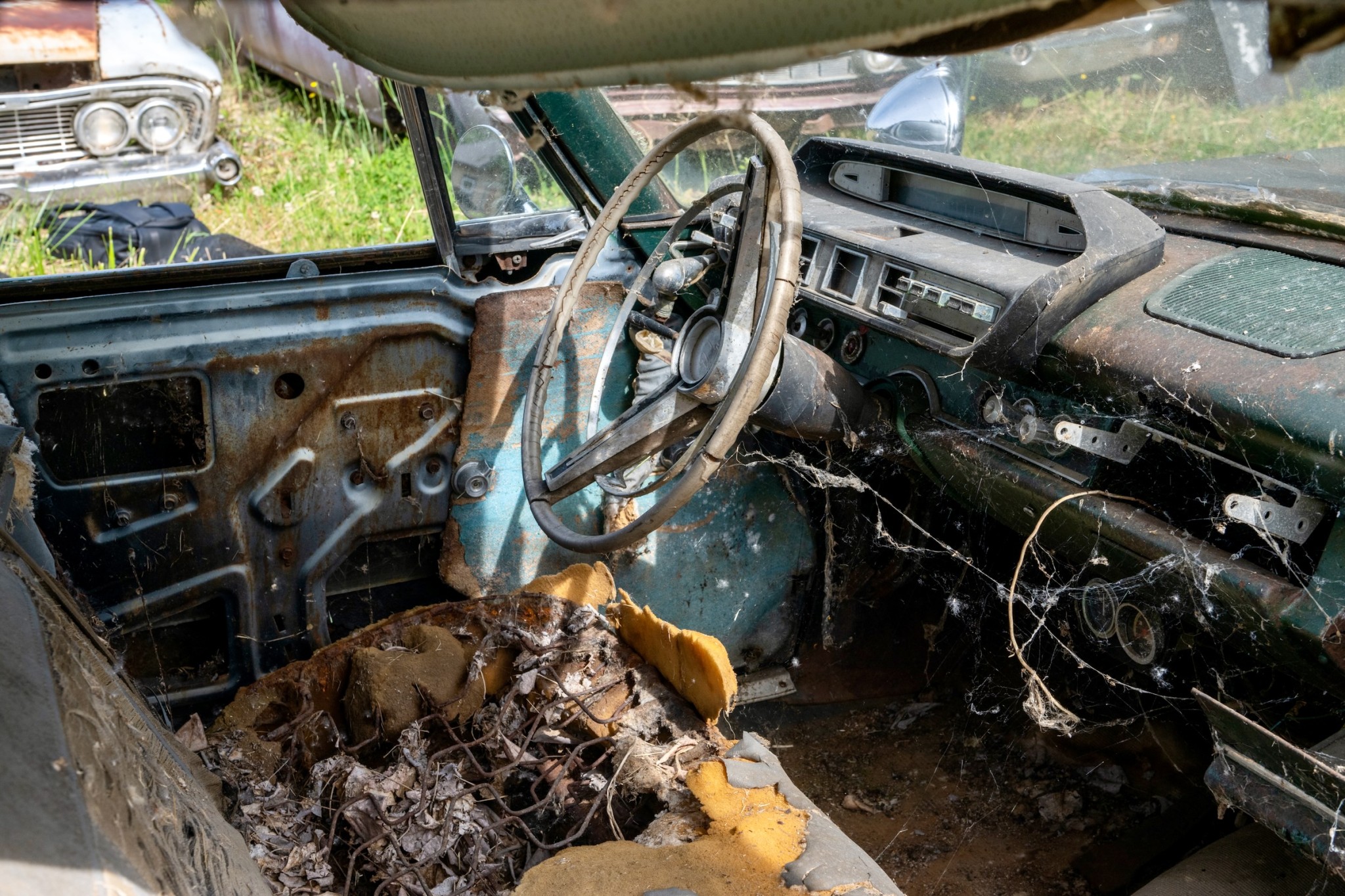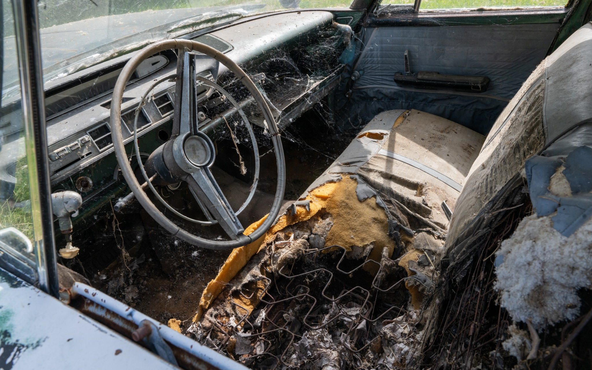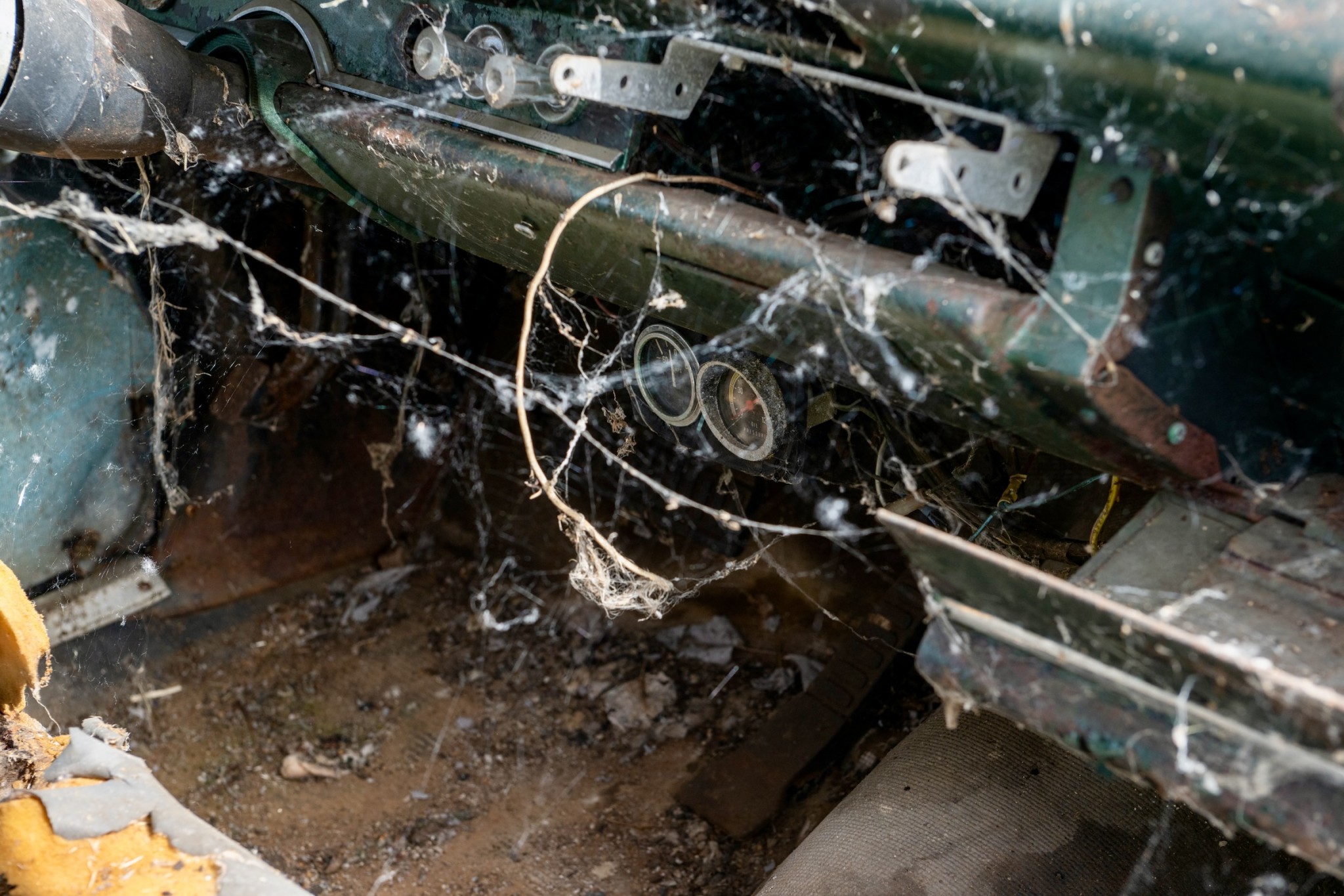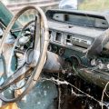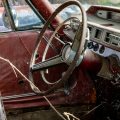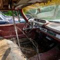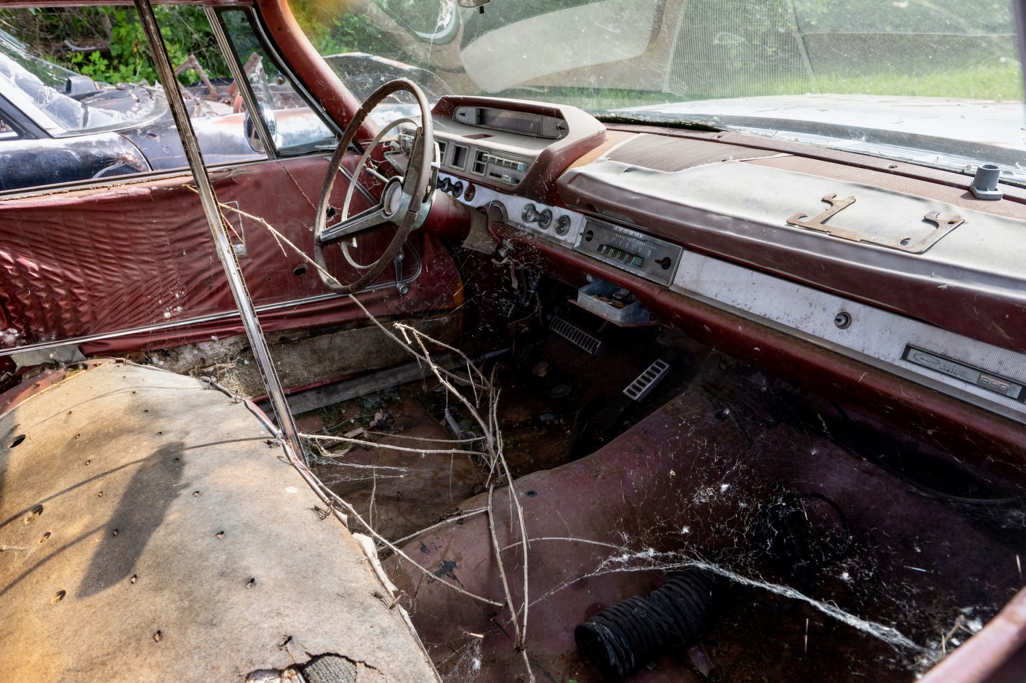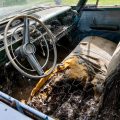 The interior of this 880 will need almost everything, but you can see that the car has spotlights and dashboard brackets that suggest that this car has seen some police duty.