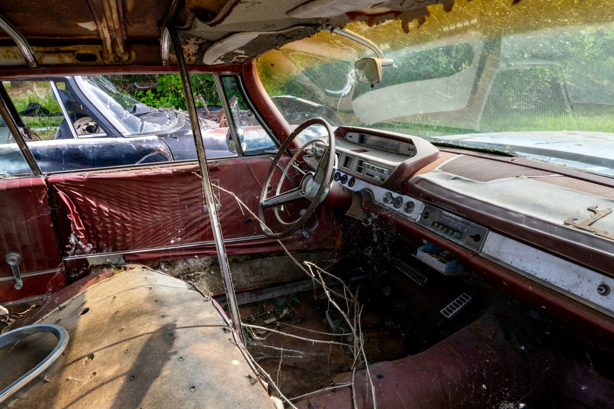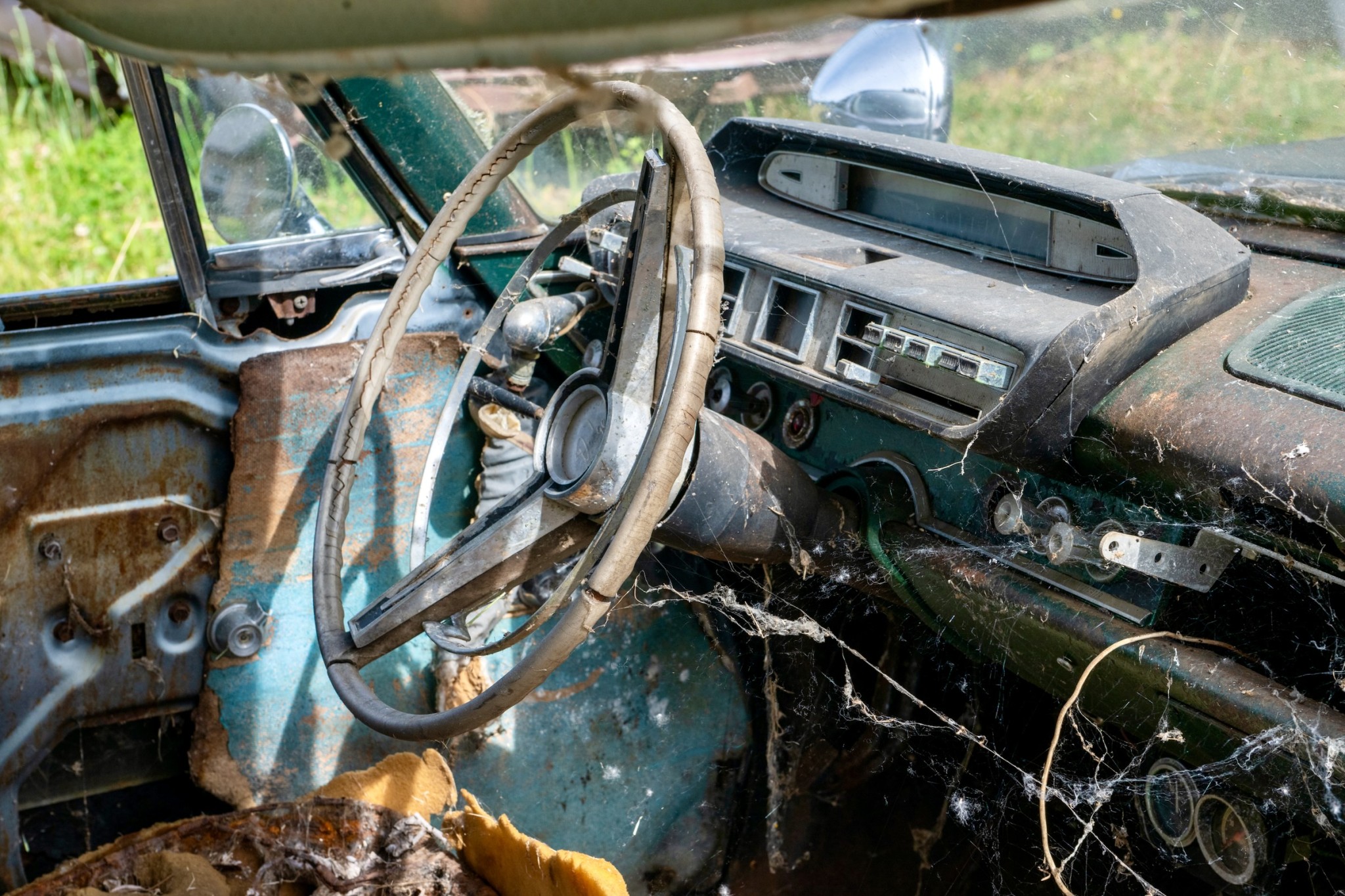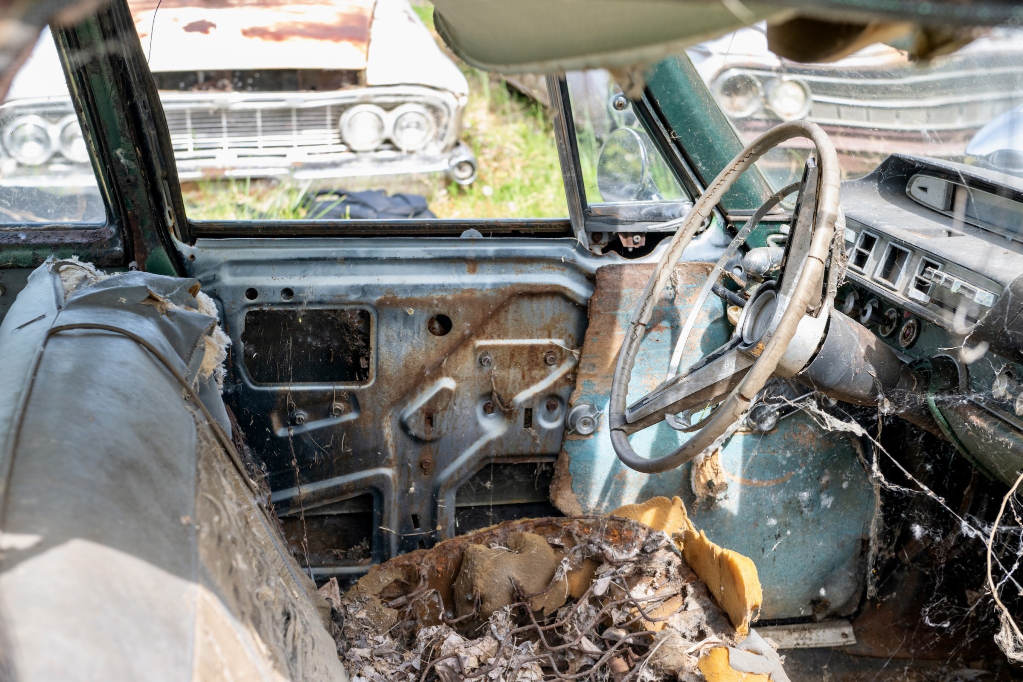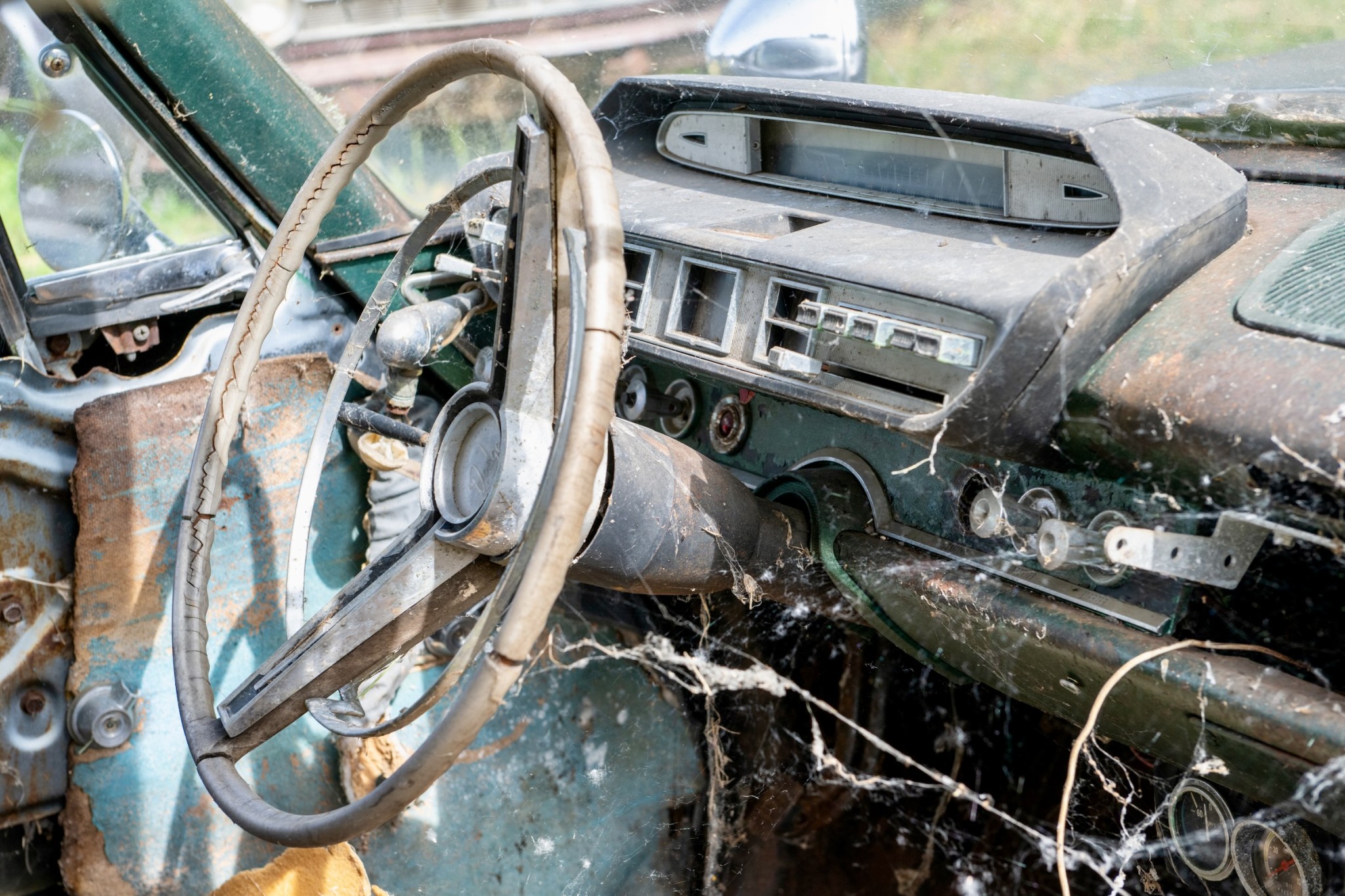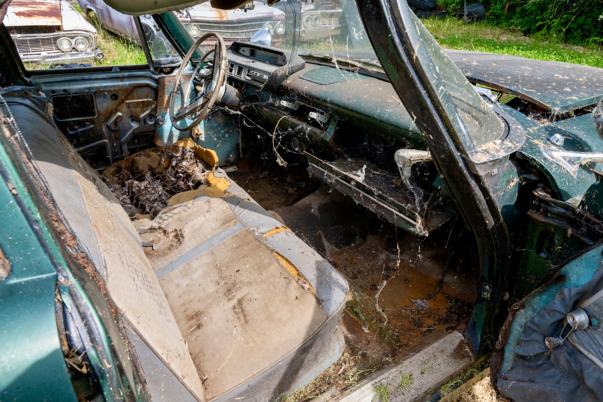 The interior of this 880 will need almost everything, but you can see that the car has spotlights and dashboard brackets that suggest that this car has seen some police duty.