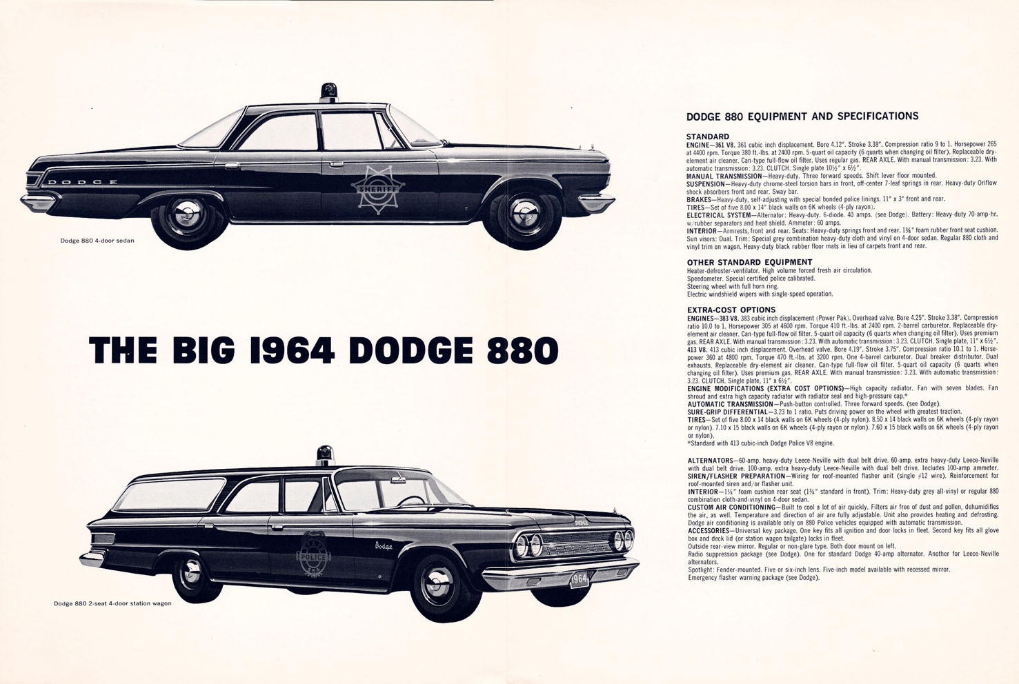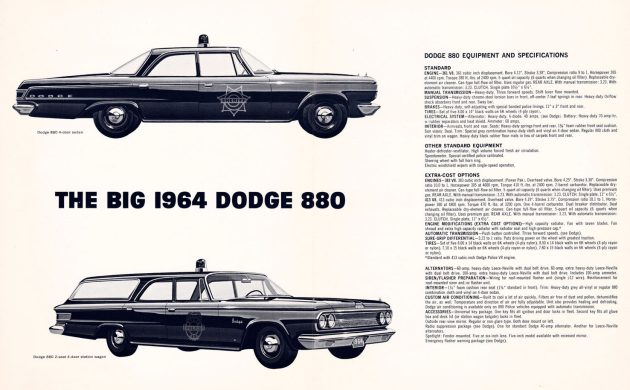 No they did not put the 426 wedge engine in the 64 Dodge’s. All Dodge 880s had either a 383 or the 413 Chrysler 300 solid lifter dual point ignition engine in them. I have two unmarked police cars both 64 Dodge 880s one I bought here in Michigan and the other one came out of Tennessee both 413 HP cars. I have all the brochures and all the options for those cars and the 426 was not an option. And had already shown its durability that’s why it was the engine that was used
