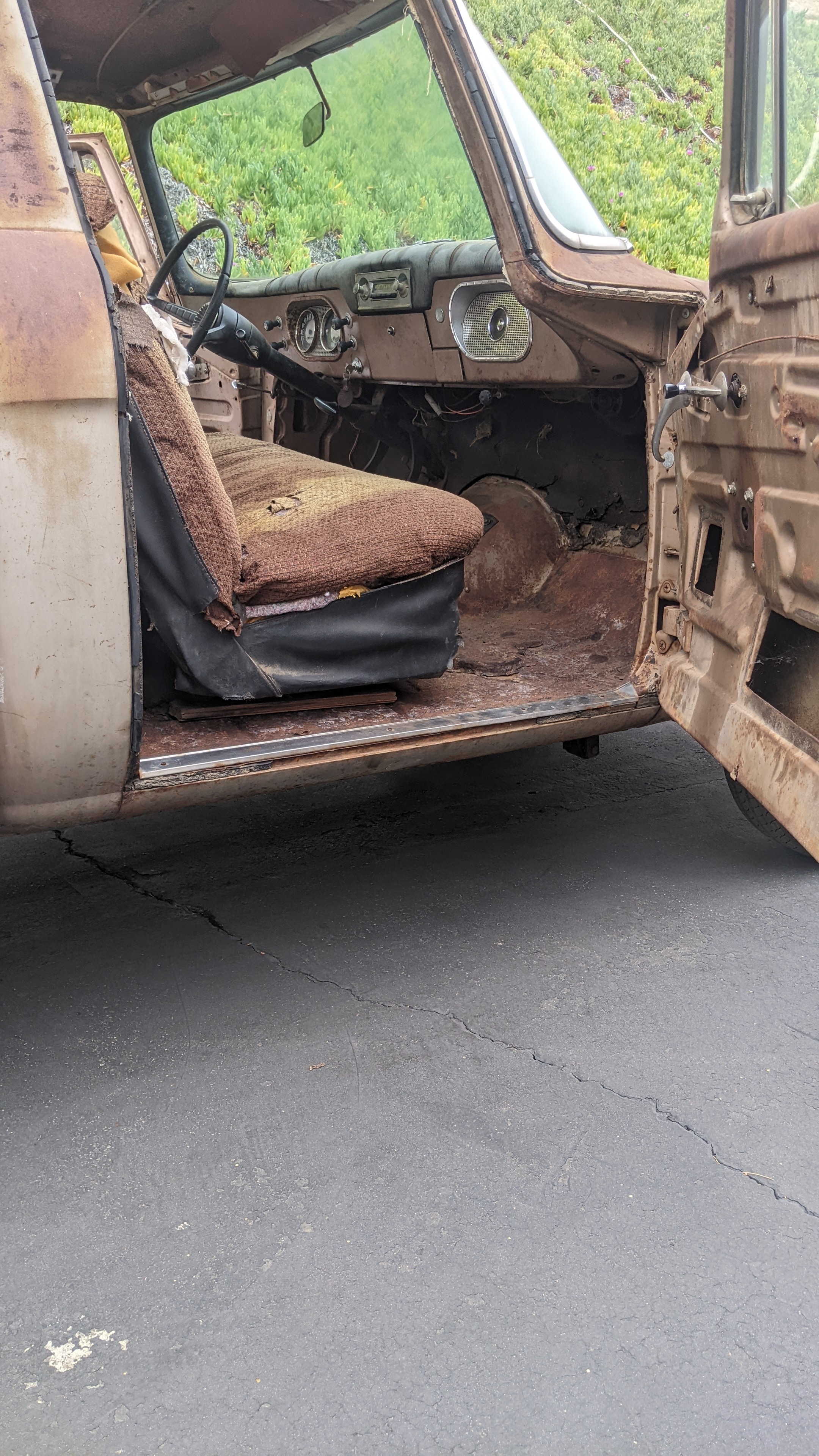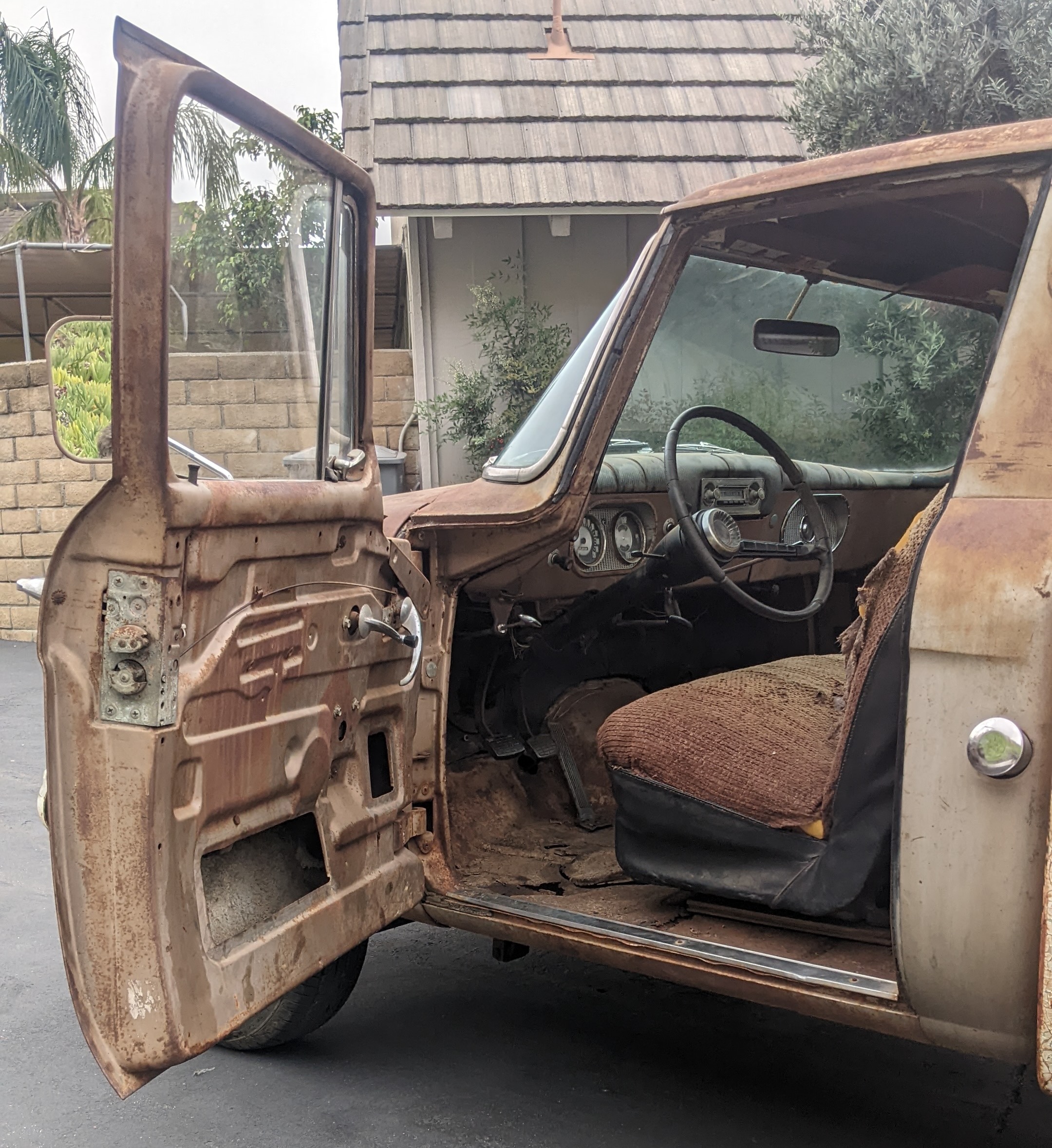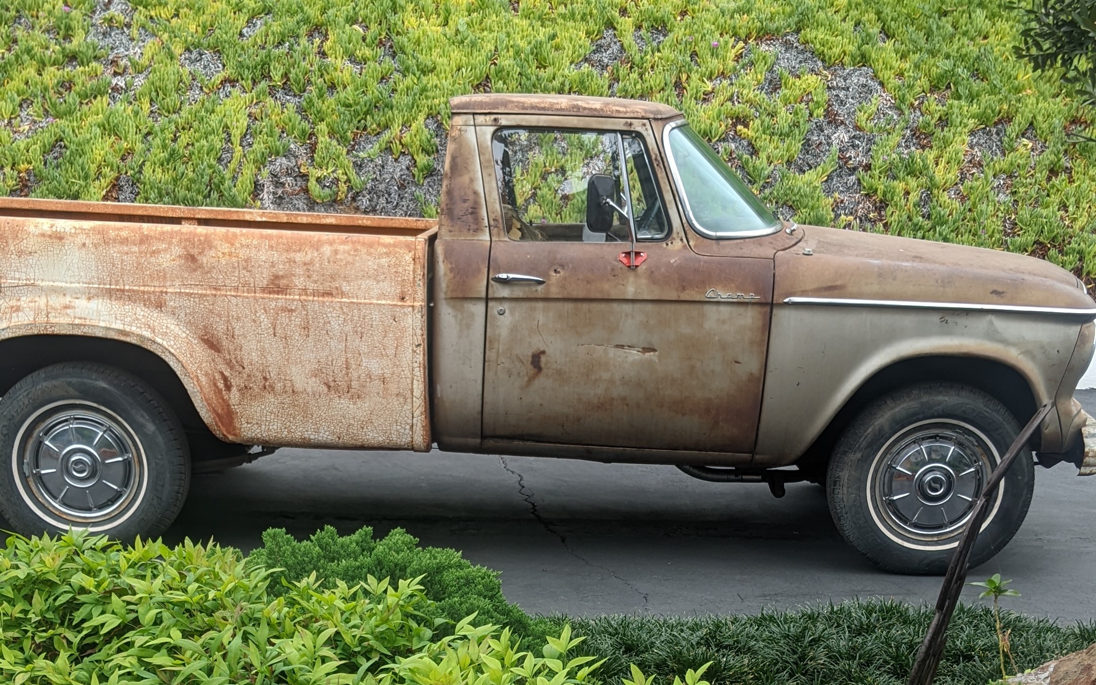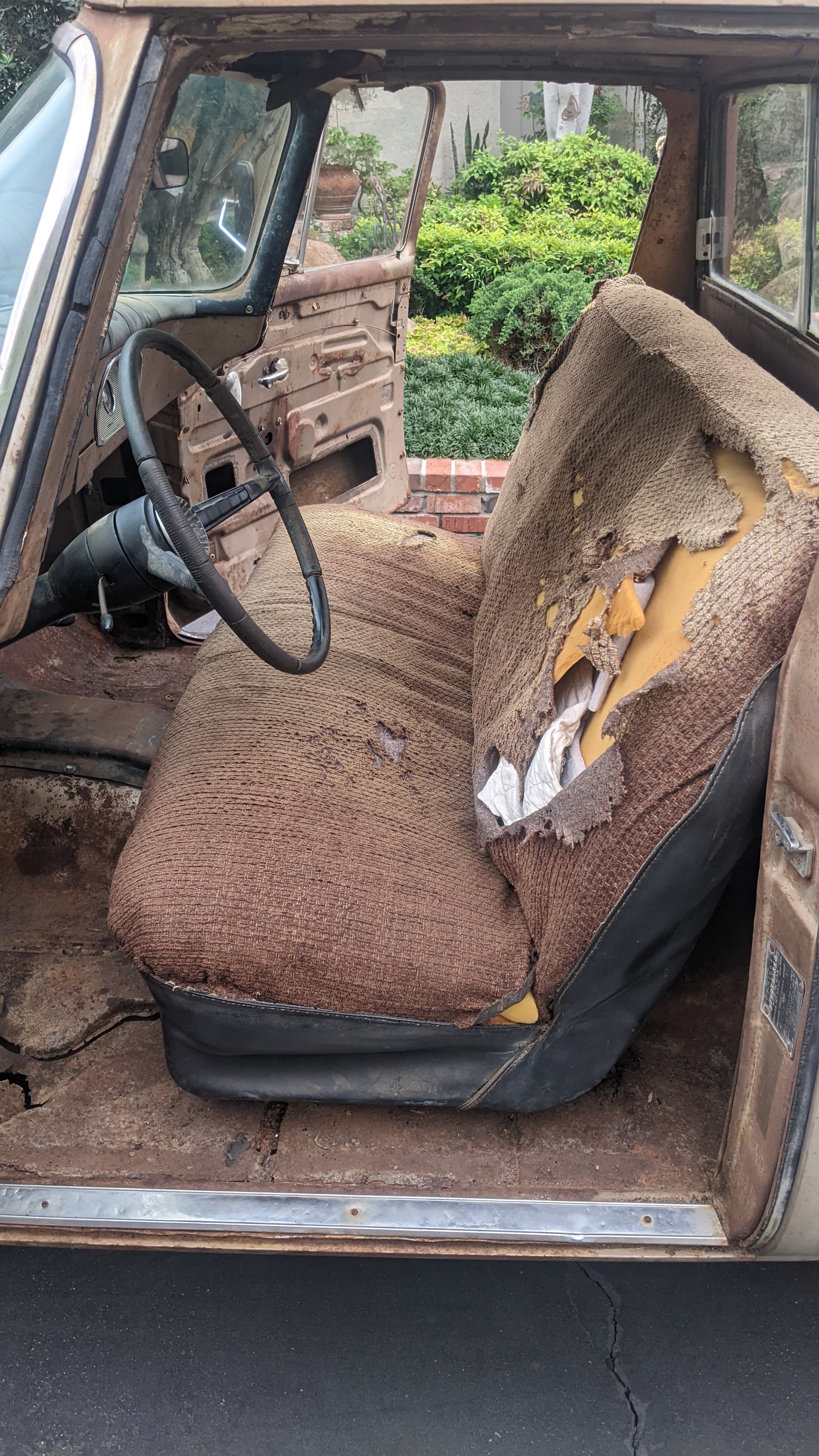 I’m almost certain we had a couch with similar fabric when I was a kid in the 1960s and 70s. I believe the paint color is Desert Tan or possibly Parchment White, or maybe the box/bed is white, and the cab is tan? It’s so faded that it’s hard to tell, and the seller doesn’t show a photo of a data plate, so it’s hard to know. The interior needs a lot of help. There are visible rust holes in the floor, and the seat and door panels are pretty much gone. This truck has a three-speed manual with a column shifter, but a four-speed would have been available, along with a BorgWarner automatic.