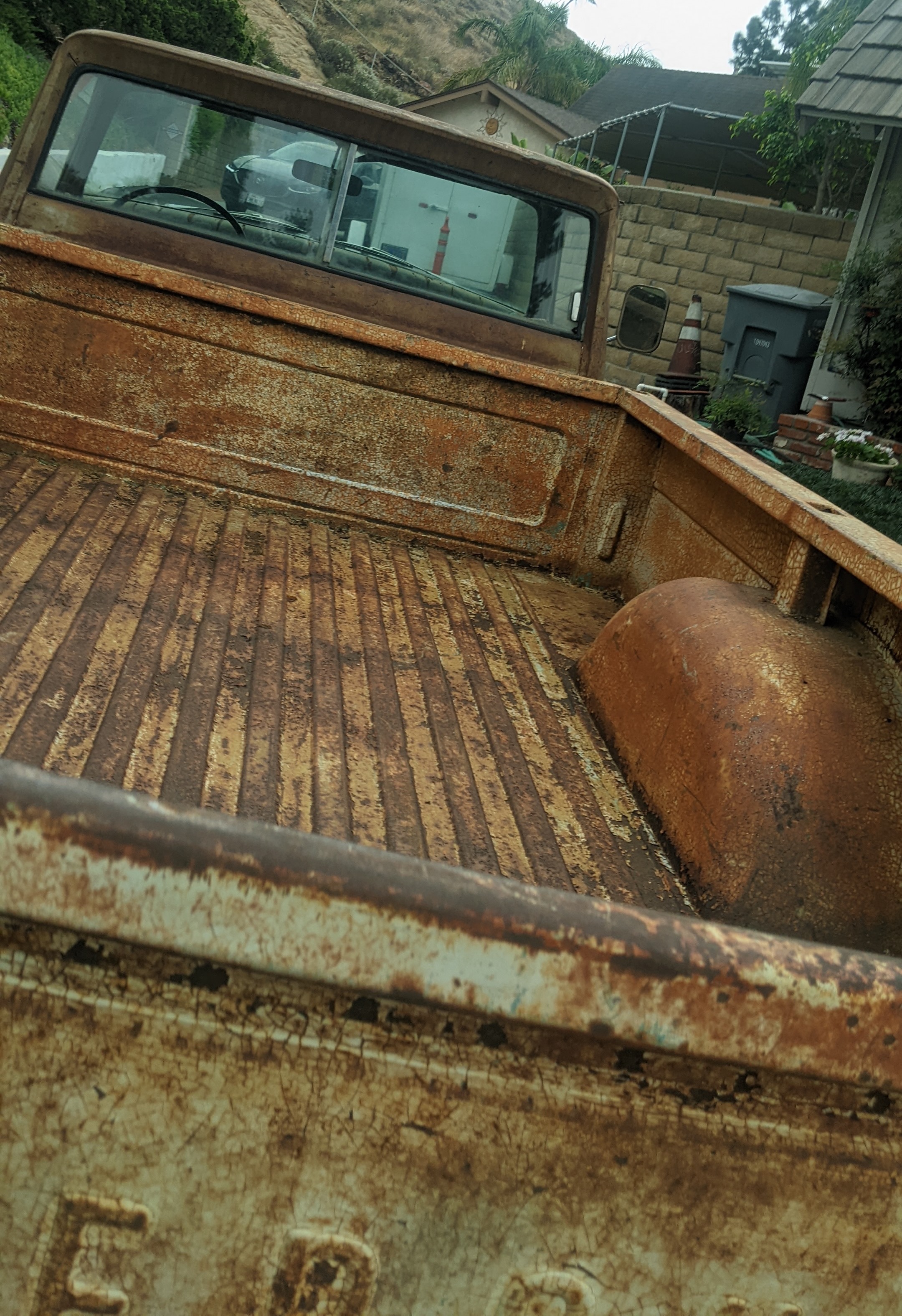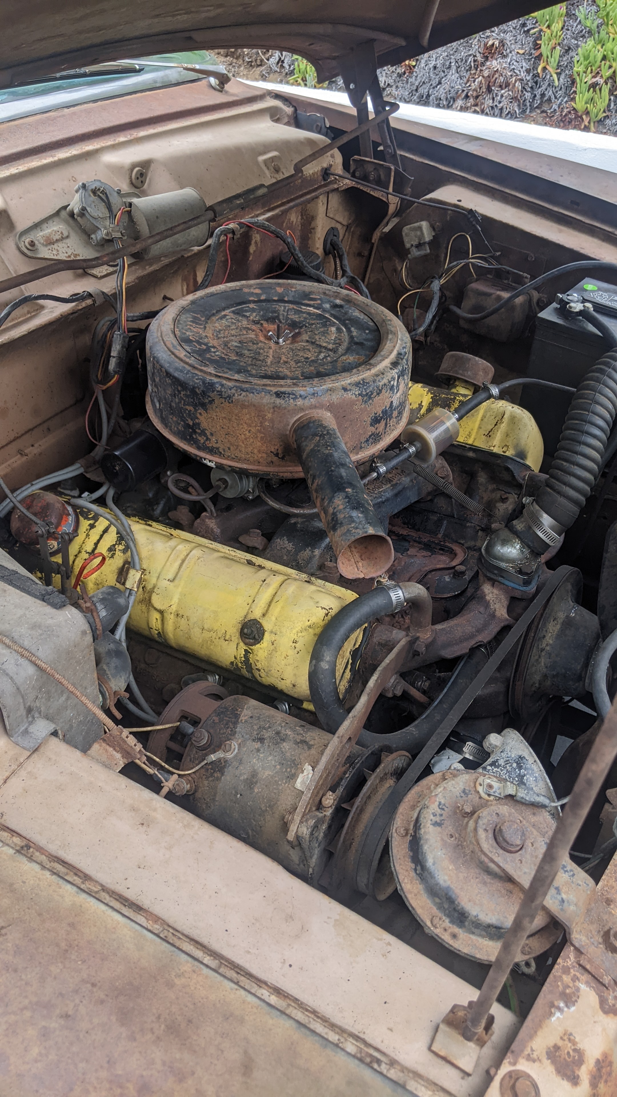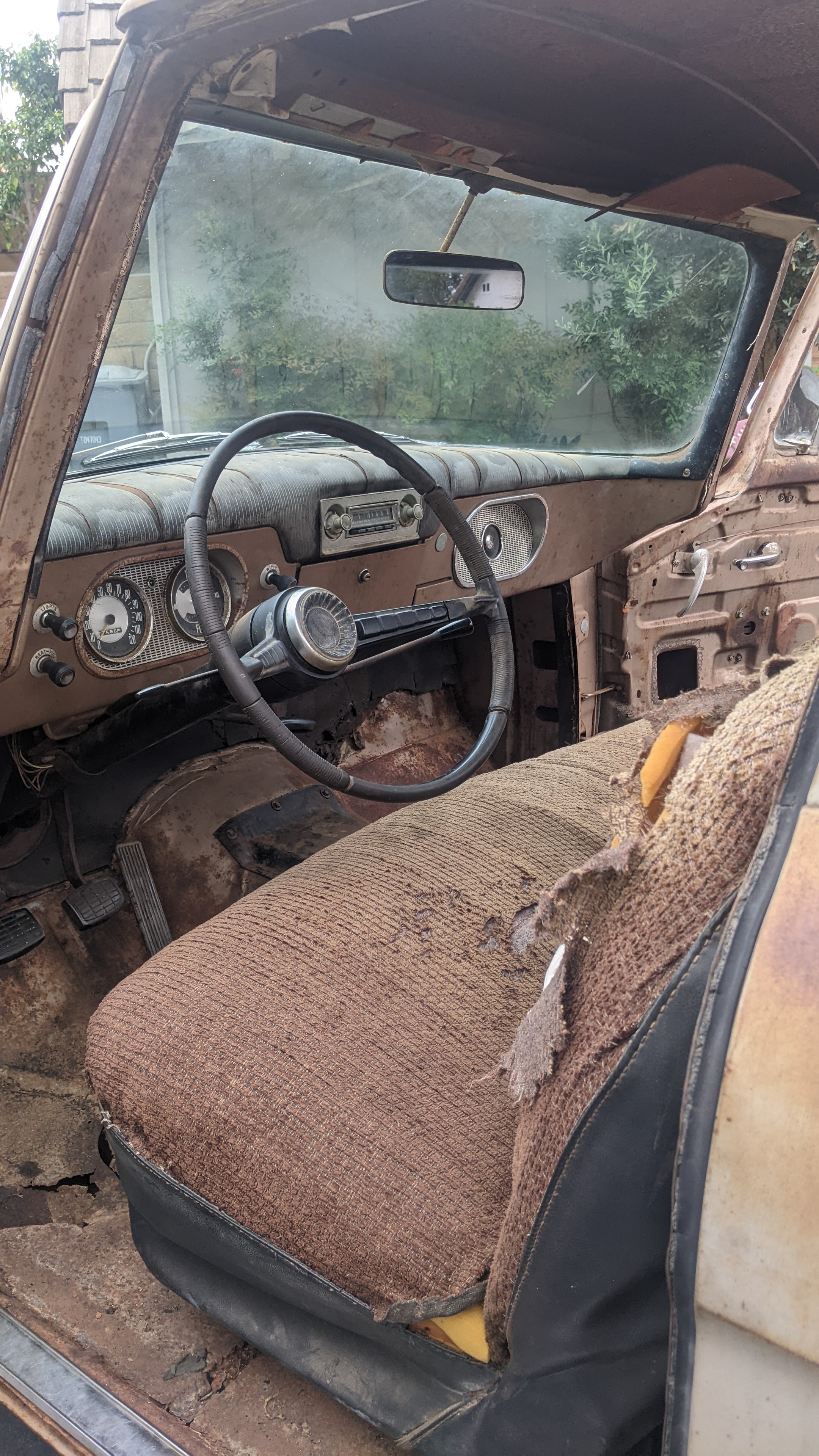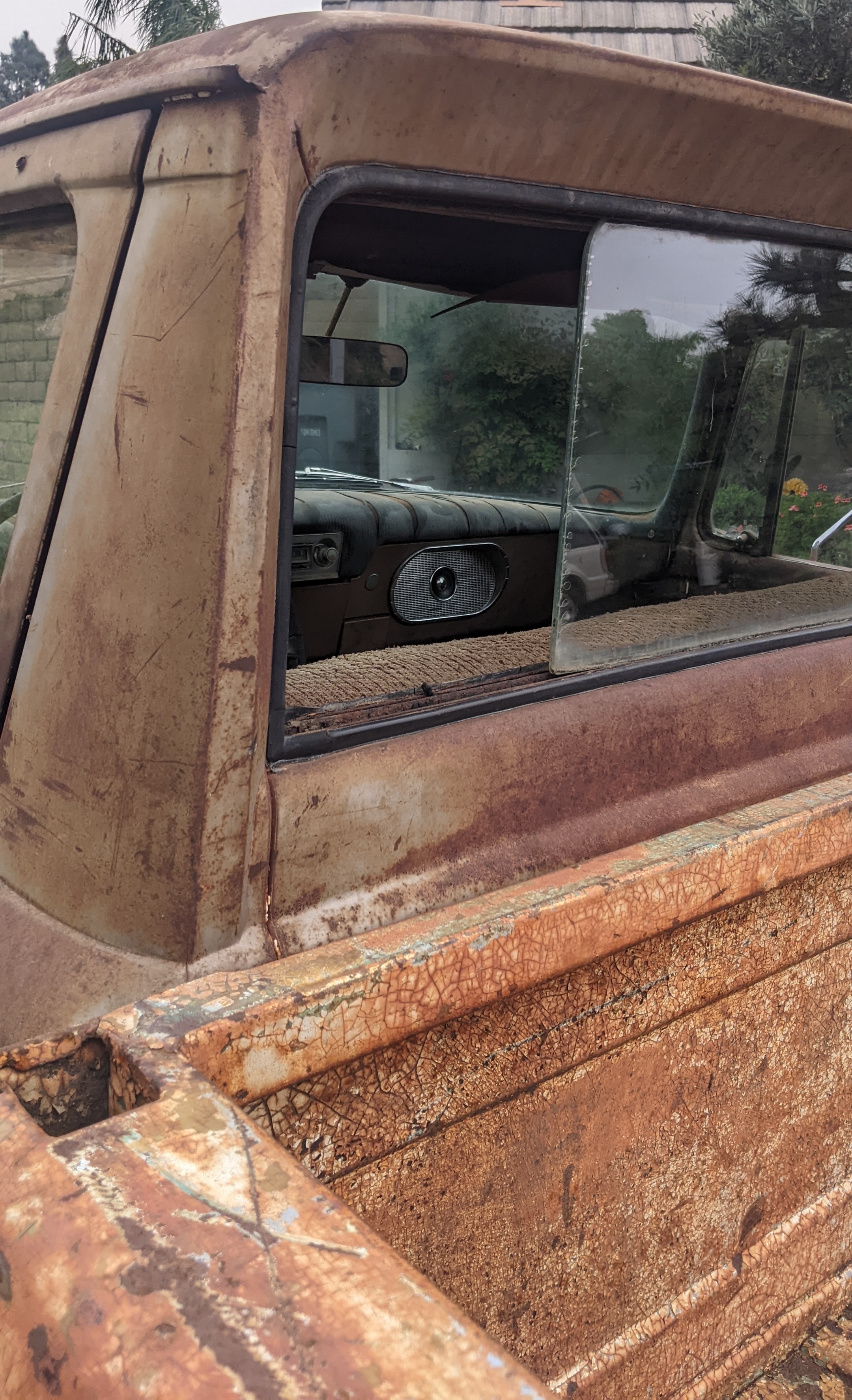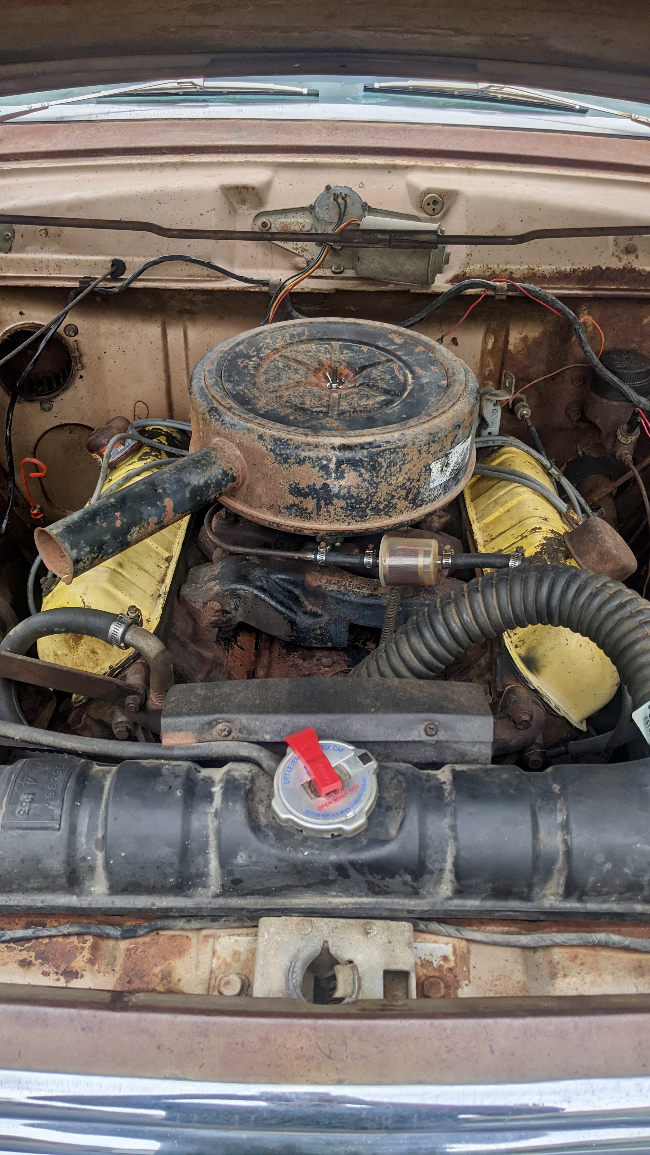 I’m almost certain we had a couch with similar fabric when I was a kid in the 1960s and 70s. I believe the paint color is Desert Tan or possibly Parchment White, or maybe the box/bed is white, and the cab is tan? It’s so faded that it’s hard to tell, and the seller doesn’t show a photo of a data plate, so it’s hard to know. The interior needs a lot of help. There are visible rust holes in the floor, and the seat and door panels are pretty much gone. This truck has a three-speed manual with a column shifter, but a four-speed would have been available, along with a BorgWarner automatic.