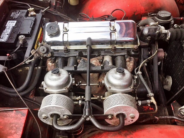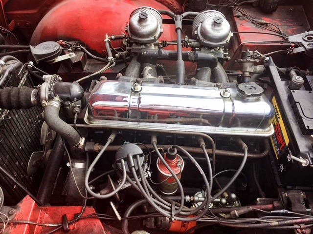 I owned a TR4A which had the dual Strombergs, and the live rear axle. (yes, some TR4A models did have the live axle instead of IRS). I owned it for less than a year, bought and sold in Greensboro NC. I ported the head and reworked the rockers to get a little more lift. Likewise the under carriage was oil sprayed, but that was because it could have used new rings and those slinger rear main seals cannot fight much blow-by. What looks different to me is the valve cover vent into the air cleaners. Mine vented into a port on the manifold balance tube. They are a lot of fun, great low end torque. However that car turned me into a hater of wire wheels.. heavy, and expensive to rebuild if needed (granted mine were abused before I bought it).
