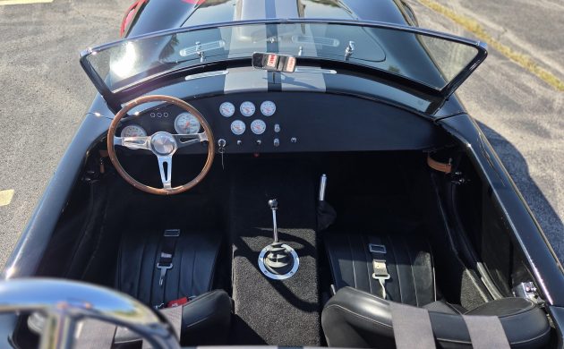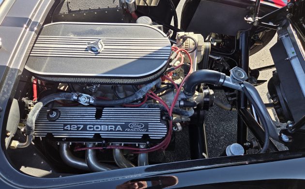 Tilting the hood forward reveals a 427ci V8. It inhales deeply through a Holley 750cfm Ultra Double Pumper carburetor, while the Hyfire electronic ignition delivers a strong spark to ignite the mixture. The spent gases exit via stainless steel headers and a matching dual side exhaust, and an aluminum radiator effectively controls the V8’s temperature. The power feeds to an 8.8″ Ford rear end via a five-speed Tremec manual transmission. Combine the car’s low curb weight with a mountain of power and torque, and this Mk 4 will command respect wherever it goes. It is a complete package, featuring tubular suspension arms, adjustable coil-overs on all corners, and legendary Wilwood disc brakes. There is no doubt that this Cobra possesses the handling and stopping power to match its engine performance.