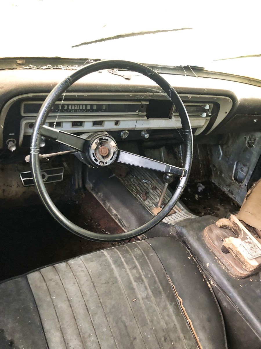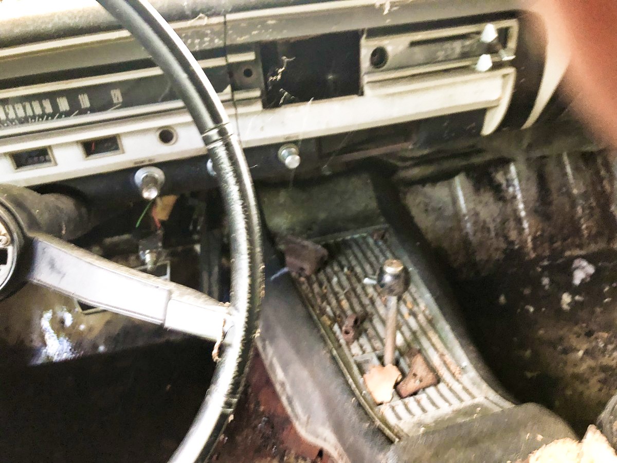 His brother had also pulled most of the interior out, so Dan found a set of bucket seats out of a Falcon. Much of the interior was gone when he got the car, but the backseat is currently in his barn’s rafters and comes with the car. Other than that, what you see is what you get.