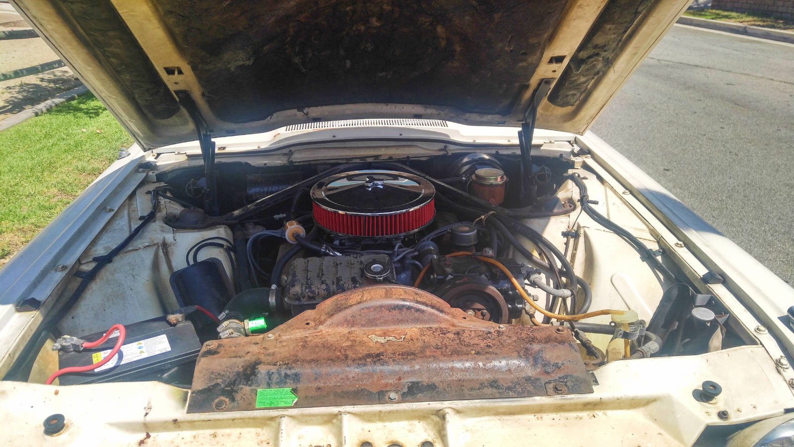 Judging by the condition under the hood and on the firewall, other than the fan shroud, there’s not a lot of rust on this car, it would be showing at all of the seams where panels overlap and hold moisture. The factory undercoating was good on these, mine never had any rust, the torque box construction of these bodies was super strong with heavy gauge steel.