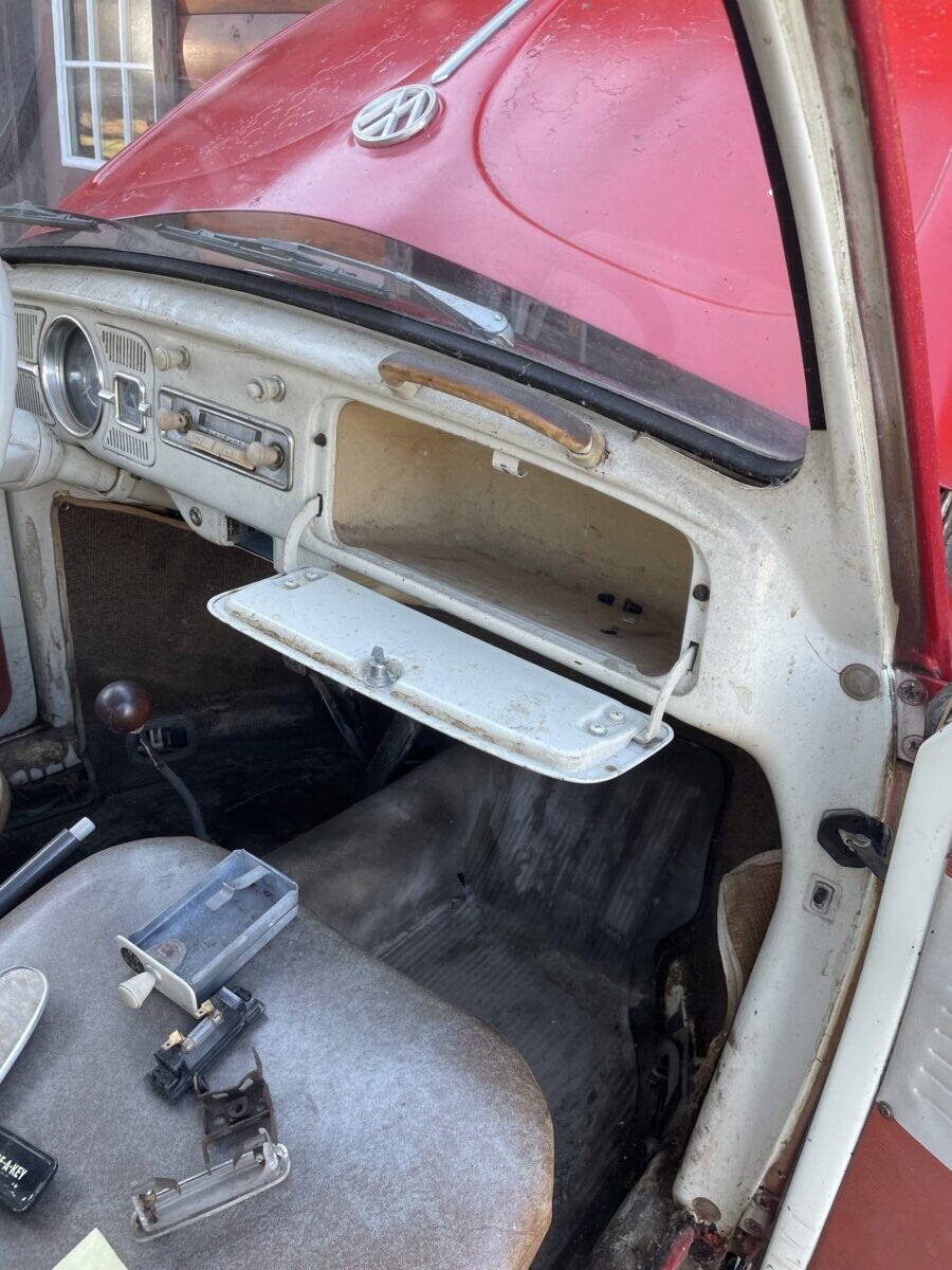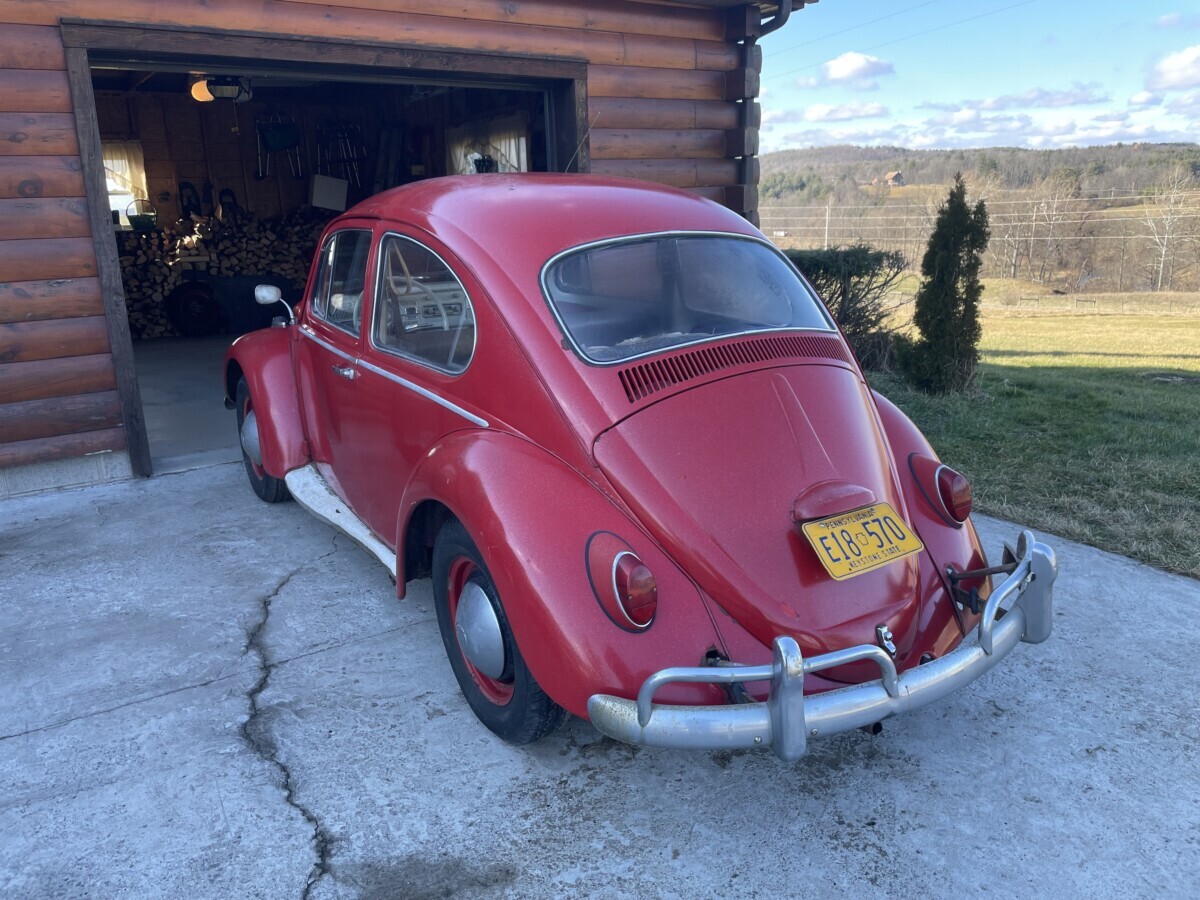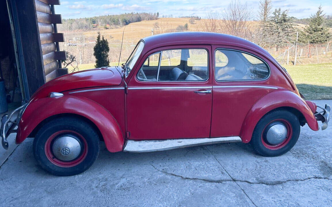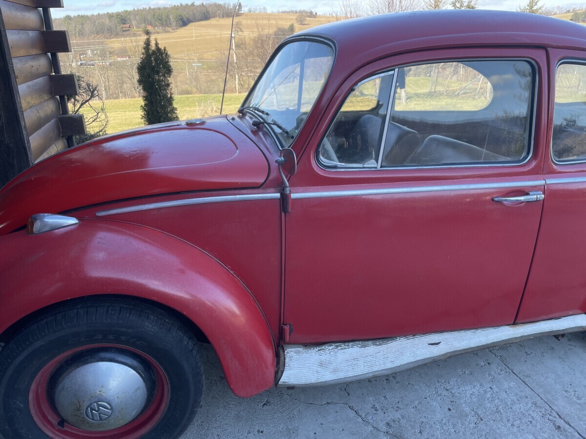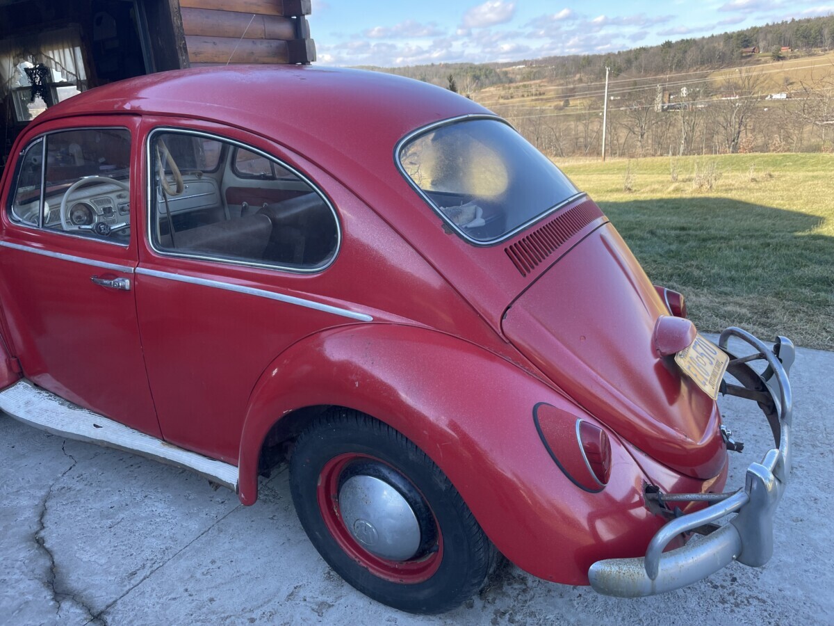 The seller’s family has quite a bit of history with this Bug. His aunt purchased it in 1967 with just 2k miles on the odometer. She drove it while she lived in California. In 1971, she gave it to the seller’s father, at that point it was showing 61k miles. It was then stored in his dad’s body shop until 1980 when the seller turned 16. At some point in the car’s past, it had been backed into, leaving a dent in the passenger side door. So, he and his brother decided to fix it up and make it a driver again. A replacement door was installed from another car, other dents were repaired, and the car was painted bright red and clear coated with metallic flake. It was driven off and on until 1983 when it went back into his father’s body shop and was stored there until the ’90s. Around this time, his dad retired so the Beetle was moved to the family barn, where it’s stayed ever since.