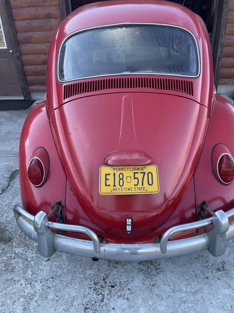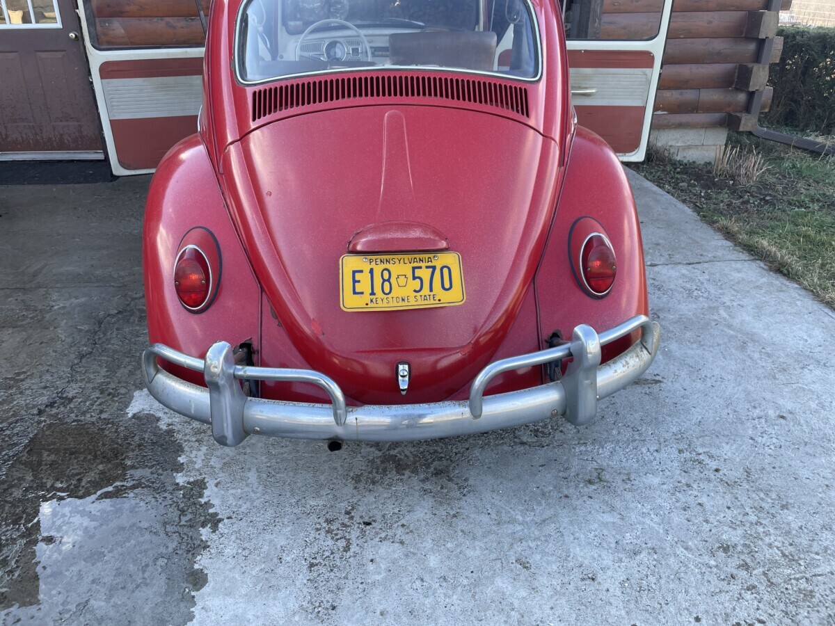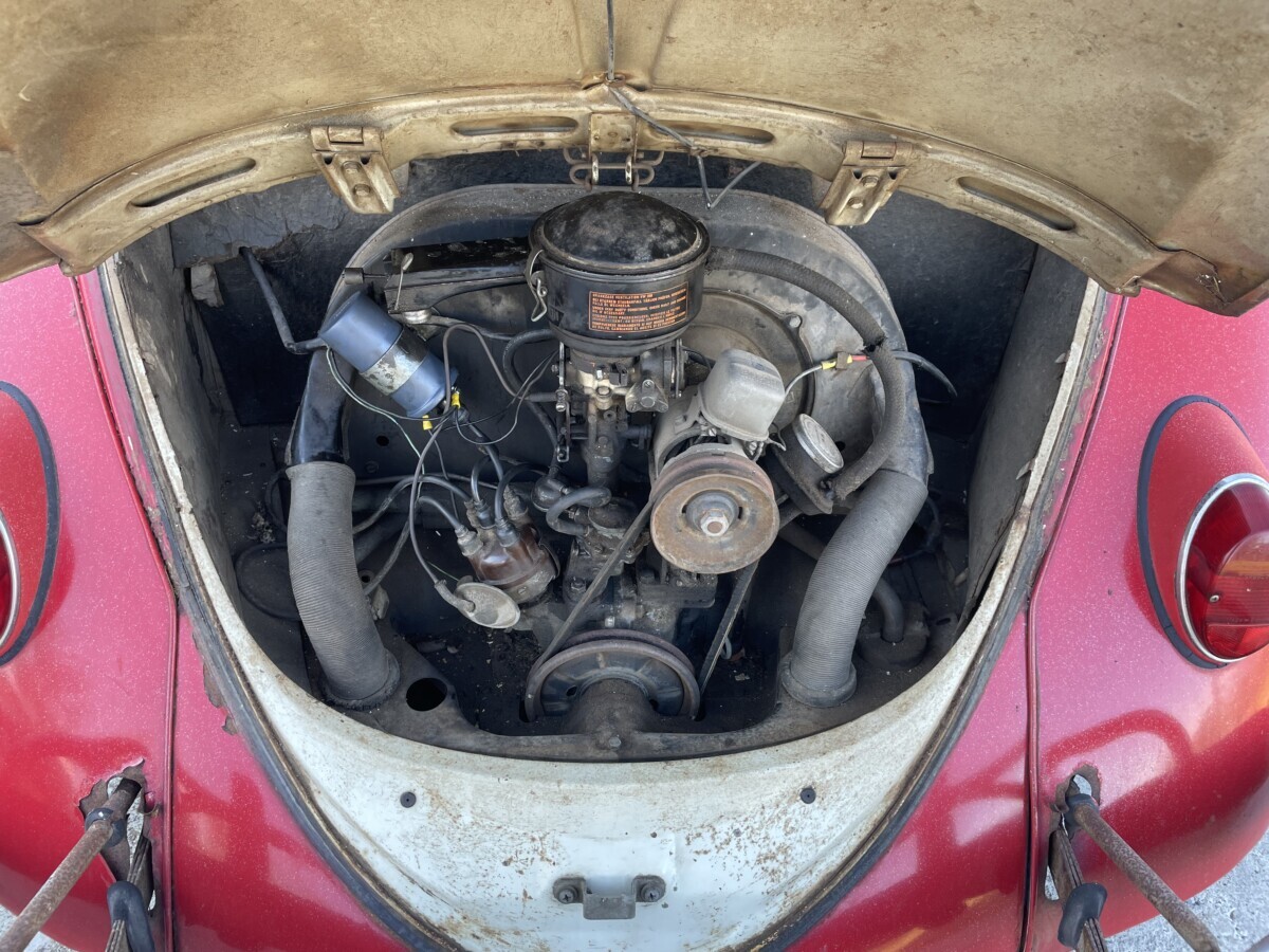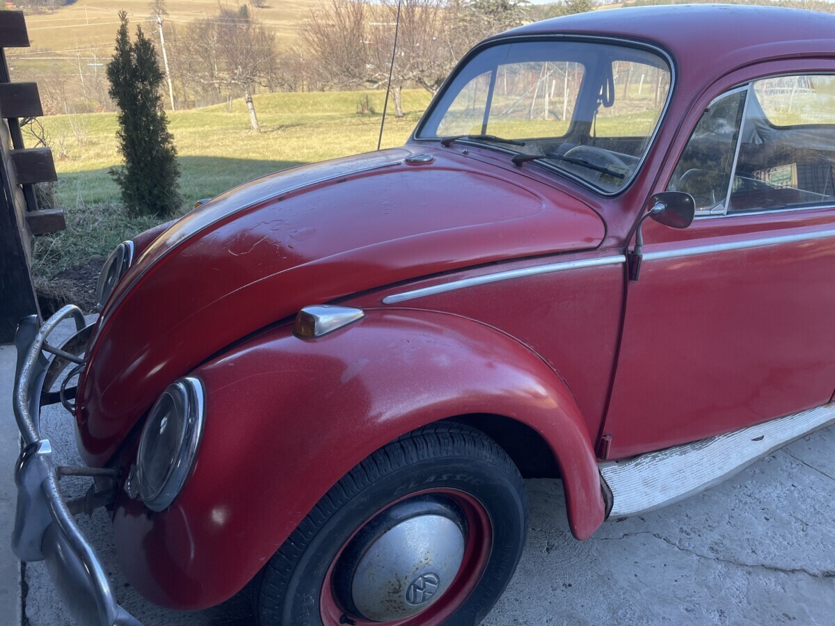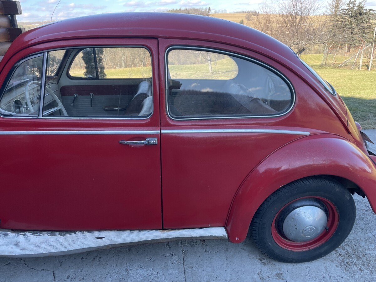 The seller’s family has quite a bit of history with this Bug. His aunt purchased it in 1967 with just 2k miles on the odometer. She drove it while she lived in California. In 1971, she gave it to the seller’s father, at that point it was showing 61k miles. It was then stored in his dad’s body shop until 1980 when the seller turned 16. At some point in the car’s past, it had been backed into, leaving a dent in the passenger side door. So, he and his brother decided to fix it up and make it a driver again. A replacement door was installed from another car, other dents were repaired, and the car was painted bright red and clear coated with metallic flake. It was driven off and on until 1983 when it went back into his father’s body shop and was stored there until the ’90s. Around this time, his dad retired so the Beetle was moved to the family barn, where it’s stayed ever since.