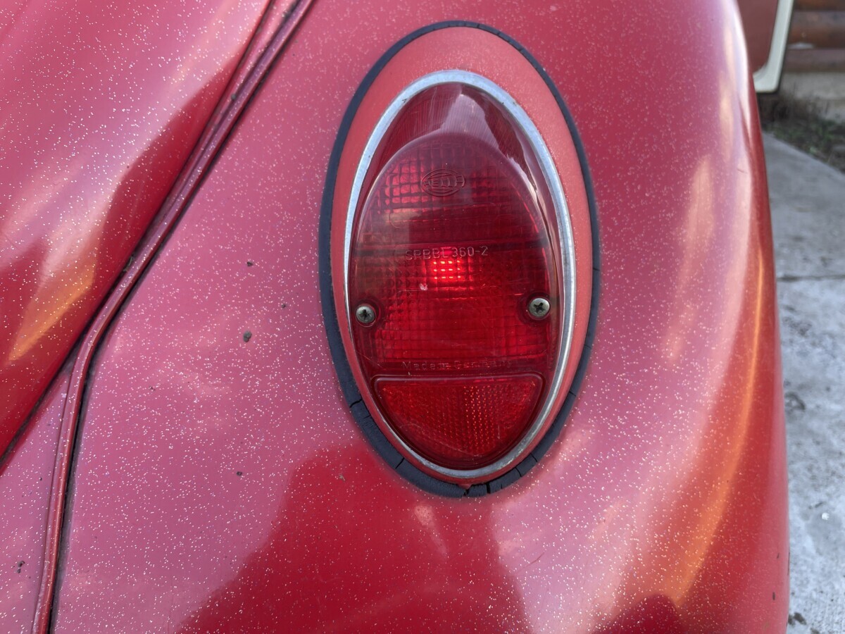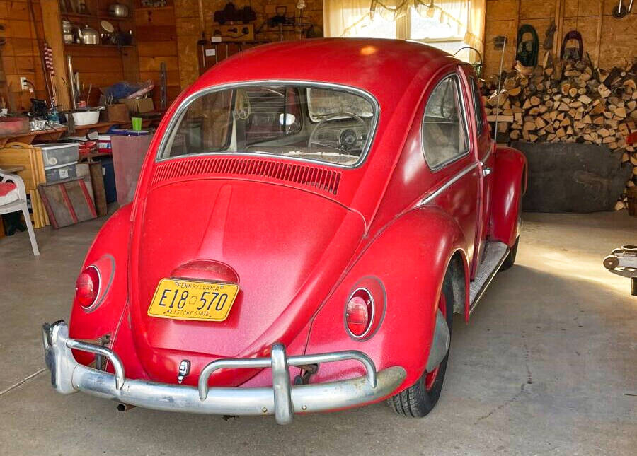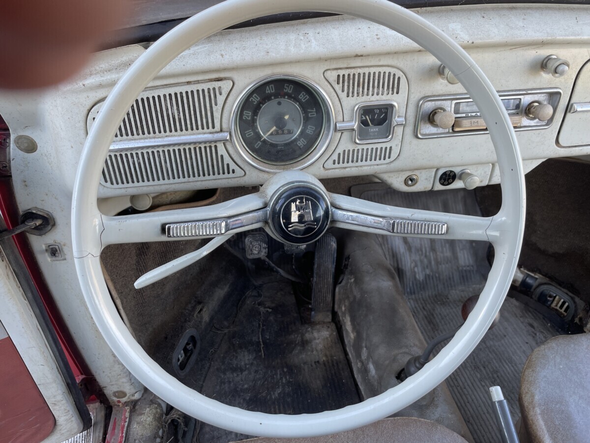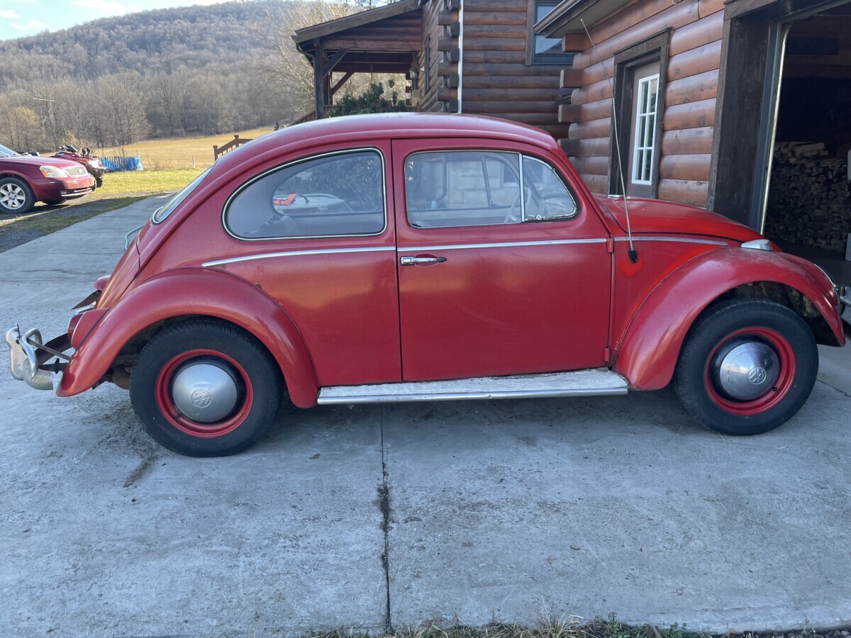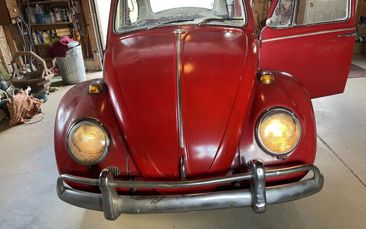 The seller’s family has quite a bit of history with this Bug. His aunt purchased it in 1967 with just 2k miles on the odometer. She drove it while she lived in California. In 1971, she gave it to the seller’s father, at that point it was showing 61k miles. It was then stored in his dad’s body shop until 1980 when the seller turned 16. At some point in the car’s past, it had been backed into, leaving a dent in the passenger side door. So, he and his brother decided to fix it up and make it a driver again. A replacement door was installed from another car, other dents were repaired, and the car was painted bright red and clear coated with metallic flake. It was driven off and on until 1983 when it went back into his father’s body shop and was stored there until the ’90s. Around this time, his dad retired so the Beetle was moved to the family barn, where it’s stayed ever since.