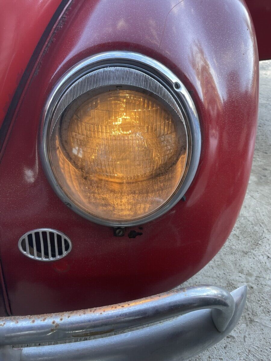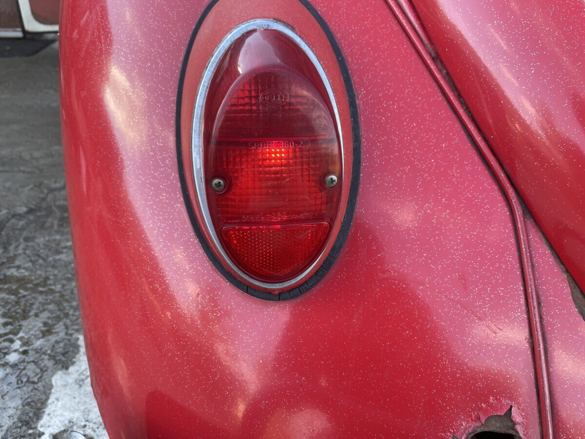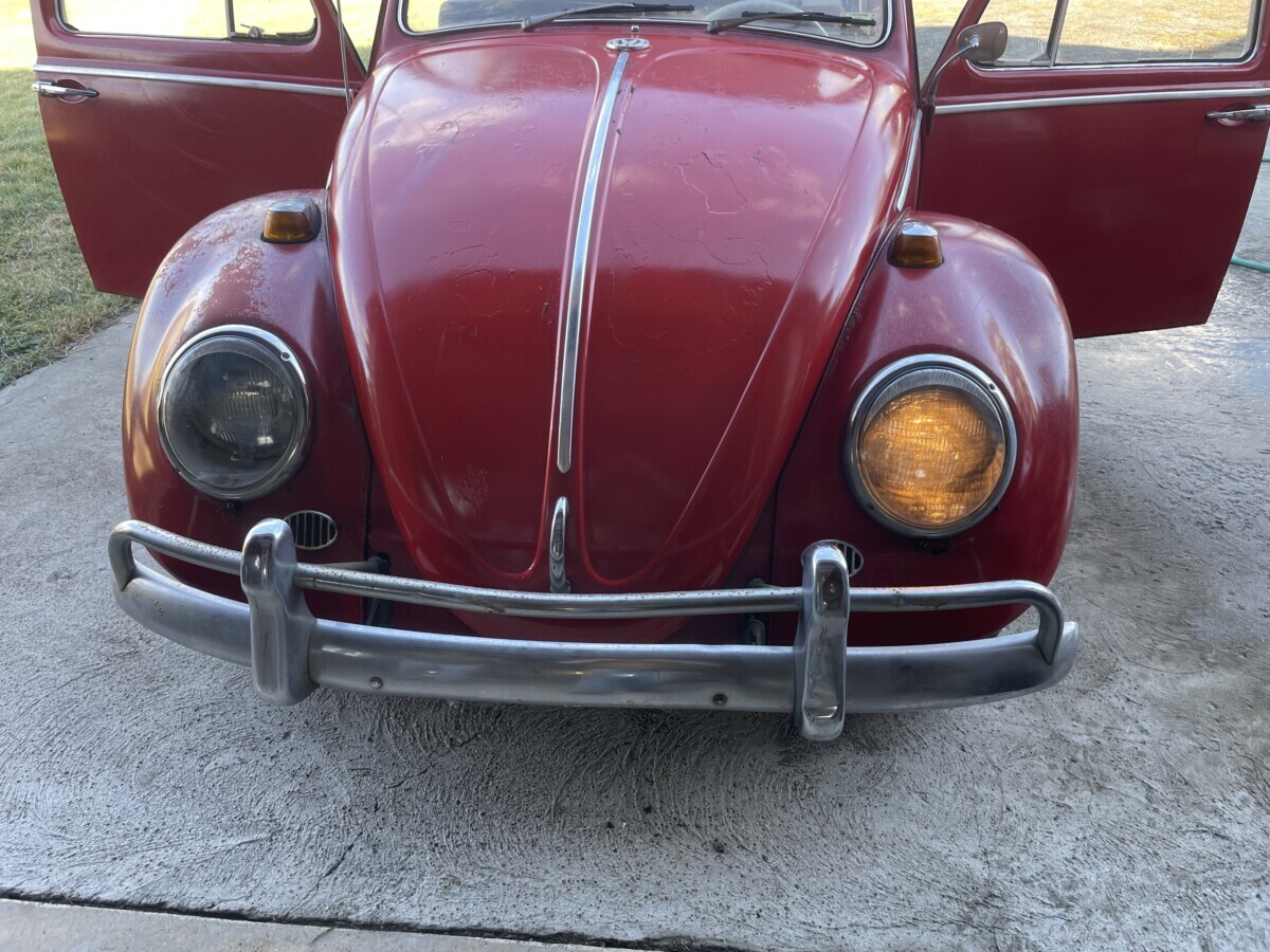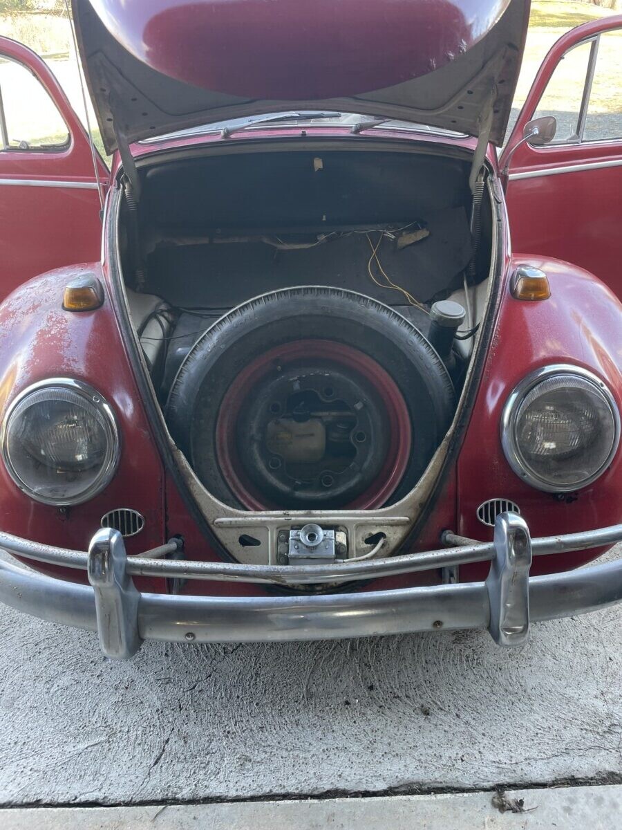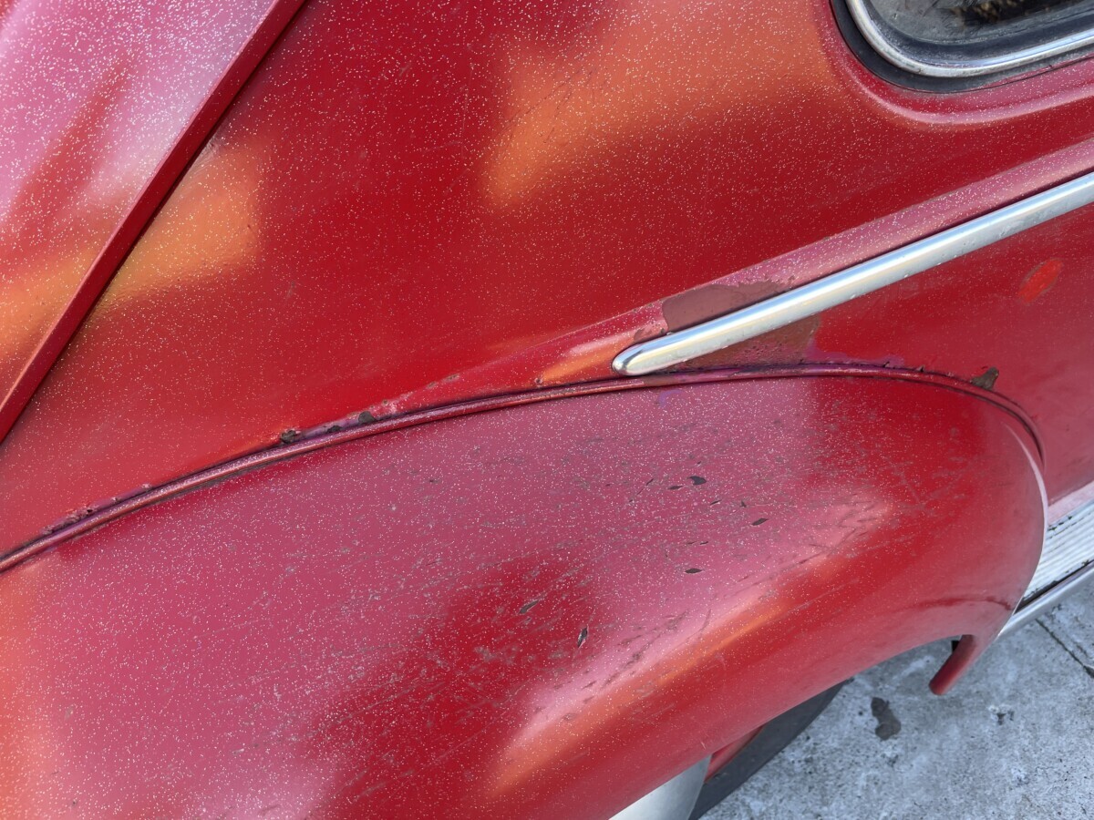 The seller’s family has quite a bit of history with this Bug. His aunt purchased it in 1967 with just 2k miles on the odometer. She drove it while she lived in California. In 1971, she gave it to the seller’s father, at that point it was showing 61k miles. It was then stored in his dad’s body shop until 1980 when the seller turned 16. At some point in the car’s past, it had been backed into, leaving a dent in the passenger side door. So, he and his brother decided to fix it up and make it a driver again. A replacement door was installed from another car, other dents were repaired, and the car was painted bright red and clear coated with metallic flake. It was driven off and on until 1983 when it went back into his father’s body shop and was stored there until the ’90s. Around this time, his dad retired so the Beetle was moved to the family barn, where it’s stayed ever since.