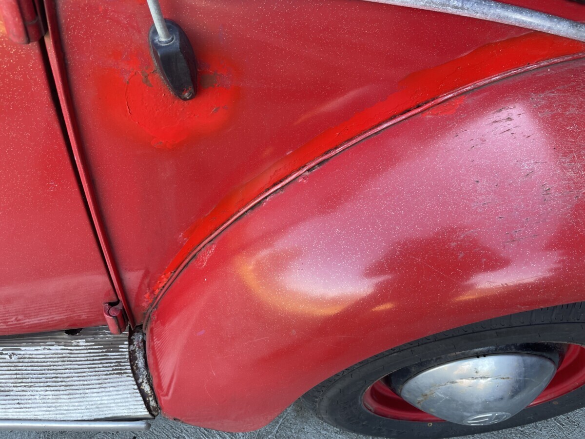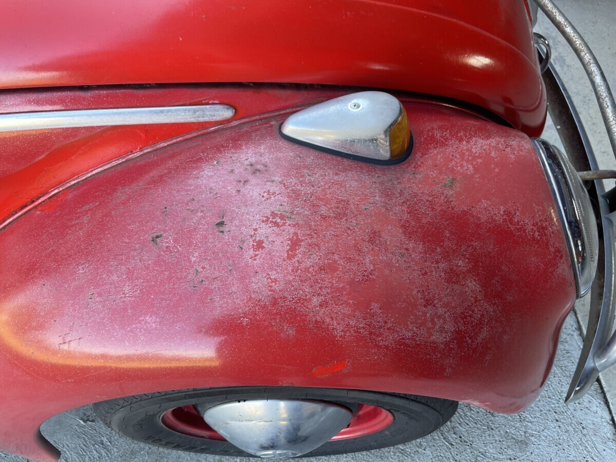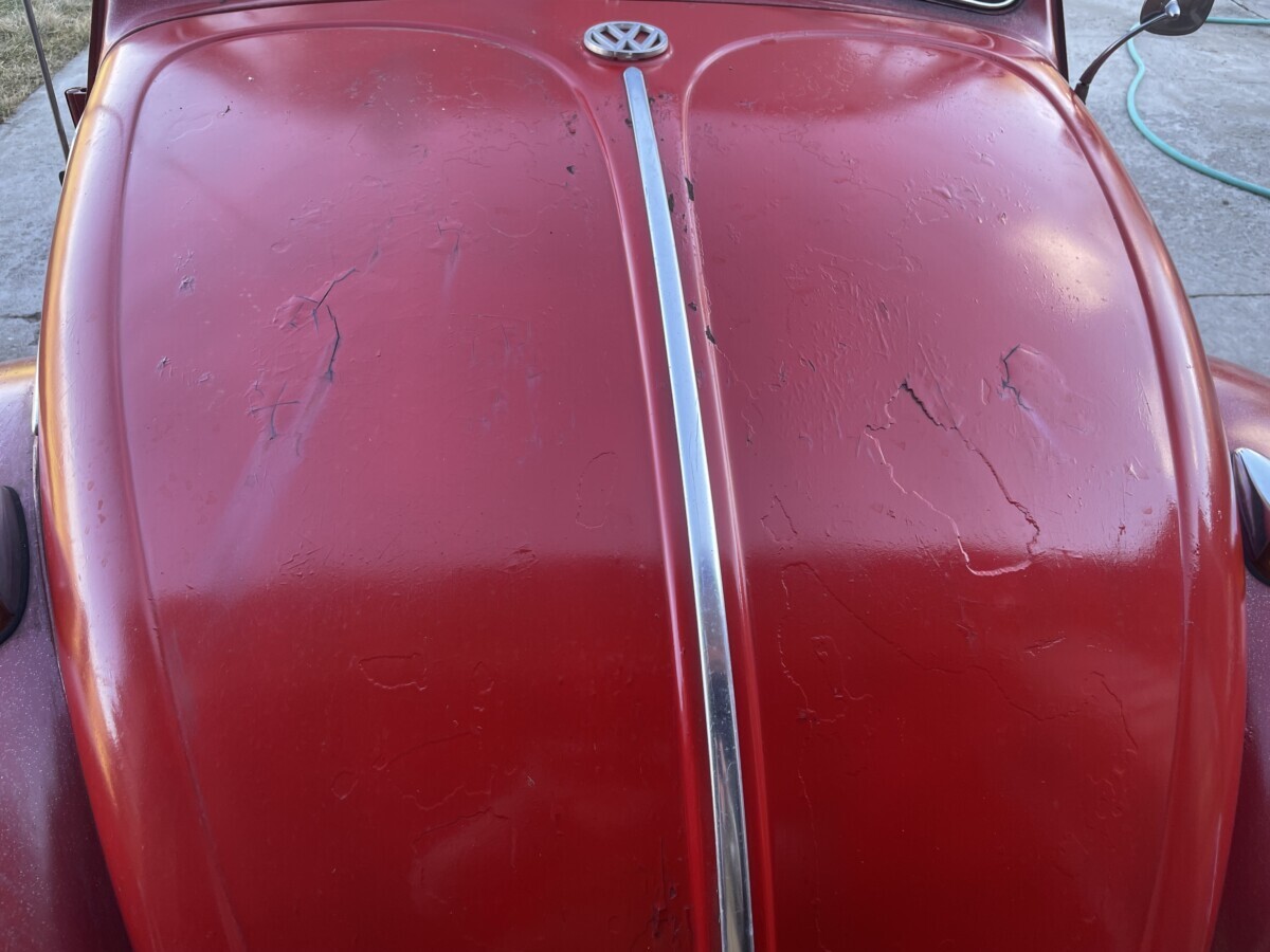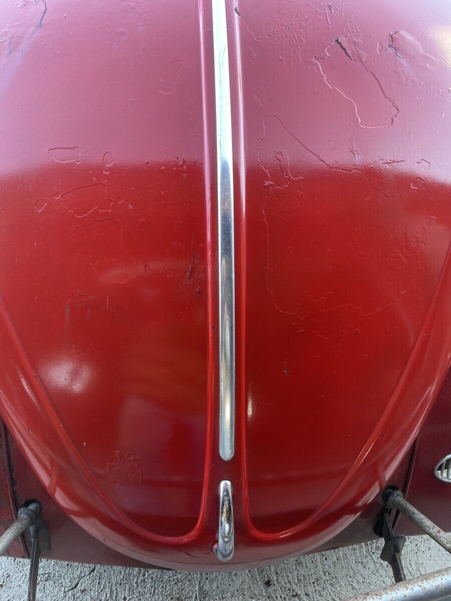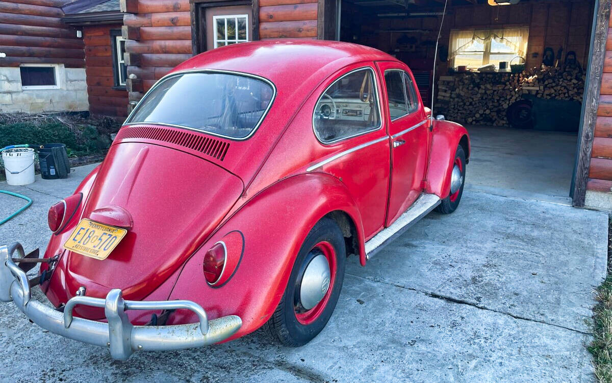 The seller’s family has quite a bit of history with this Bug. His aunt purchased it in 1967 with just 2k miles on the odometer. She drove it while she lived in California. In 1971, she gave it to the seller’s father, at that point it was showing 61k miles. It was then stored in his dad’s body shop until 1980 when the seller turned 16. At some point in the car’s past, it had been backed into, leaving a dent in the passenger side door. So, he and his brother decided to fix it up and make it a driver again. A replacement door was installed from another car, other dents were repaired, and the car was painted bright red and clear coated with metallic flake. It was driven off and on until 1983 when it went back into his father’s body shop and was stored there until the ’90s. Around this time, his dad retired so the Beetle was moved to the family barn, where it’s stayed ever since.