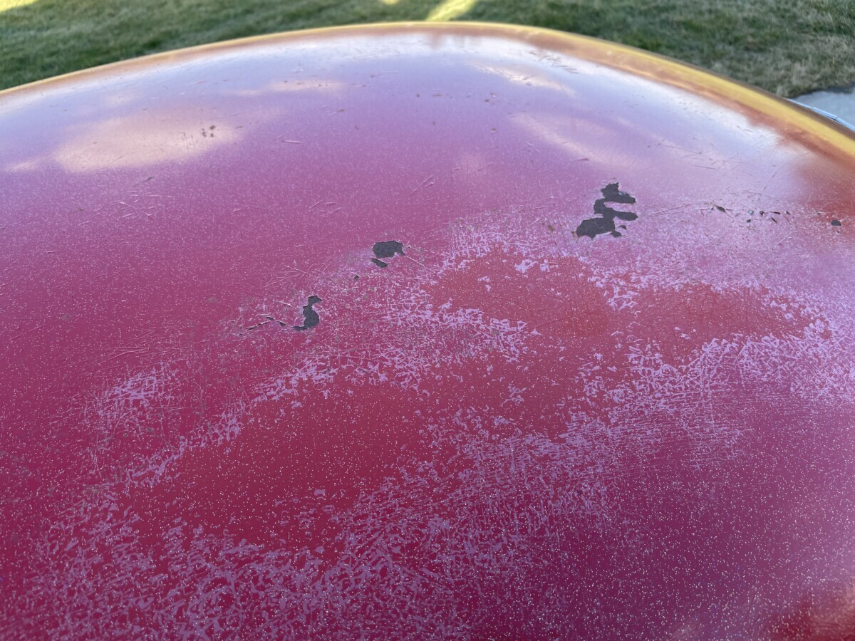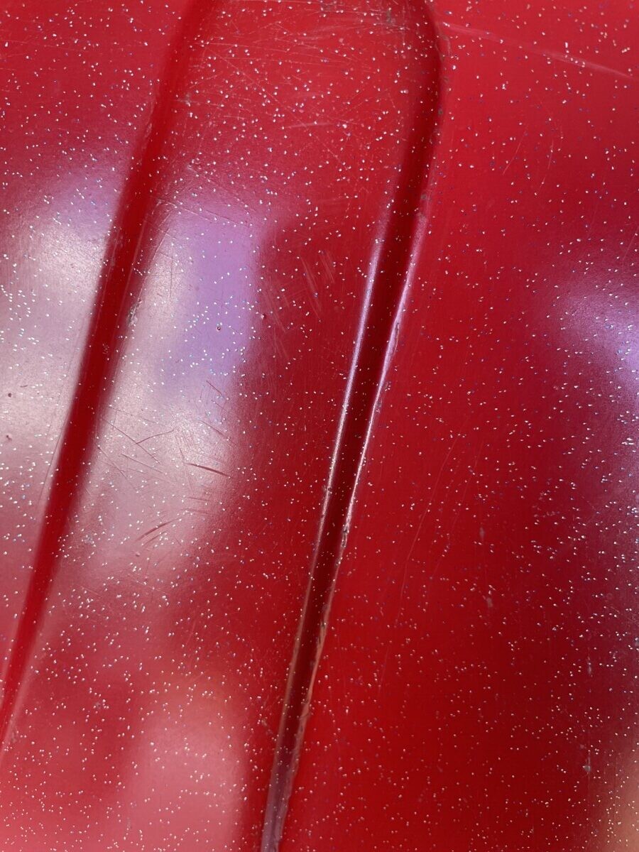 Seller here – It was white – I think the color I picked was candy apple red?? We sprayed a clear coat over it that had metallic flakes – it was the ‘80’s – that’s my only defense!