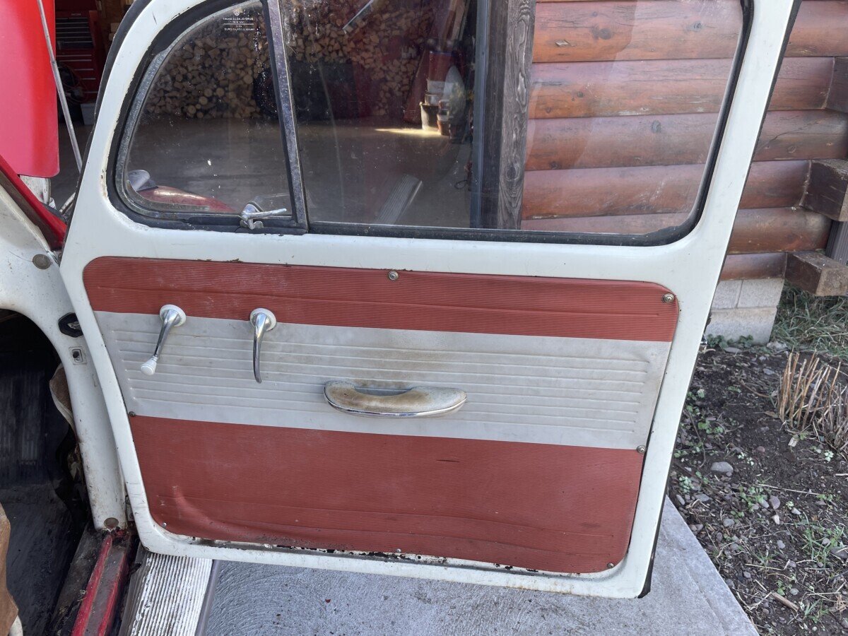 The door appears to be from a ’64 or earlier. The ’65 on cars had slightly larger windows, a very slight curve to the windshield and an angled vent window.