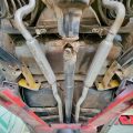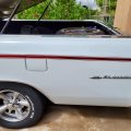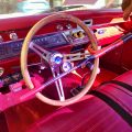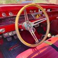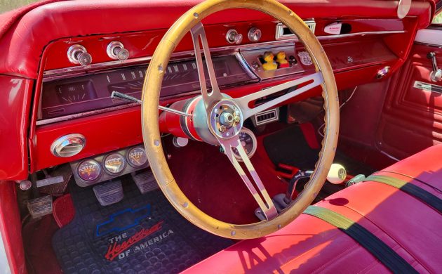 I kinda like the idea of the red side molding, but not just a paint stripe. How ’bout getting 62 Impala side molding in it’s place? A couple of the pictures show a Corvette center cap on the steering wheel, so maybe it’s got one. I also like the red bench seat in it, looks well done. A little engine bay clean up and a little pressure washing while it was on the life would probably bring him some more money. How hard would it have been to have the engine emblems on the front fender match? All that being said, I’d really like to have this car!