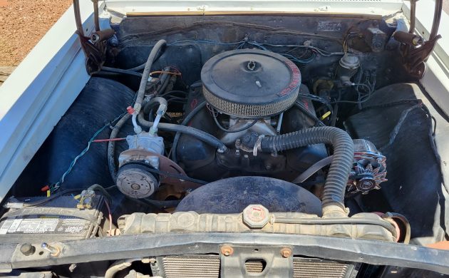With a weekend of detailing, this engine compartment could look fantastic. This engine is said to be a 350-cu.in. V8, and we don’t know the specs, but it has a mild racing cam and a four-barrel Edlebrock carb on top of an Edlebrock intake manifold. You can see the A/C compressor, and this car is a strong runner and will spin the rear wheels without much problem. This looks like a super nice car to just drive and enjoy, and pick away at a few things on weekends. Please check out all of the photos and get your bids in on this ’66 El Camino here on Barn Finds Auctions!