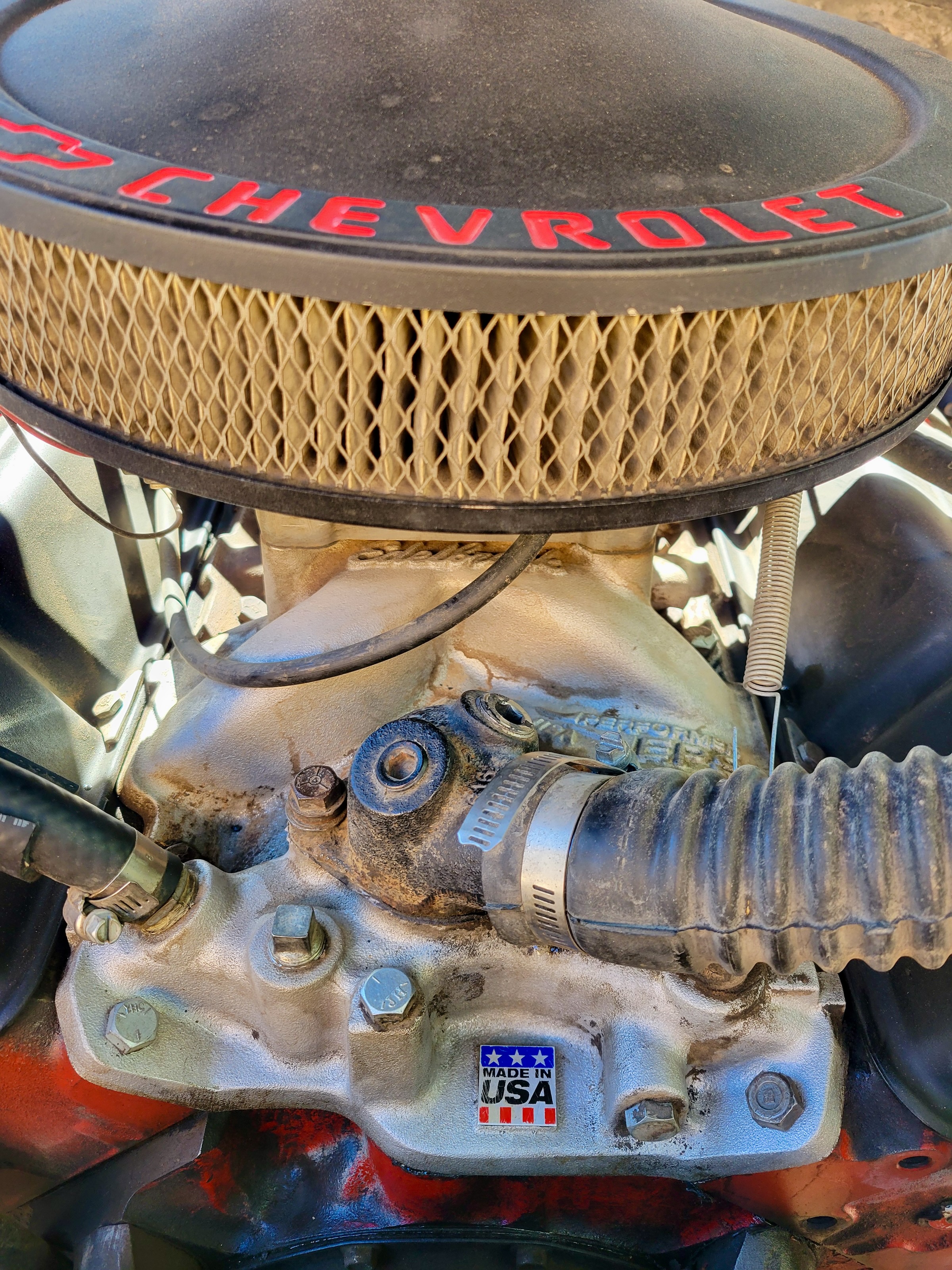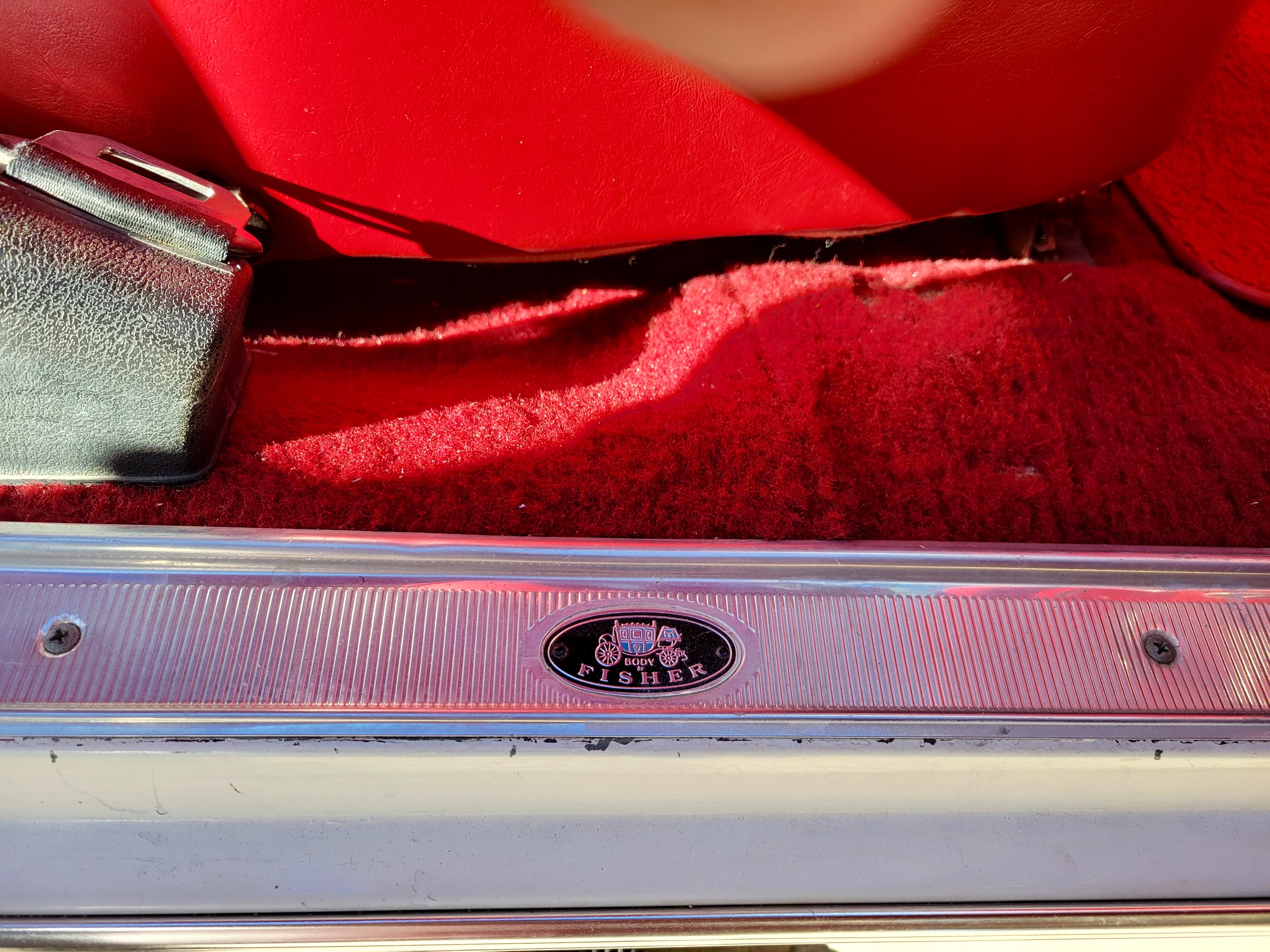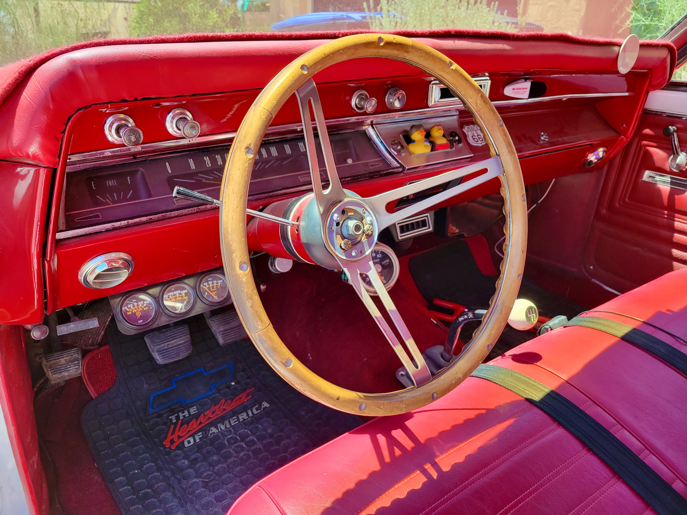 I kinda like the idea of the red side molding, but not just a paint stripe. How ’bout getting 62 Impala side molding in it’s place? A couple of the pictures show a Corvette center cap on the steering wheel, so maybe it’s got one. I also like the red bench seat in it, looks well done. A little engine bay clean up and a little pressure washing while it was on the life would probably bring him some more money. How hard would it have been to have the engine emblems on the front fender match? All that being said, I’d really like to have this car!