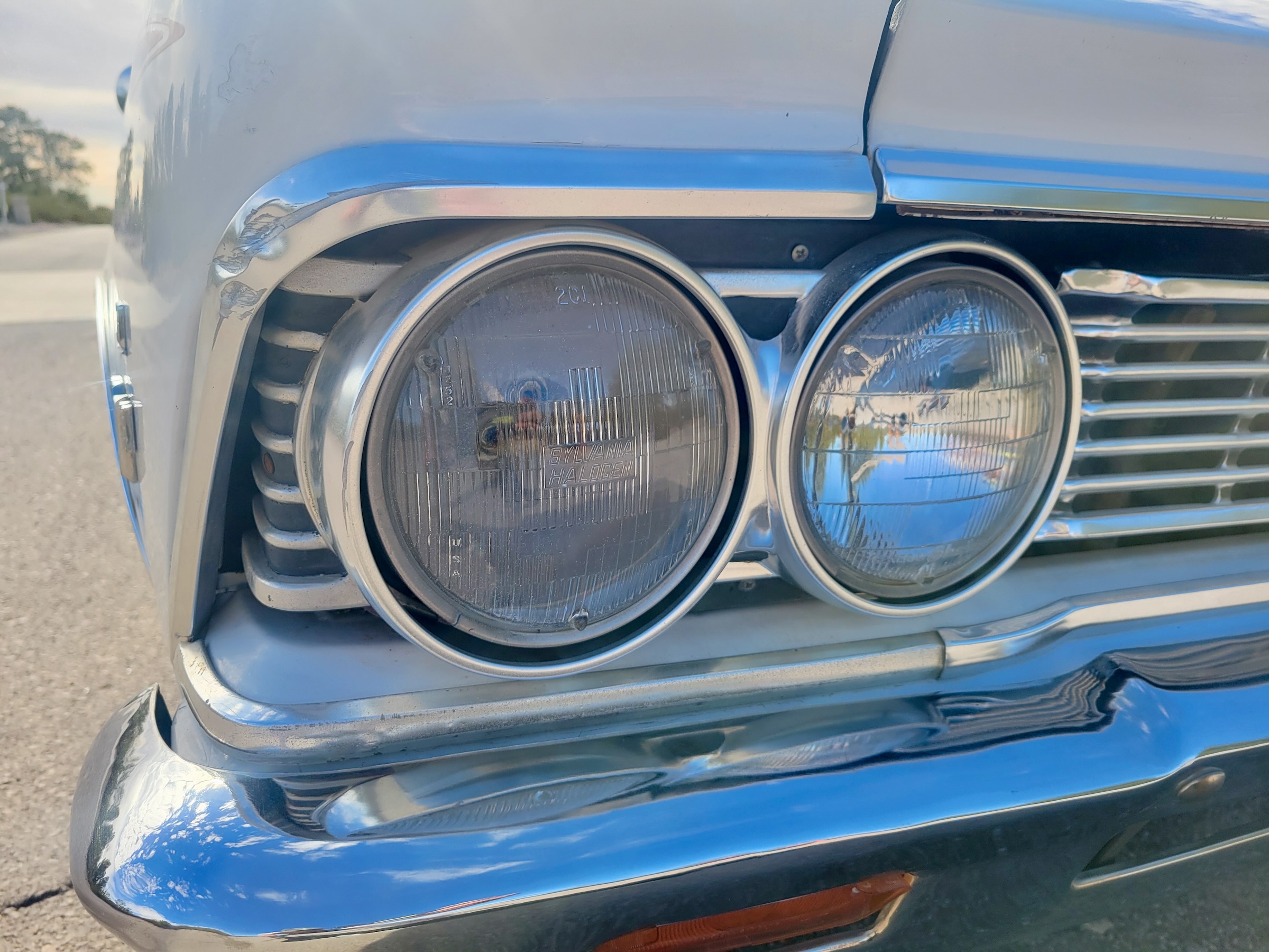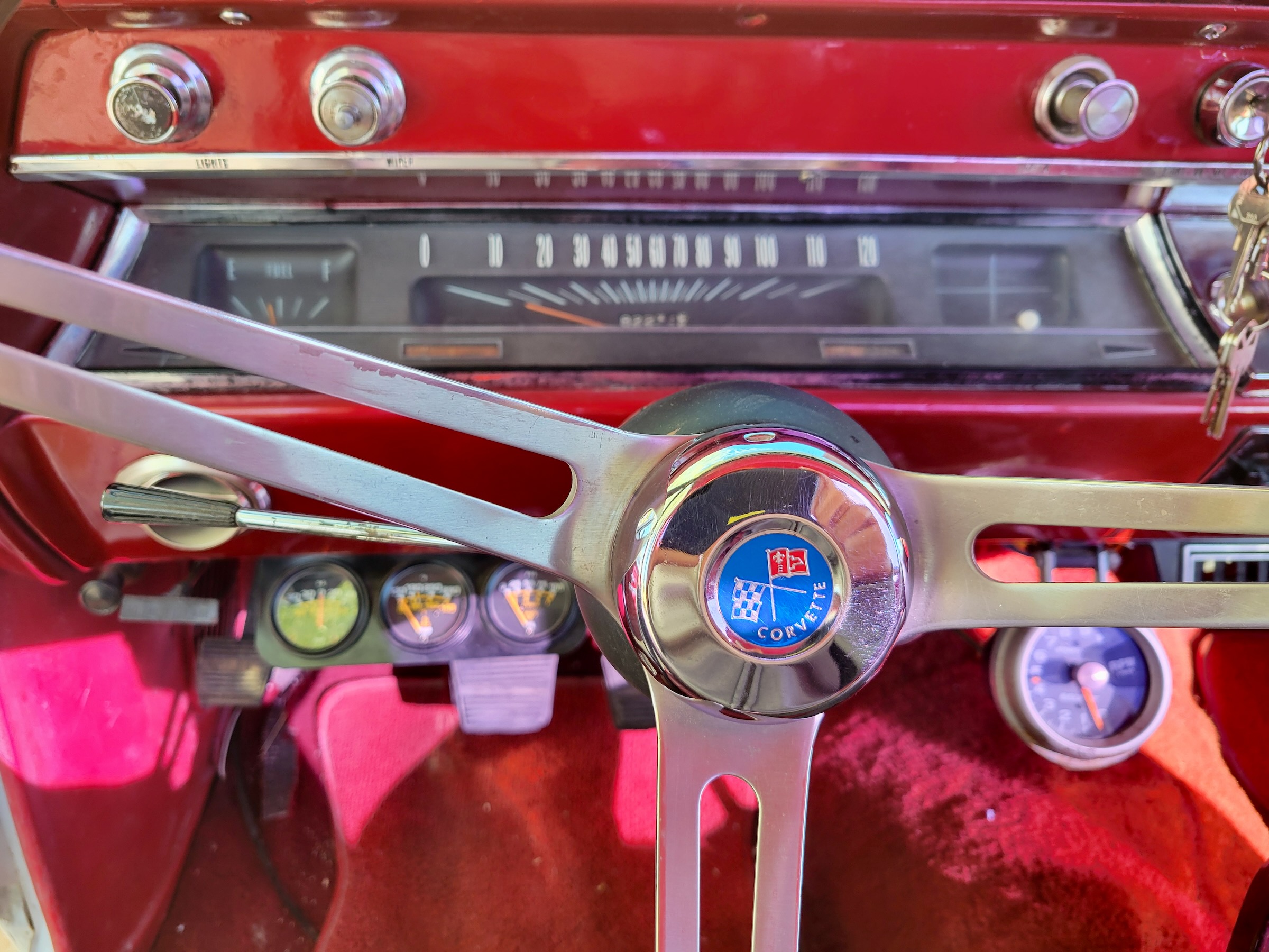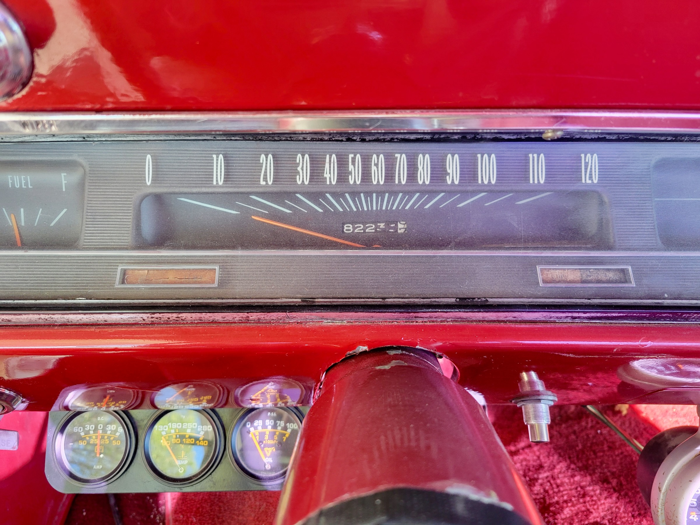 I kinda like the idea of the red side molding, but not just a paint stripe. How ’bout getting 62 Impala side molding in it’s place? A couple of the pictures show a Corvette center cap on the steering wheel, so maybe it’s got one. I also like the red bench seat in it, looks well done. A little engine bay clean up and a little pressure washing while it was on the life would probably bring him some more money. How hard would it have been to have the engine emblems on the front fender match? All that being said, I’d really like to have this car!
