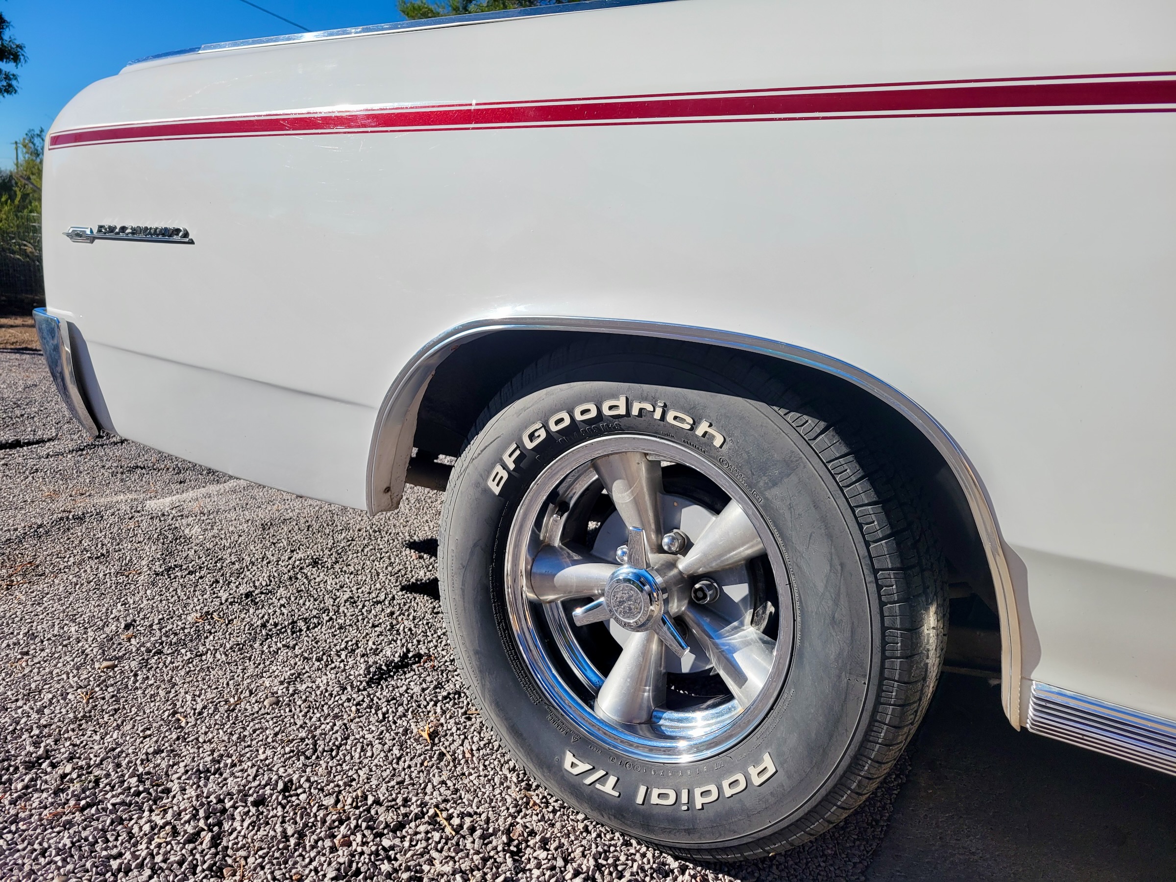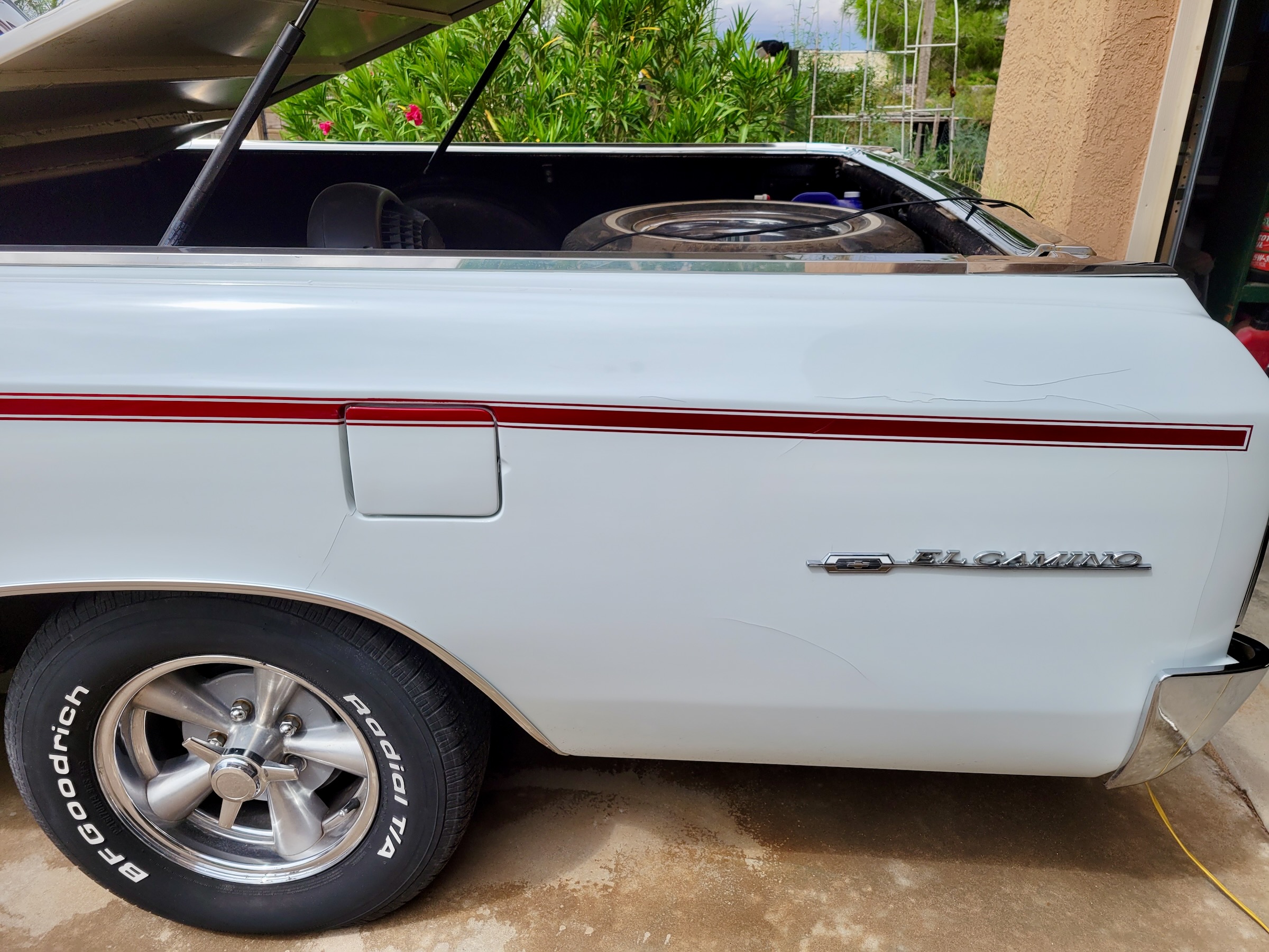 I’m a big mid sixties El Camino fan as I had a ’67 L-79 4 speed that I restored, but there are a couple of things about this one that would give me pause. That red stripe, (or body molding) is horrendous, and the fact that the seller didn’t bother to clean up under the hood and find a center cap for the steering wheel tends to make me think that it mat not have had the best of care. (Also, as Cooter mentioned, 8″ Vette rallies would help tremendously)