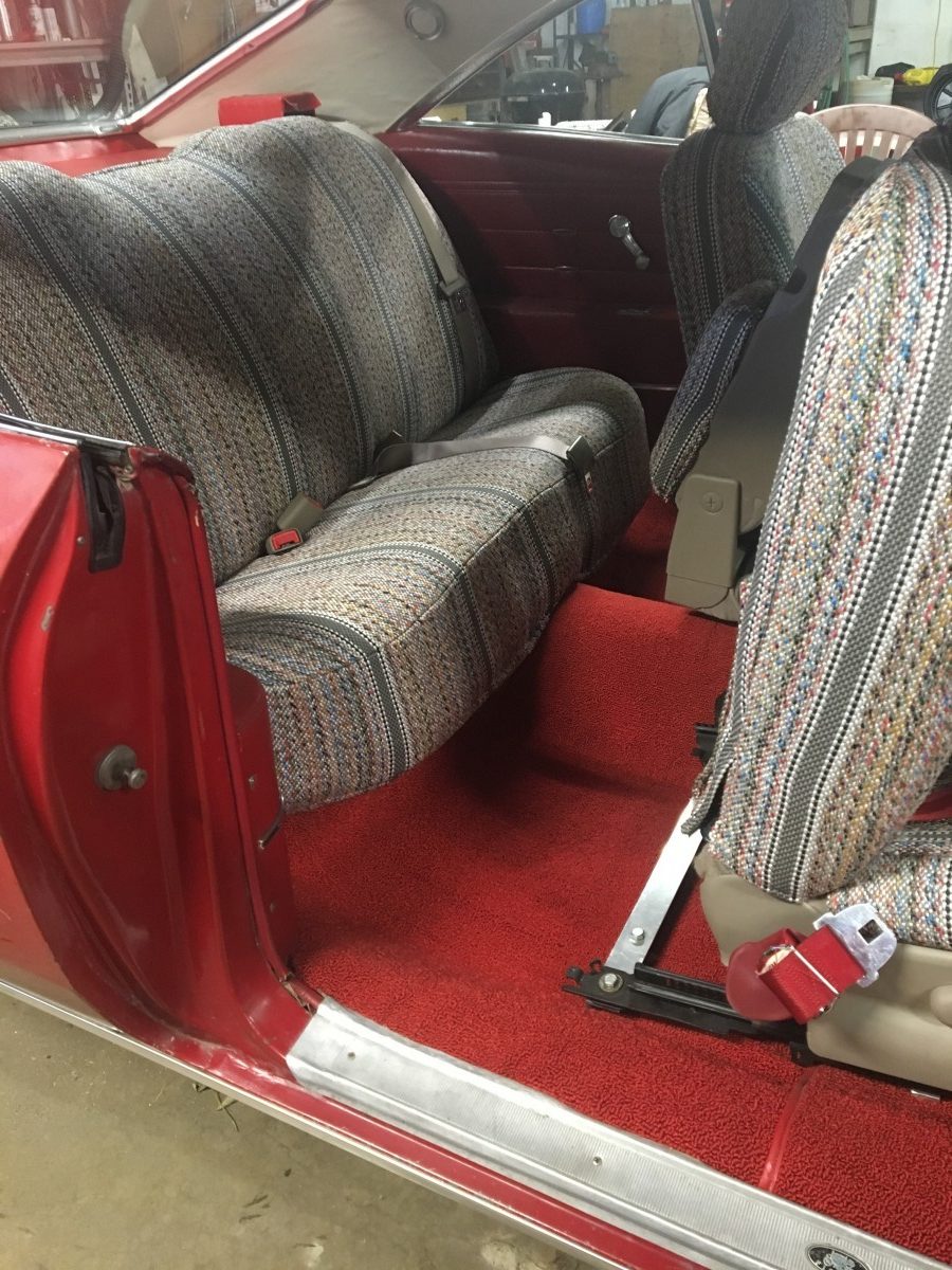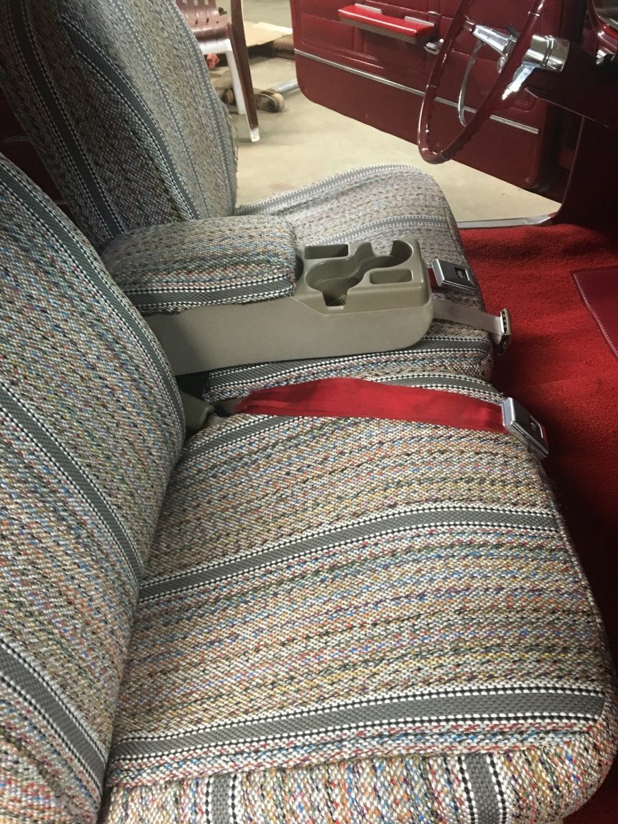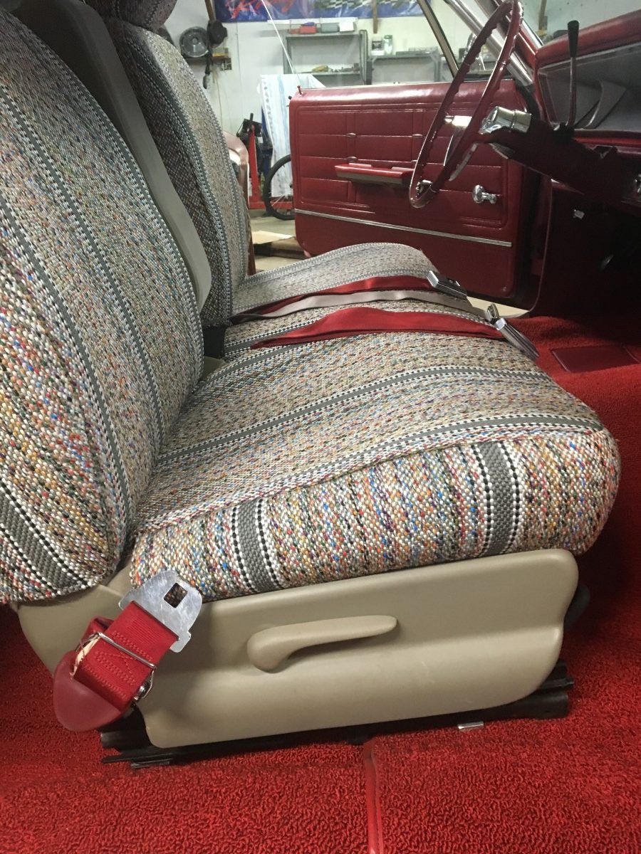 Getting the interior looking good required installing all-new carpets, headliner, and dash pad. The seats came out of a 2002 Buick and are said to be in excellent condition. They currently wear covers to protect them from their grandchildren. The seller also had modern shoulder belts installed in the rear seat so they could haul their grandkids around in it. The seats actually look good with the saddle blanket covers installed.