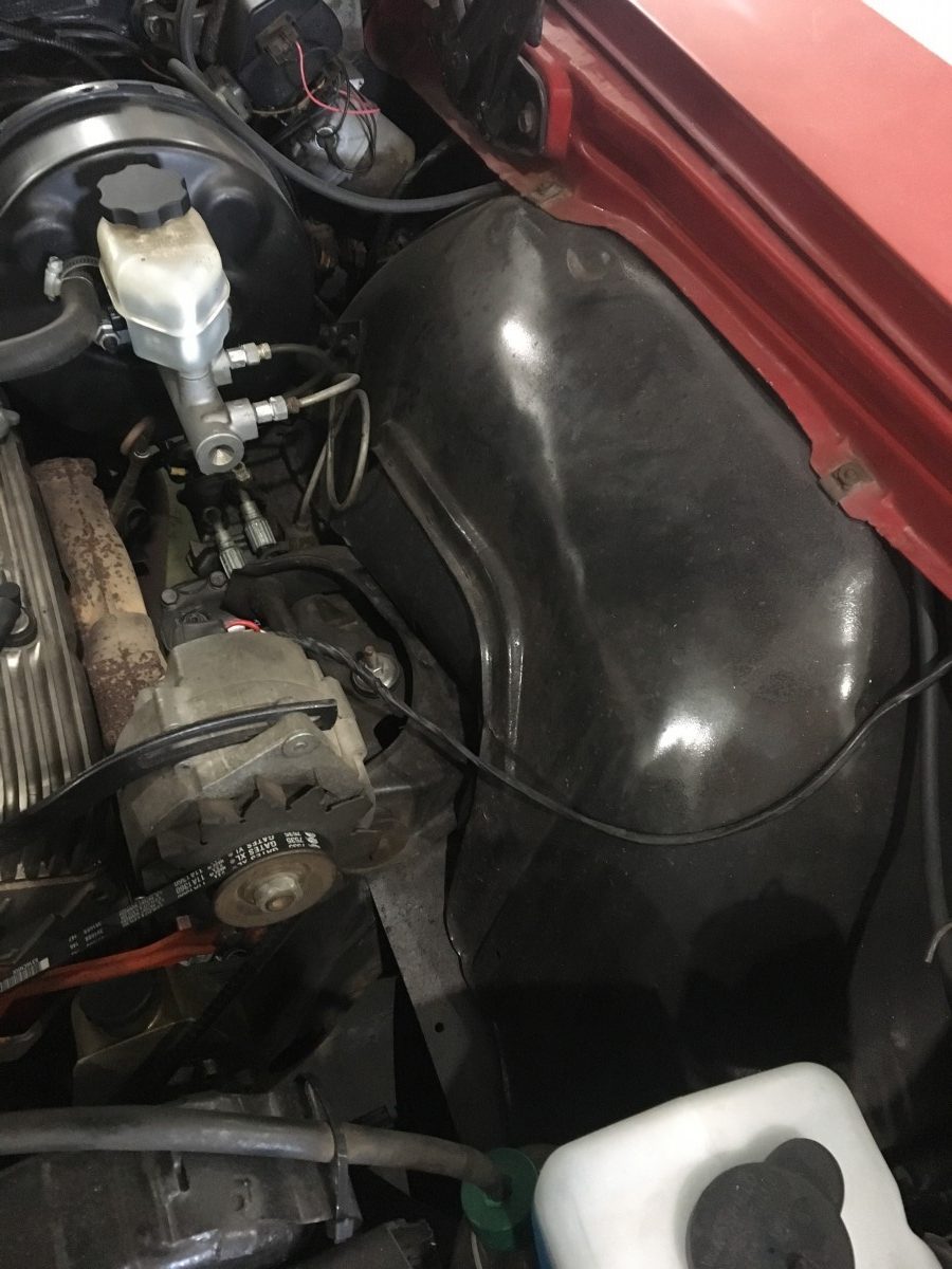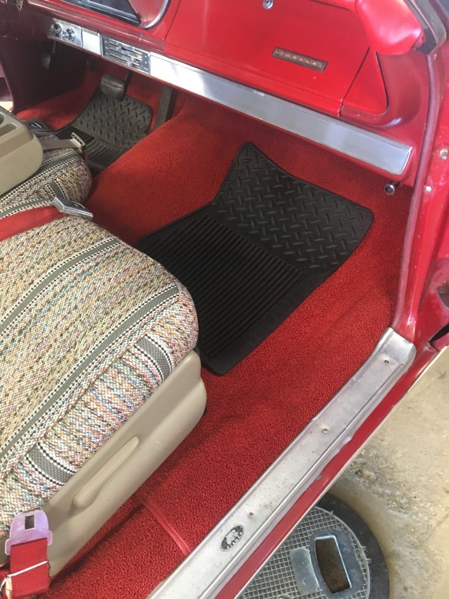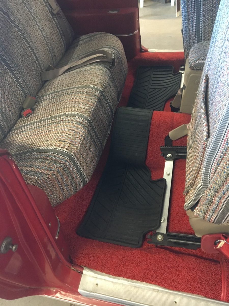Getting the interior looking good required installing all-new carpets, headliner, and dash pad. The seats came out of a 2002 Buick and are said to be in excellent condition. They currently wear covers to protect them from their grandchildren. The seller also had modern shoulder belts installed in the rear seat so they could haul their grandkids around in it. The seats actually look good with the saddle blanket covers installed.