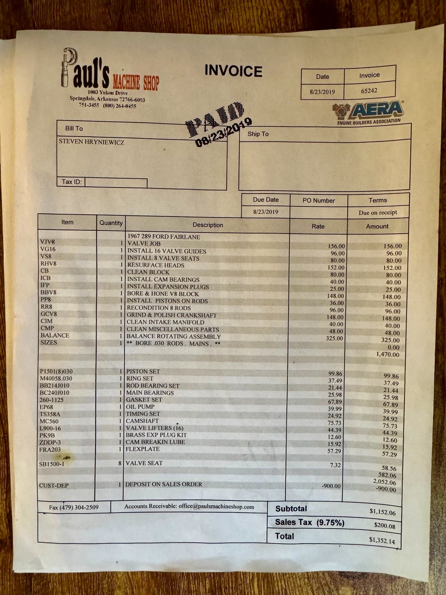 Today, it’s not exactly as it was purchased. Originally, it was a low-optioned six-cylinder car, but the current owner has significantly upgraded it. He found a 289 and a C4 automatic from another 1967 Fairlane and did a complete V8 conversion, including rebuilding the front suspension and adding power steering and power front disc brakes. The engine itself was completely rebuilt by a local machine shop 3,000 miles ago (all receipts included, see the pictures below). The 289 two barrel is an excellent engine for a light car like a Fairlane; it will cruise at freeway speeds with ease and return decent gas mileage (for a ’60s car). If you want more power, the small-block Ford has one of the largest aftermarket parts selections in the industry.