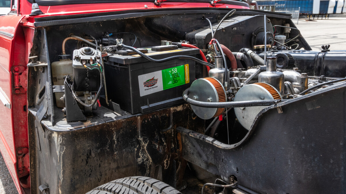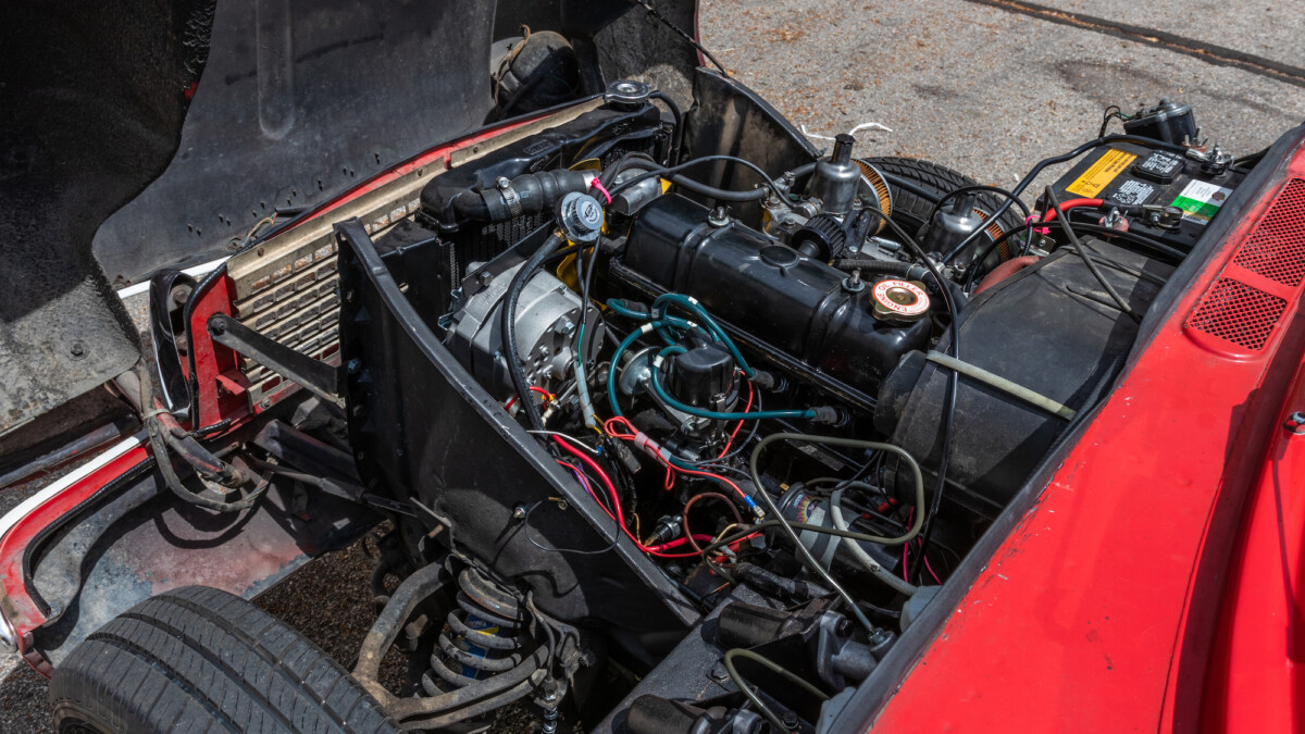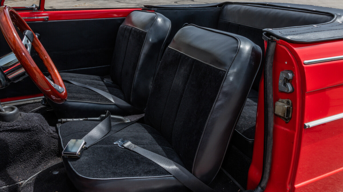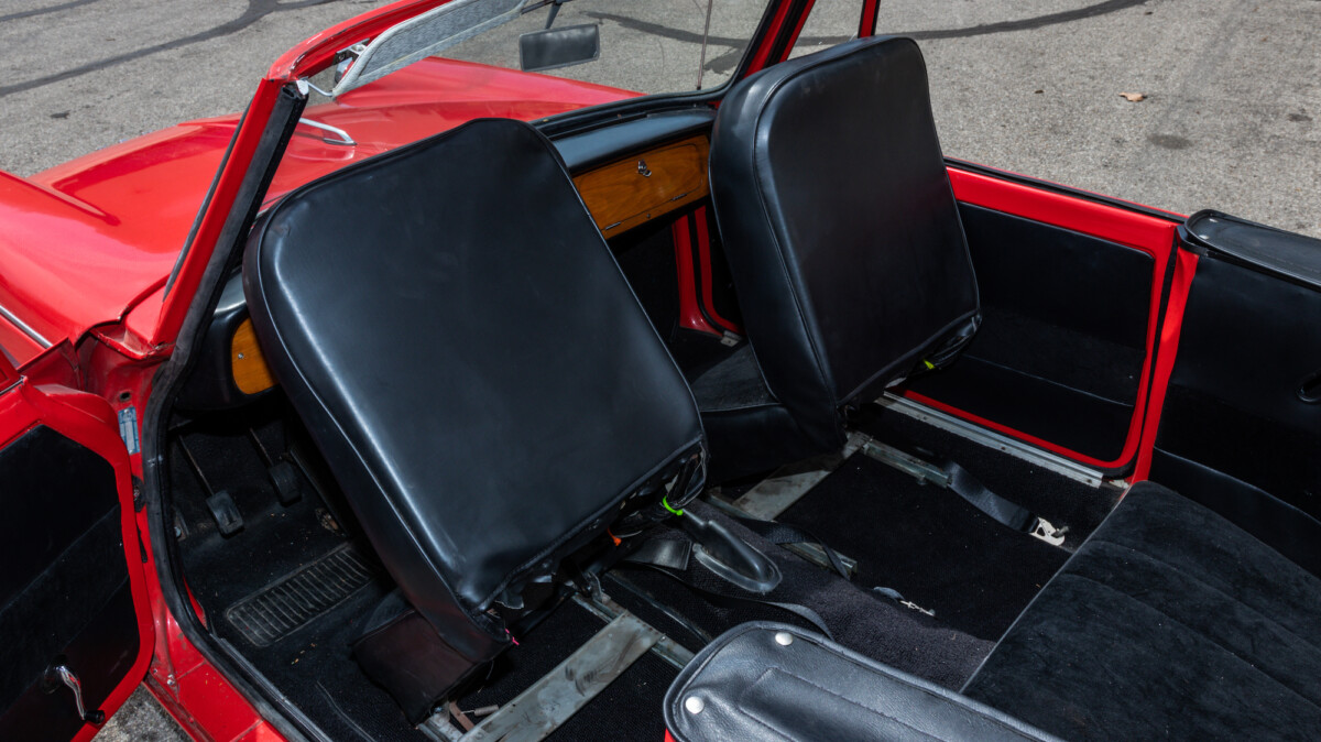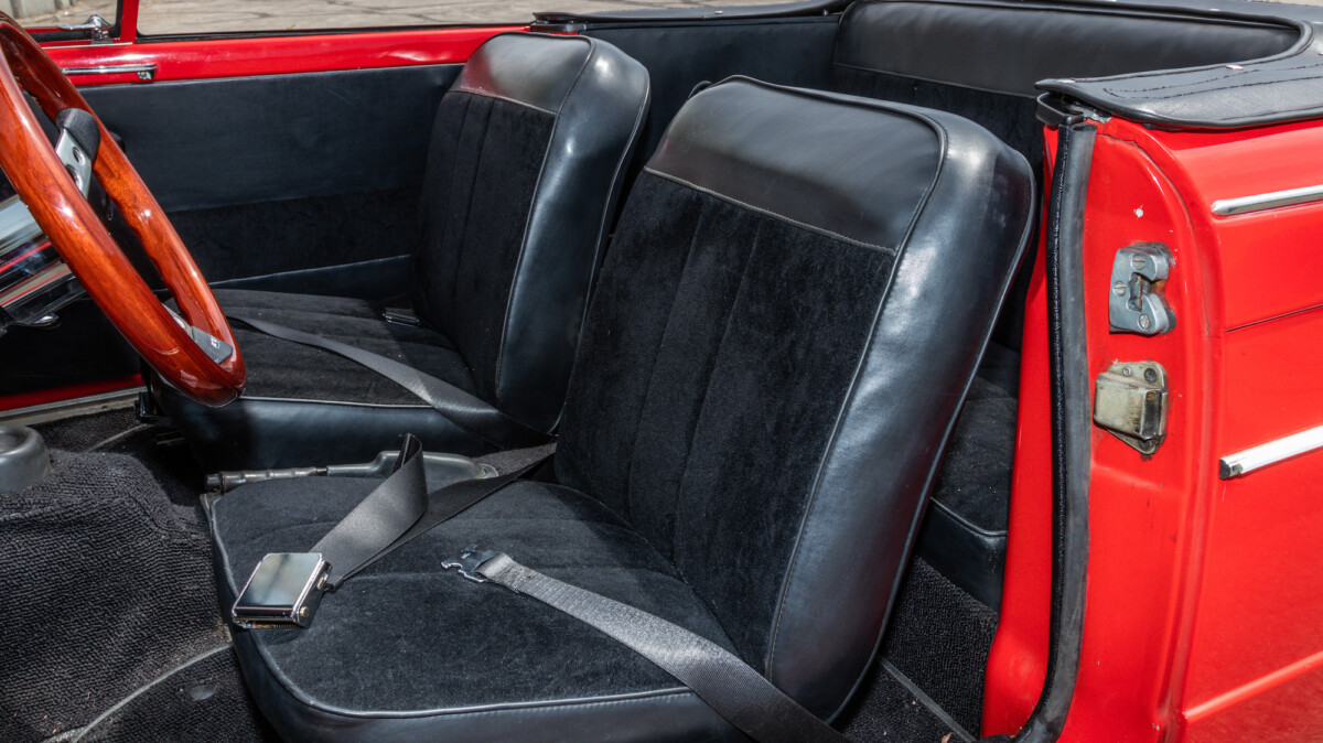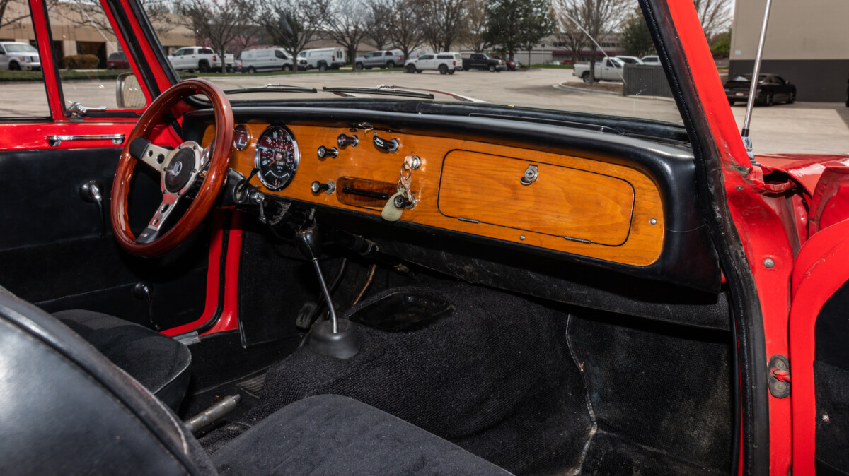 The inside looks to be in nice shape and is reminiscent of, well, a Spitfire. The wooden dash panel is larger and lacks a few of the gauges found in the Spitfire/GT6, but you can definitely see the relation. There are a few cracks showing in the wood, but overall, it presents nicely. The Motolita steering wheel is a nice touch, but its wooden rim doesn’t match the dash’s stain. It can be a challenge to match stains perfectly and it’s honestly a nice upgrade over the stock wheel. All of the soft surfaces look to be in good shape. A new convertible top has already been fitted, but the best way to enjoy a British convertible is with the top down.