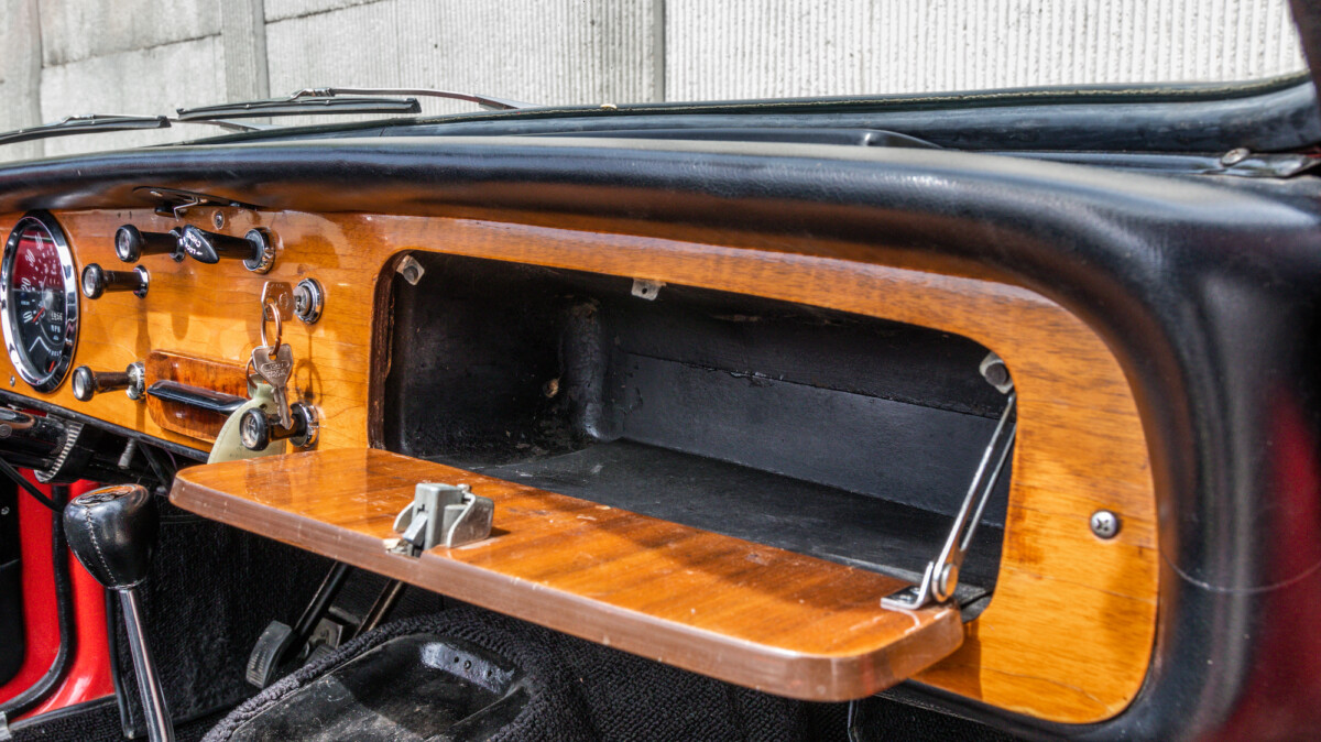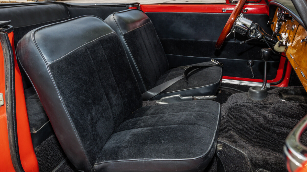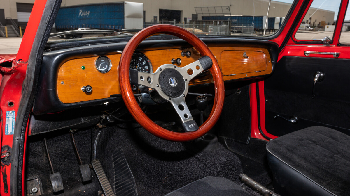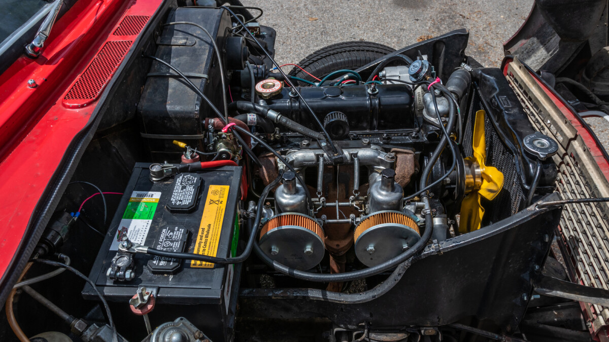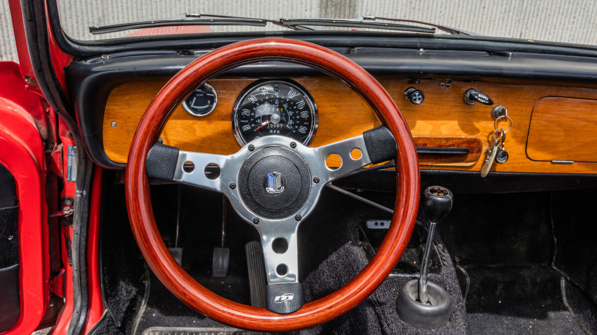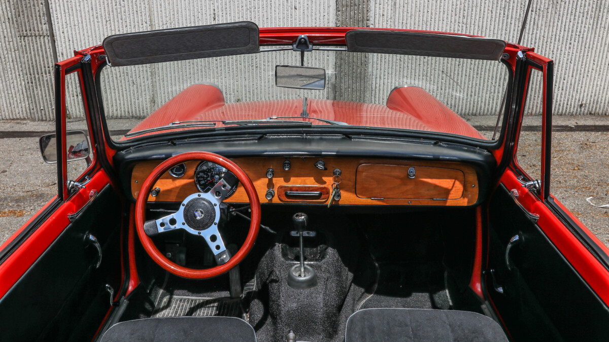 The inside looks to be in nice shape and is reminiscent of, well, a Spitfire. The wooden dash panel is larger and lacks a few of the gauges found in the Spitfire/GT6, but you can definitely see the relation. There are a few cracks showing in the wood, but overall, it presents nicely. The Motolita steering wheel is a nice touch, but its wooden rim doesn’t match the dash’s stain. It can be a challenge to match stains perfectly and it’s honestly a nice upgrade over the stock wheel. All of the soft surfaces look to be in good shape. A new convertible top has already been fitted, but the best way to enjoy a British convertible is with the top down.