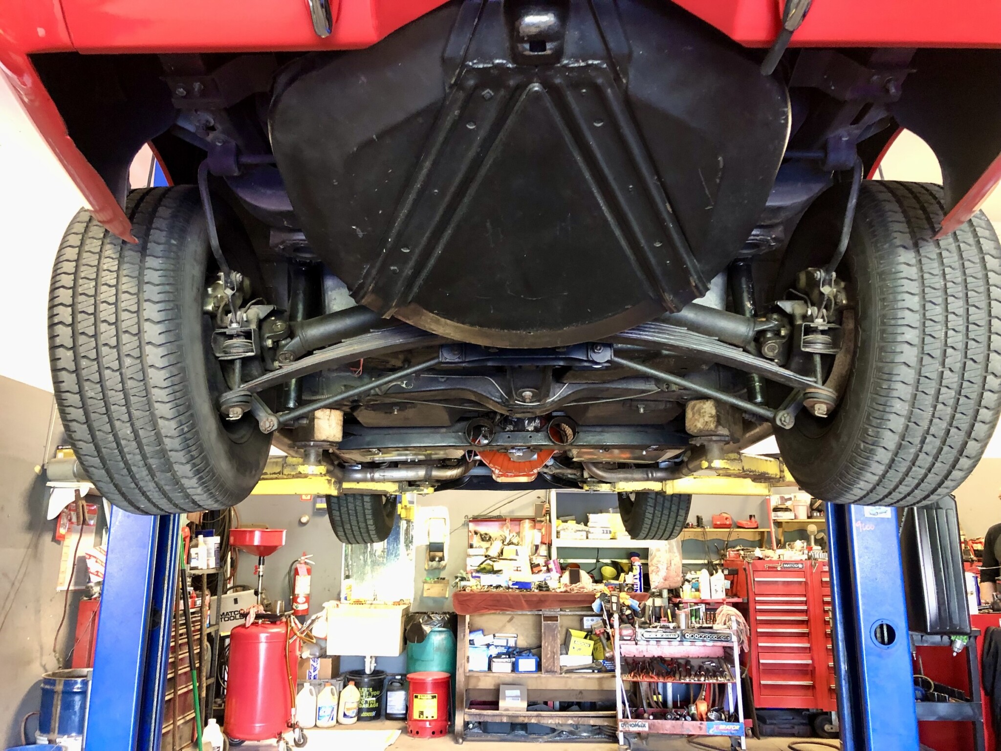 The underside appears to be as clean as the top side. A look at the tank sticker shows this car was optioned with the 3.55 Positraction rear, audio alarm, AM/FM radio, power steering, and side-mounted exhaust.