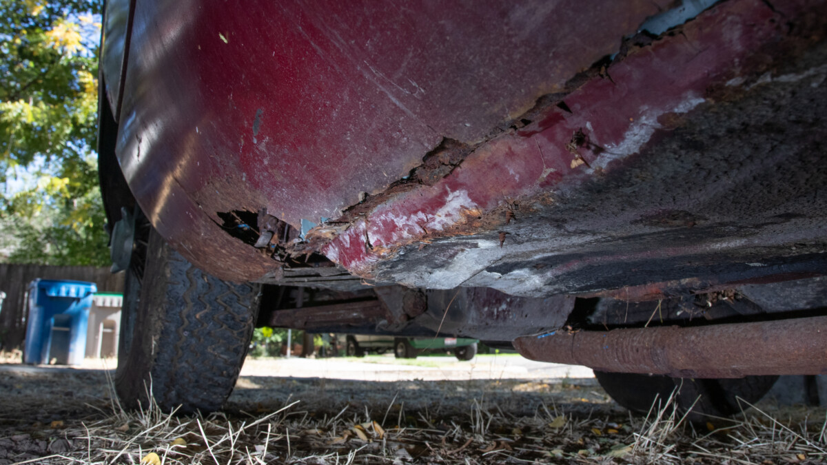 The majority of the body actually looks very solid. The nose has a few dings but no big holes that we could see. The worst of the body damage is concentrated on the passenger side rear quarter panel. We are guessing it was in a fender bender and the work was never finished. So plan on replacing the fender, some of the inner structure, and the door.