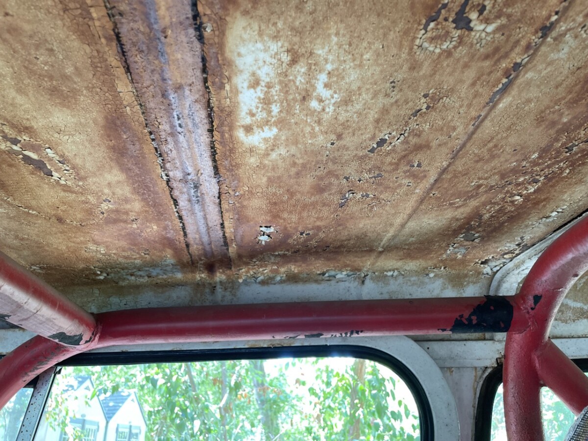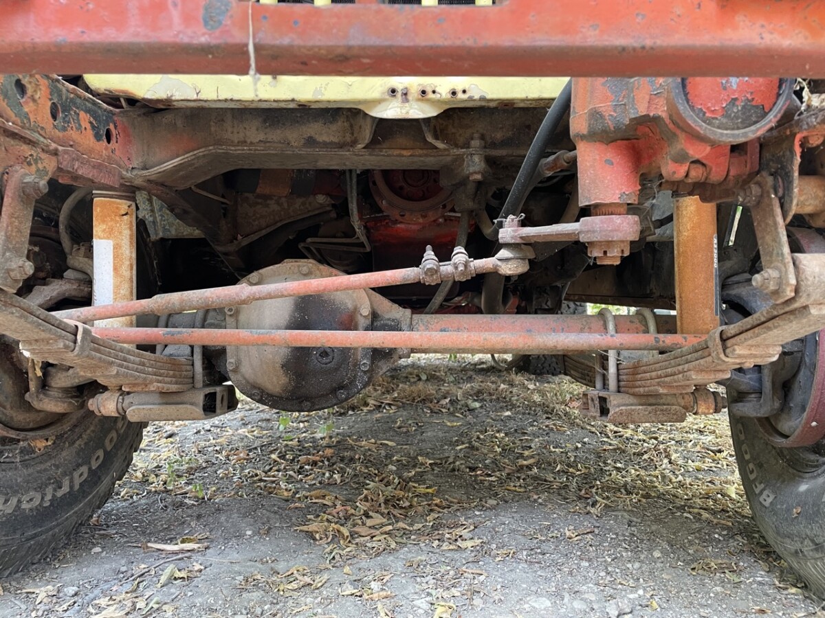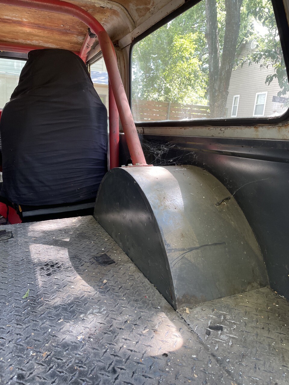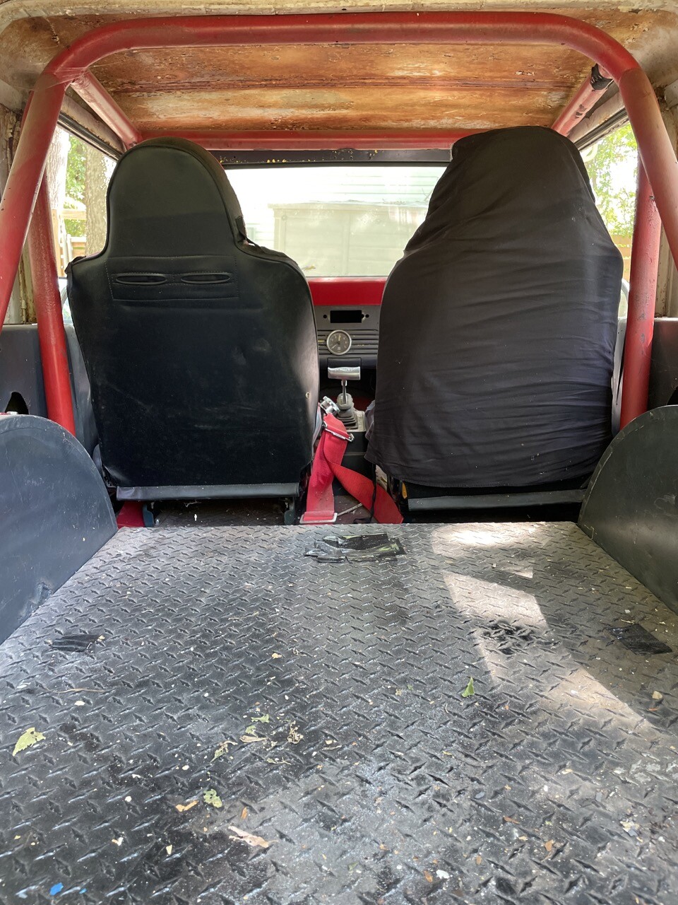 The interior is a little unkept and has aftermarket front seats. There are no rear seats but the Commando has 5-point racing harnesses. Several upgrades have been done to the Commando including a new radiator, aftermarket HEI distributor, and rebuilt automatic 3-speed transmission. The Dana 30 transfer case has also been rebuilt. The transfer case is controlled by dual sticks, one for the front axle and one for the rear axle.
