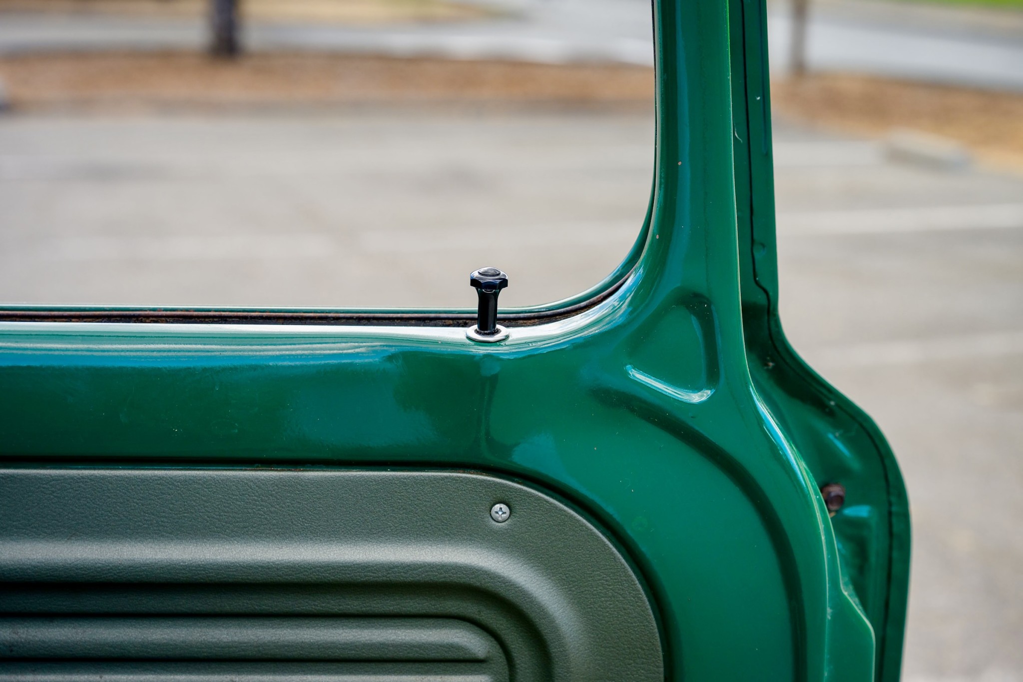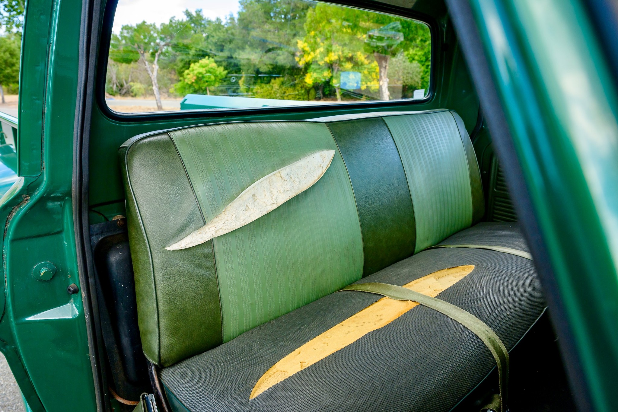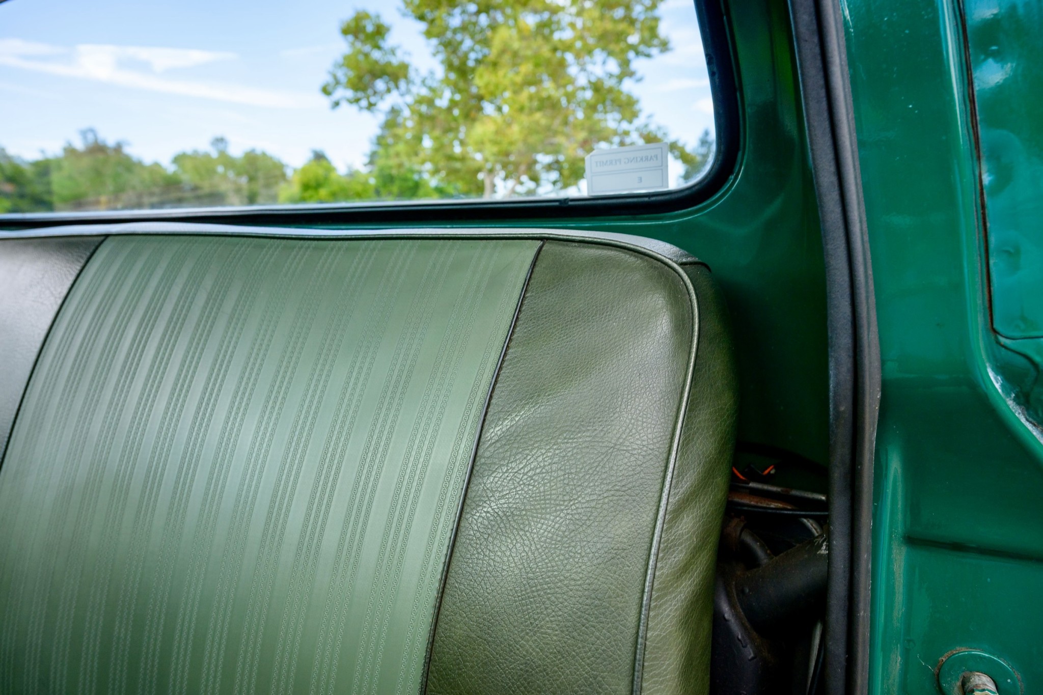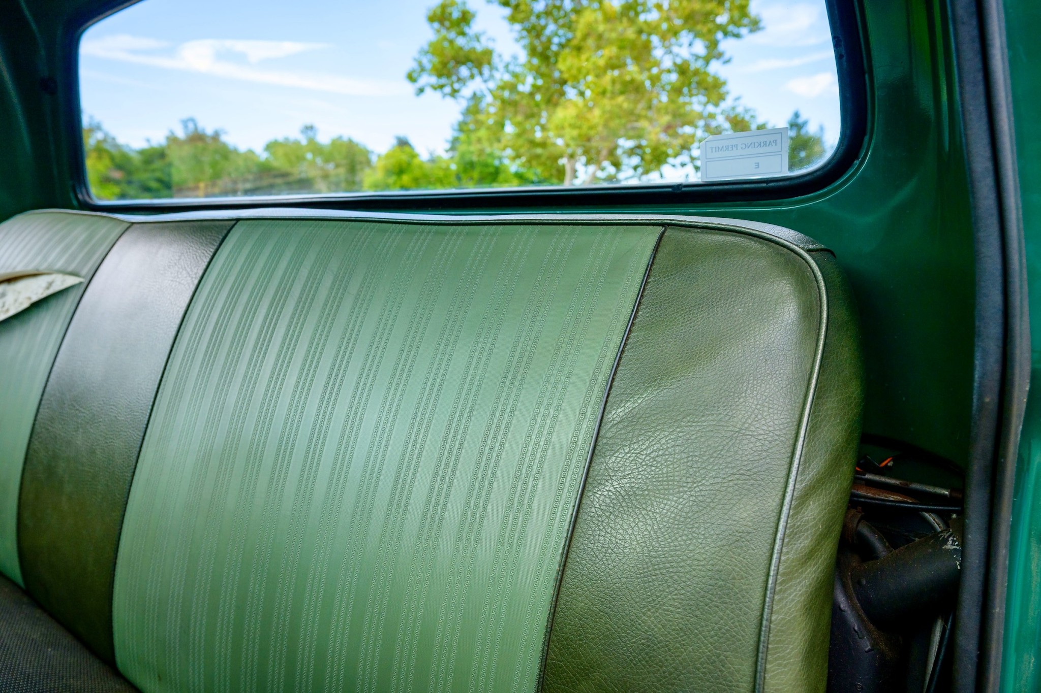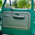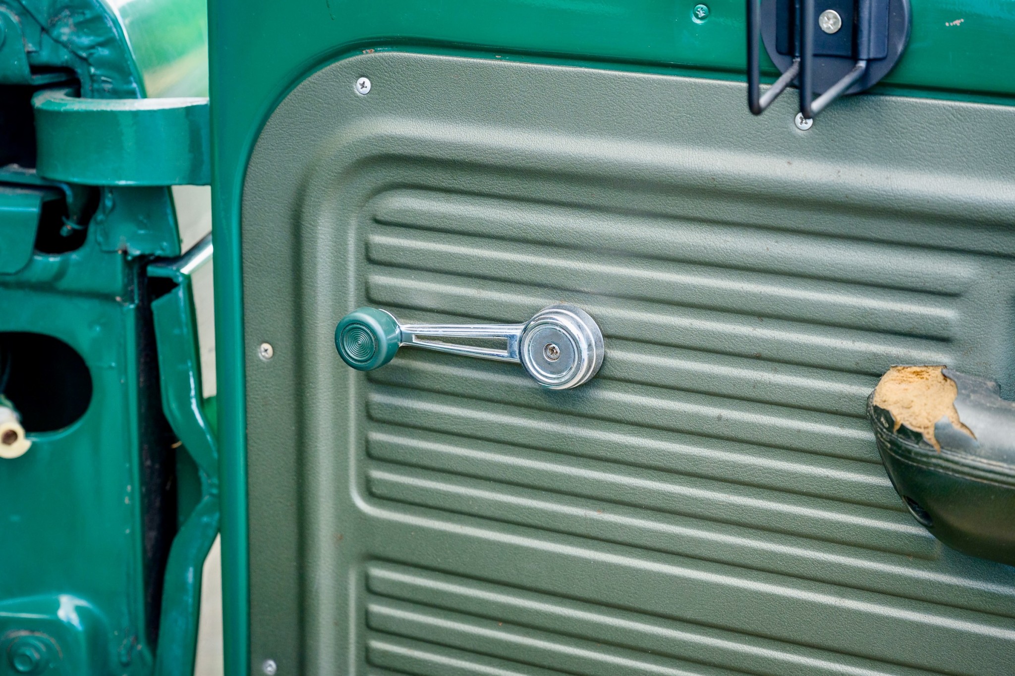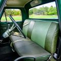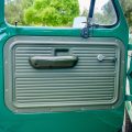 As far as I know, none of the green interior pieces for this truck are available… I’ve seen a few colors available but not green (and if you look closely you’ll see that everything on the interior has the same green: door panels, arm rests, window crank knobs). I got the black vinyl seat upholstery with the truck but haven’t had it installed because I’d really rather get something custom done that is closer to the original.