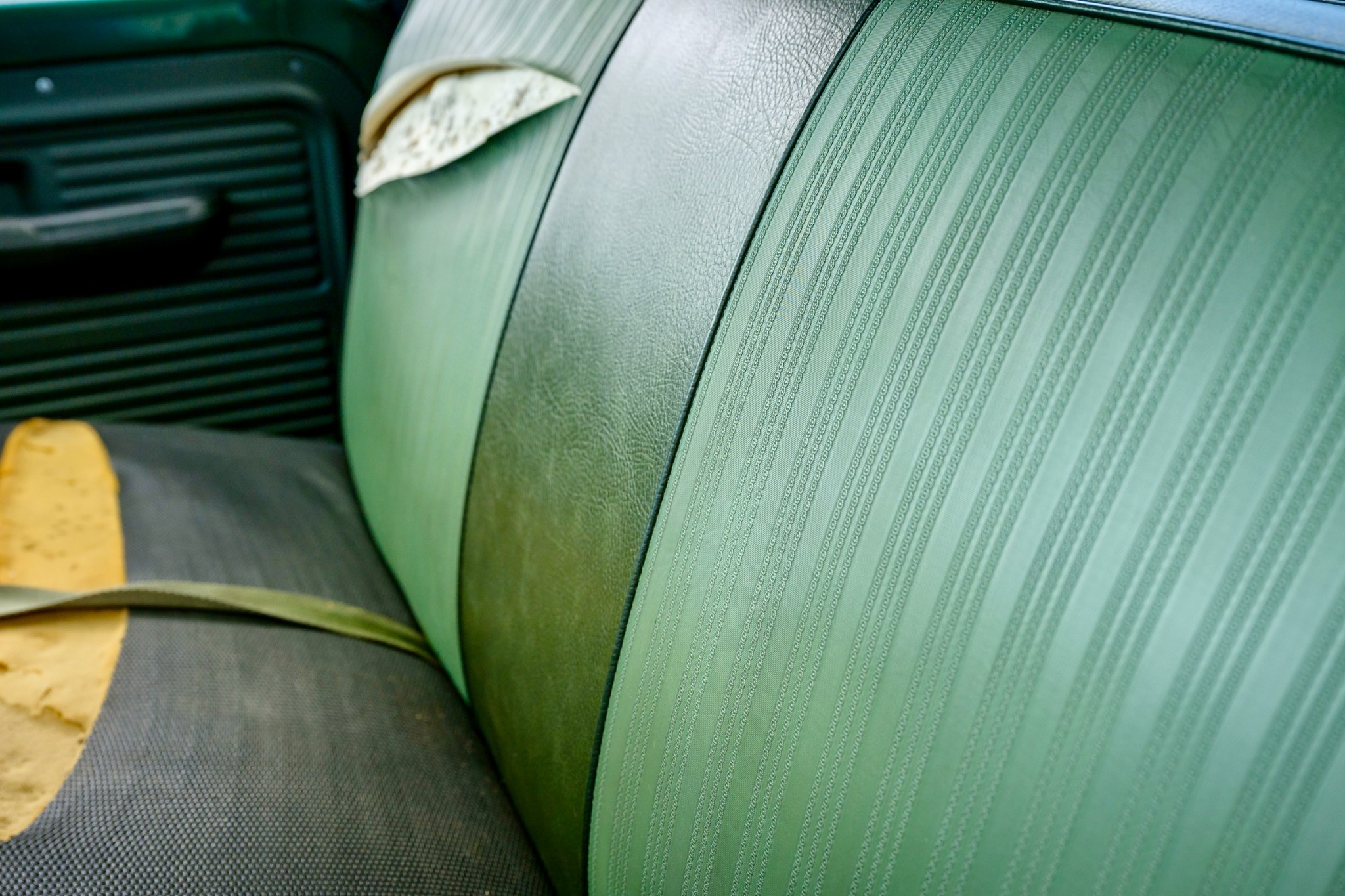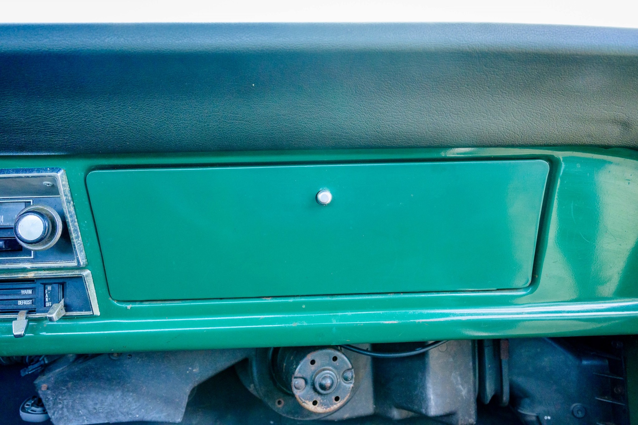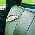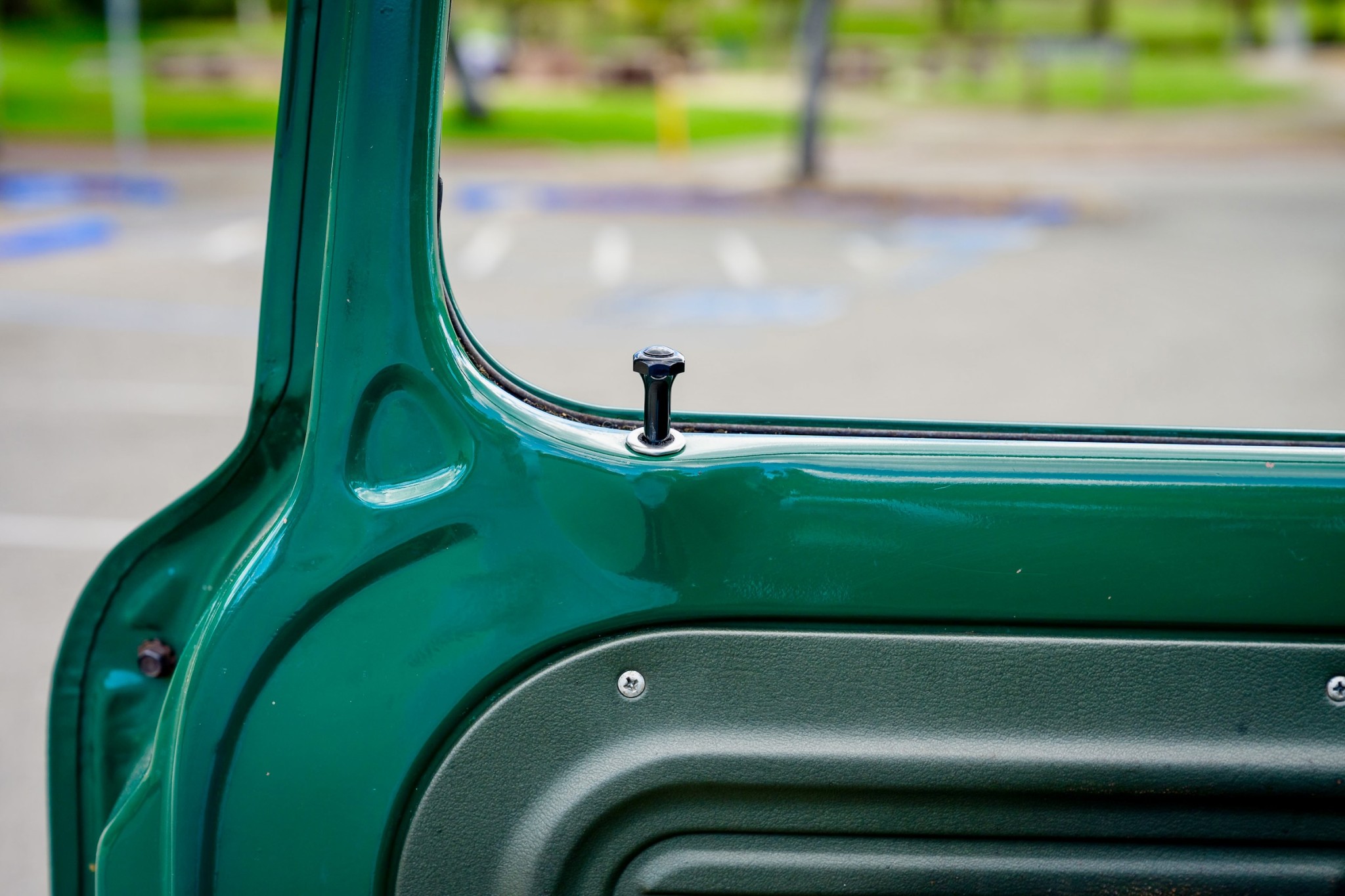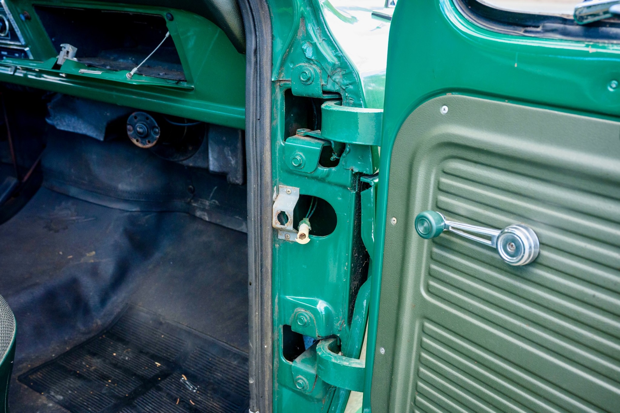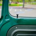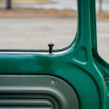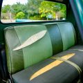 As far as I know, none of the green interior pieces for this truck are available… I’ve seen a few colors available but not green (and if you look closely you’ll see that everything on the interior has the same green: door panels, arm rests, window crank knobs). I got the black vinyl seat upholstery with the truck but haven’t had it installed because I’d really rather get something custom done that is closer to the original.