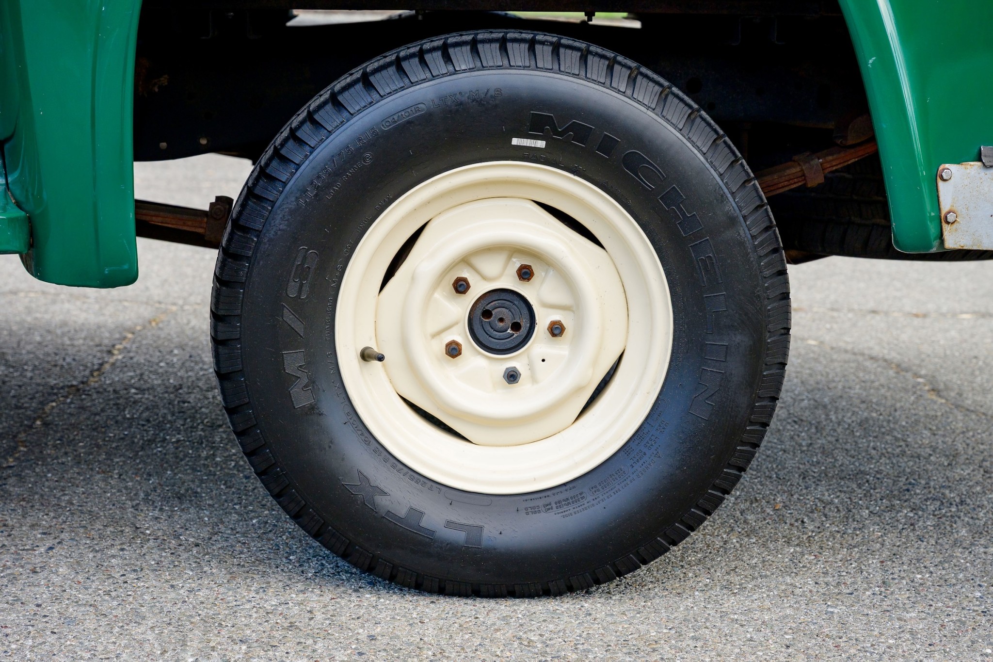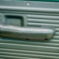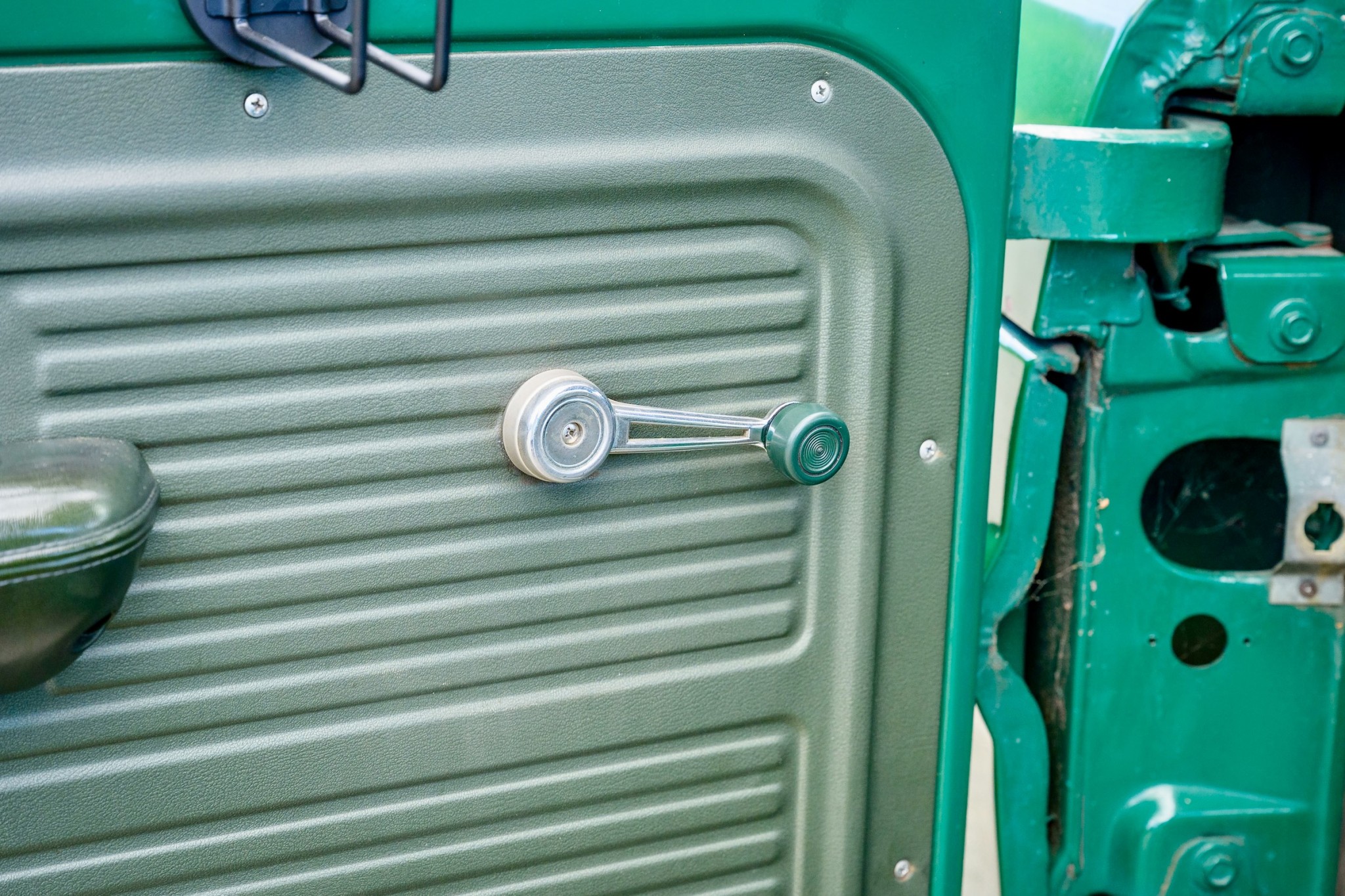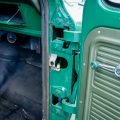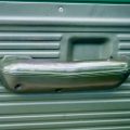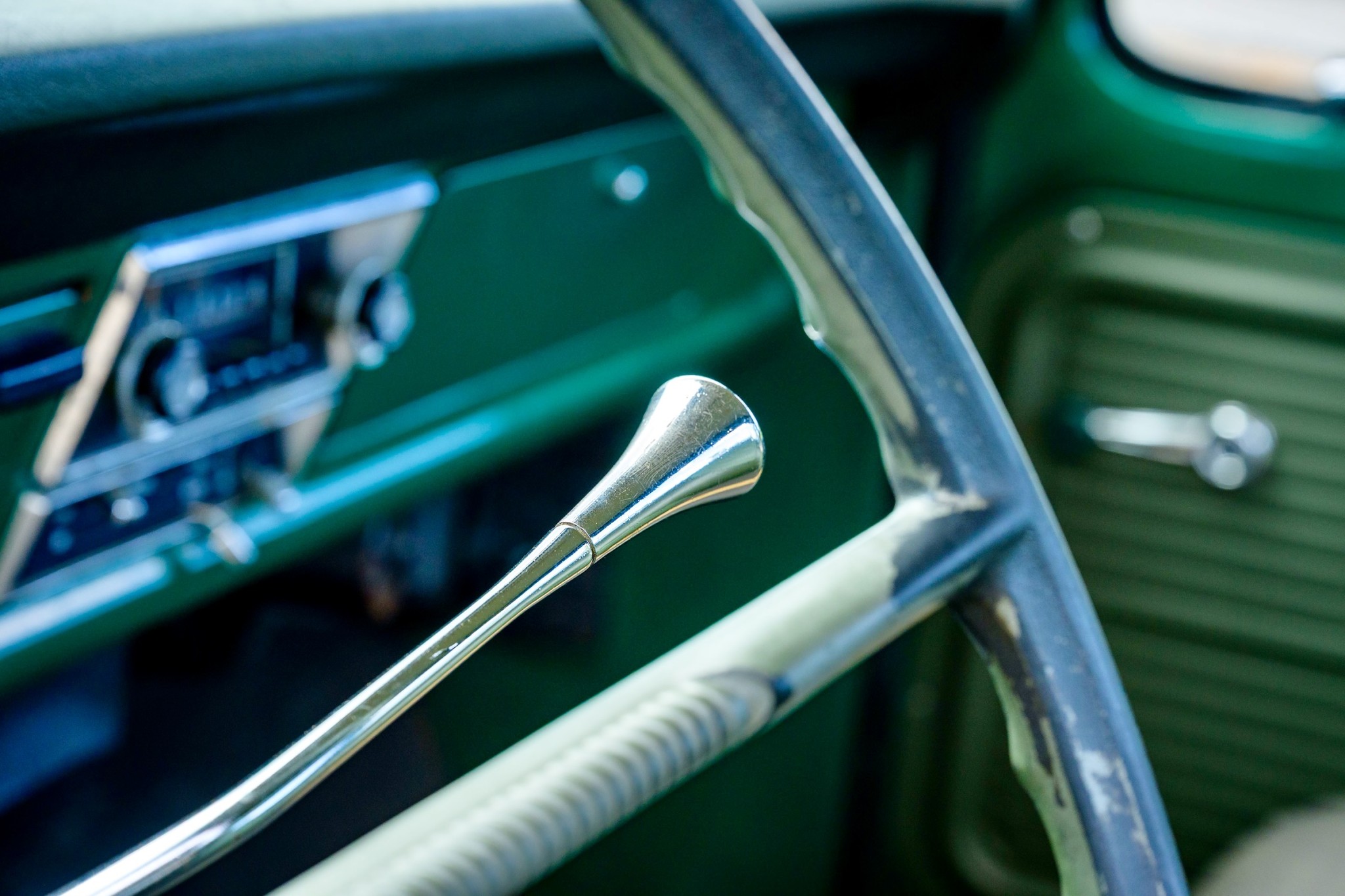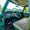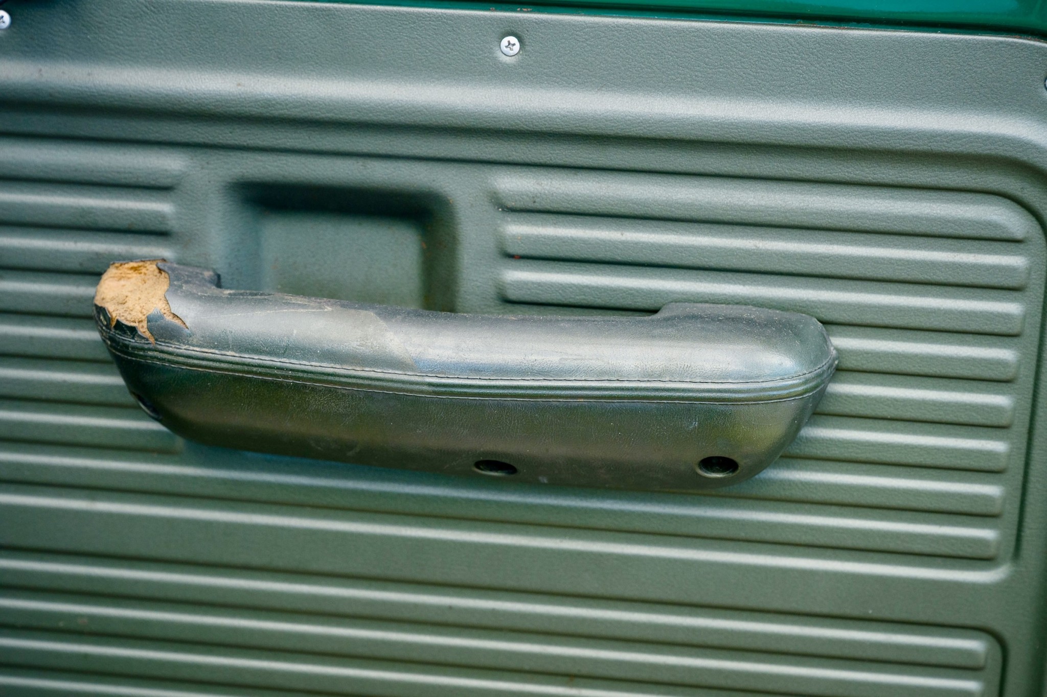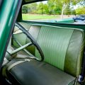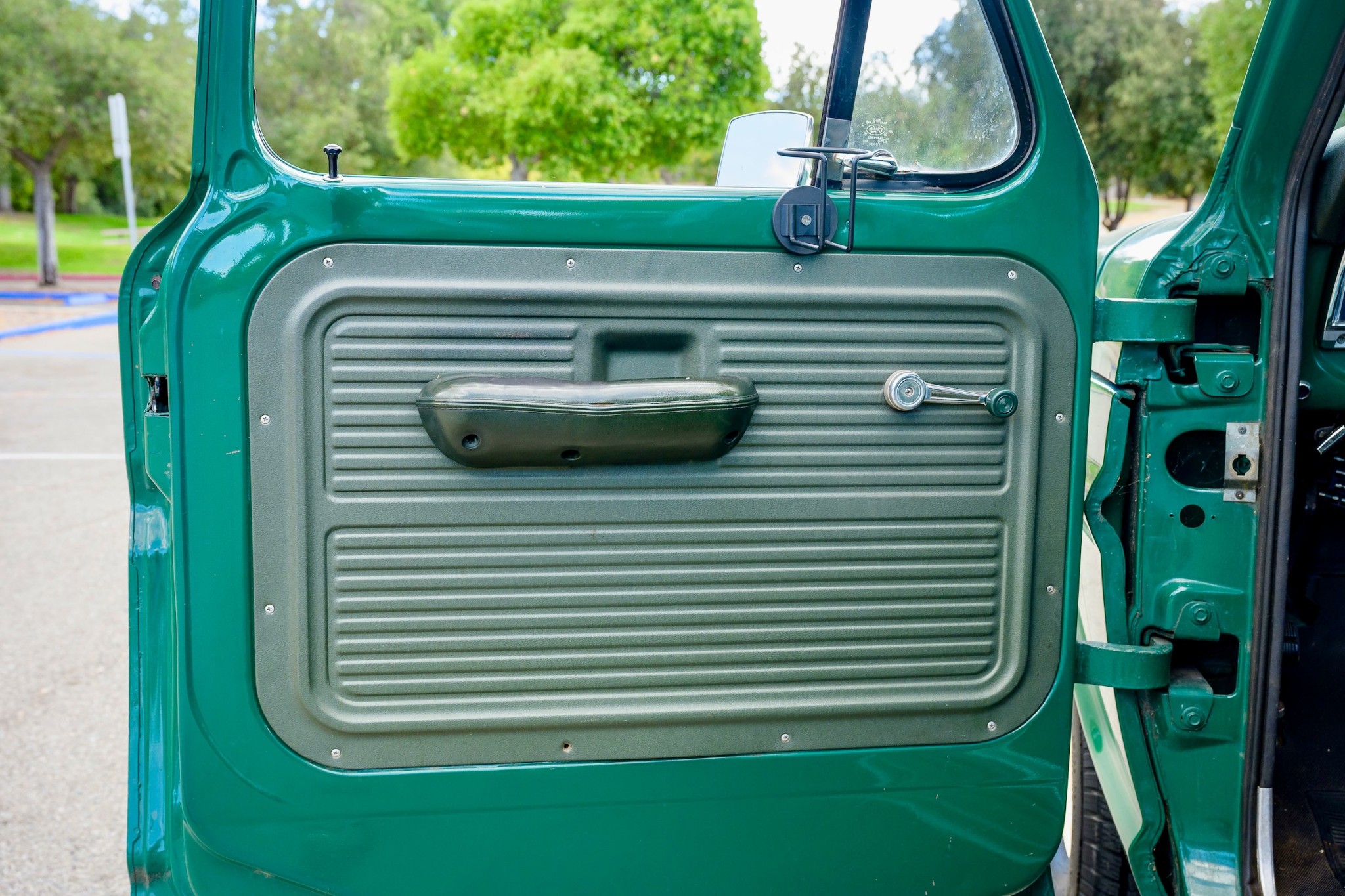 As far as I know, none of the green interior pieces for this truck are available… I’ve seen a few colors available but not green (and if you look closely you’ll see that everything on the interior has the same green: door panels, arm rests, window crank knobs). I got the black vinyl seat upholstery with the truck but haven’t had it installed because I’d really rather get something custom done that is closer to the original.