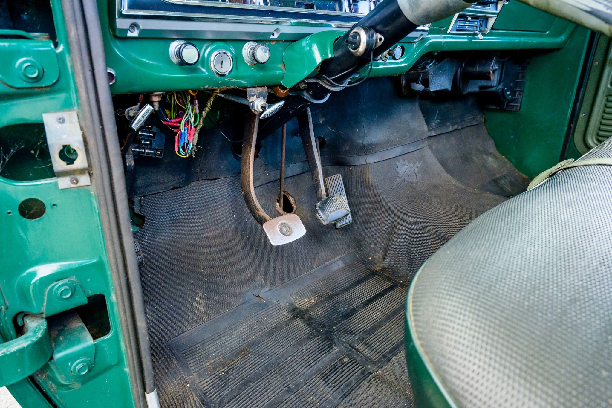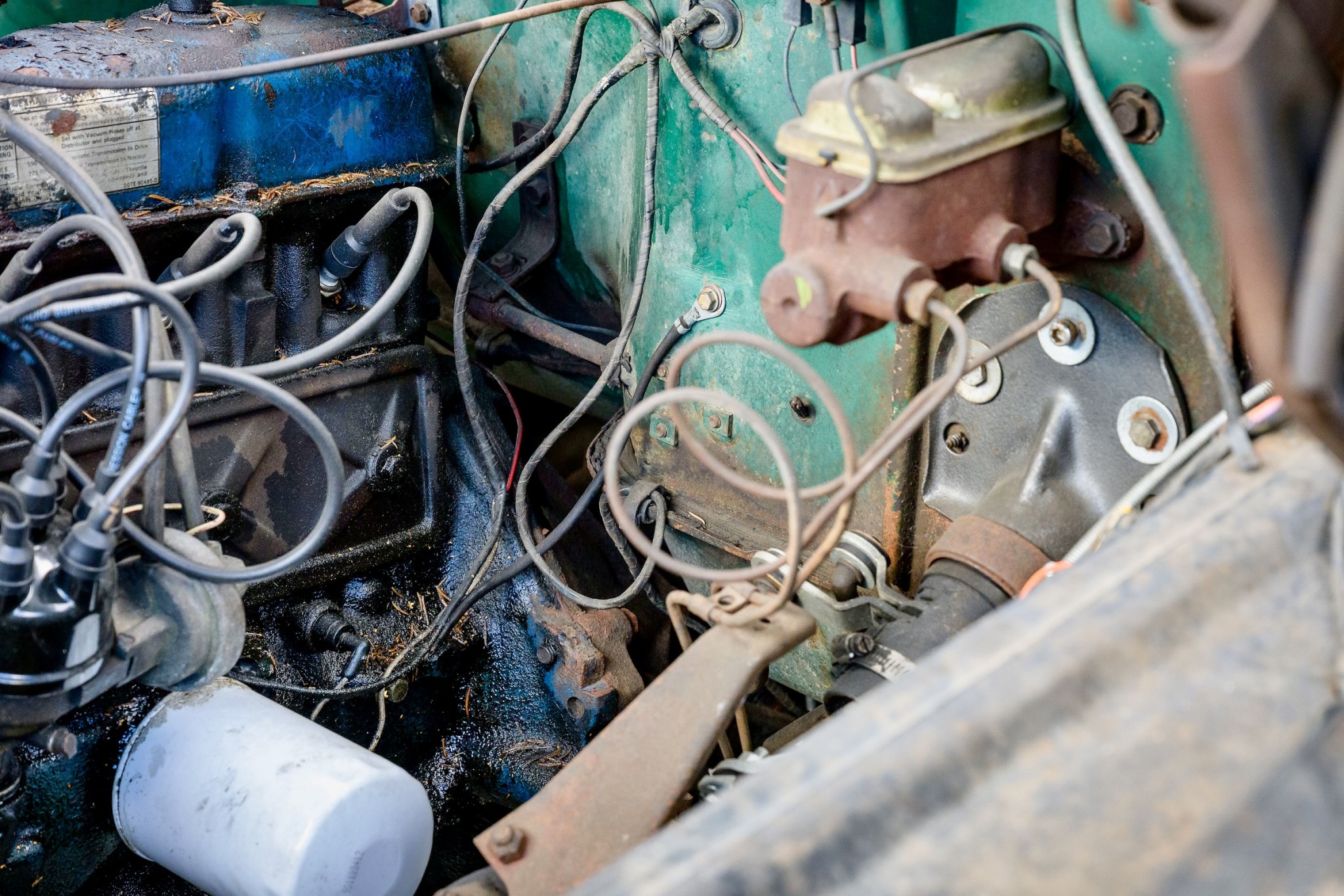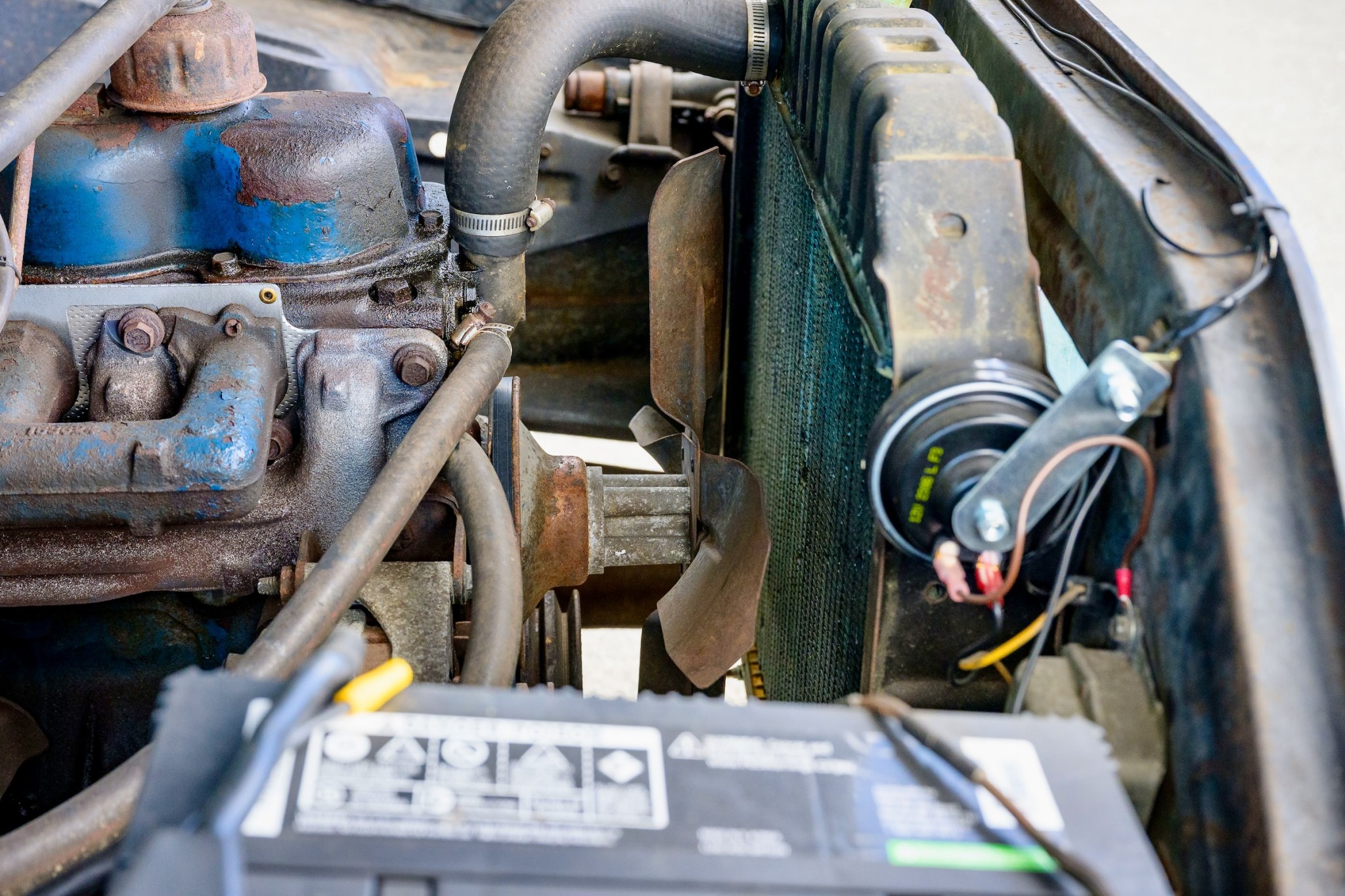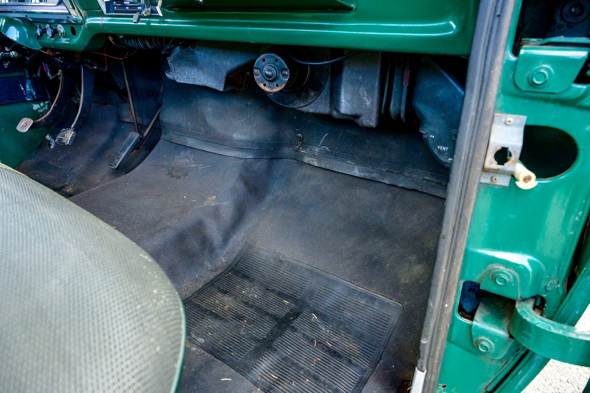 Inside, the cab remains largely original. The bench seat has a rip on the passenger side, but a new black vinyl upholstery kit is included with the sale. Other included spares are a replacement dash cover, cigar lighter, horn button, and miscellaneous parts. The seller notes a few quirks: the horn is wired to a separate button pending a thinner steering wheel nut, the overdrive lockout cable needs adjustment, and the brakes, while effective, feel a bit soft when warm.