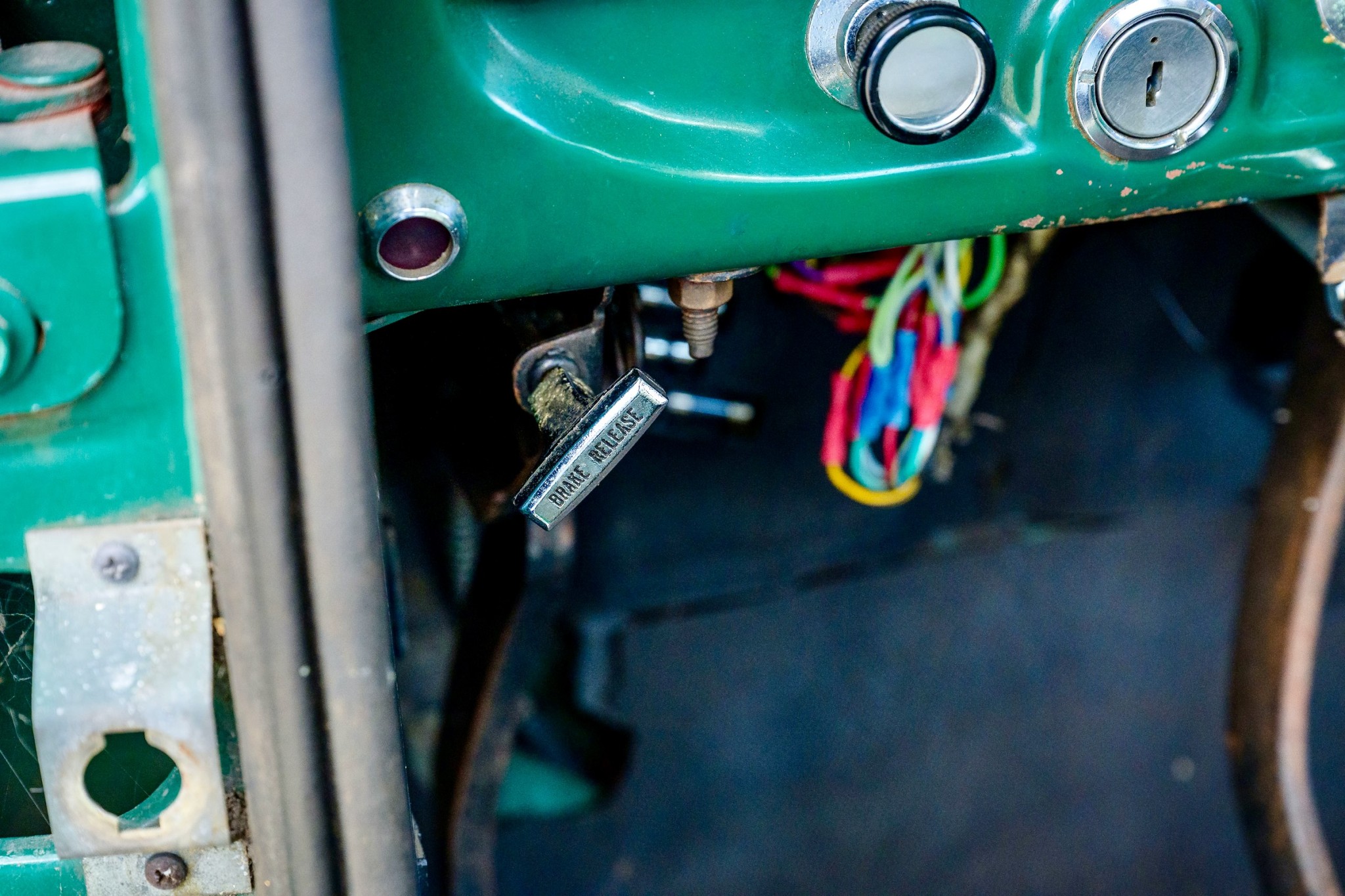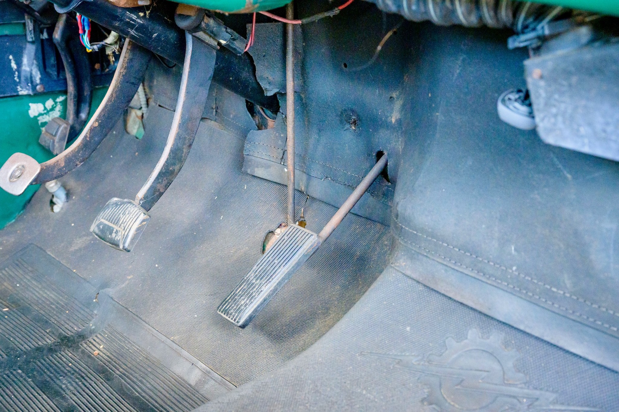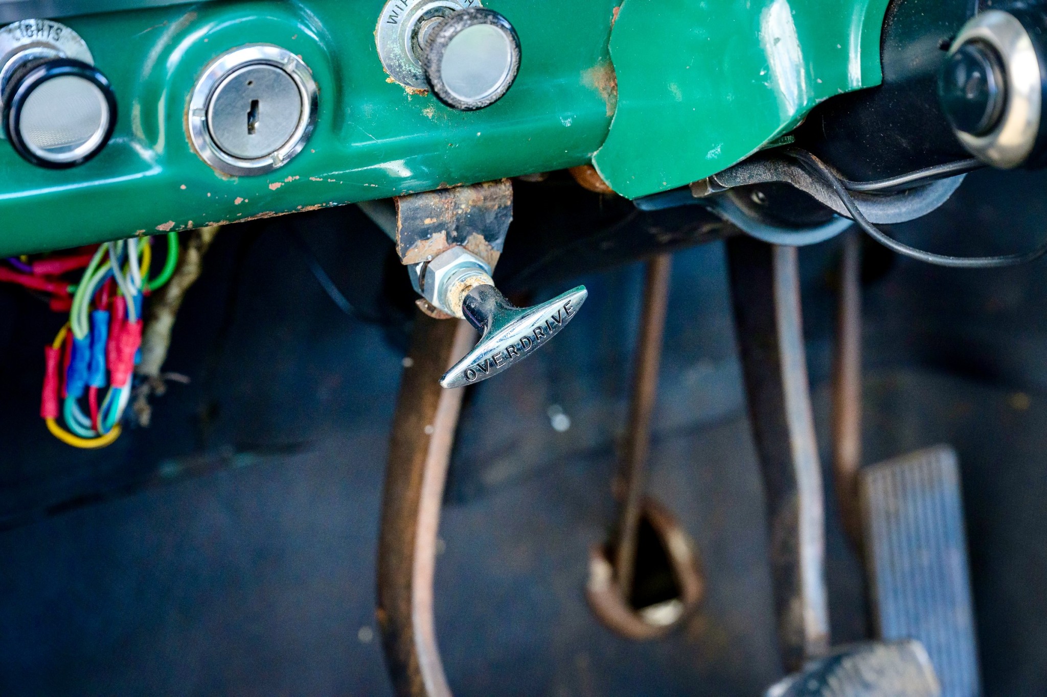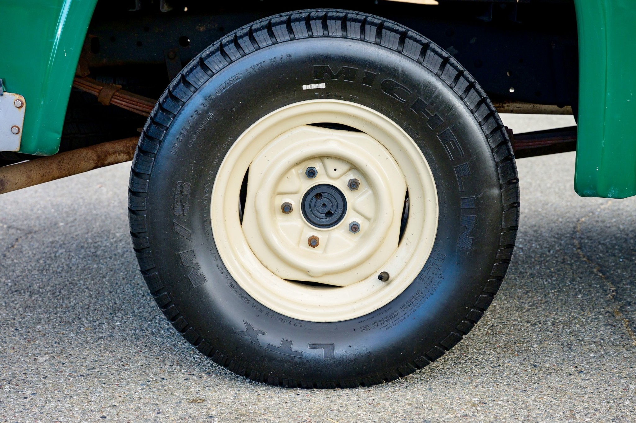 Inside, the cab remains largely original. The bench seat has a rip on the passenger side, but a new black vinyl upholstery kit is included with the sale. Other included spares are a replacement dash cover, cigar lighter, horn button, and miscellaneous parts. The seller notes a few quirks: the horn is wired to a separate button pending a thinner steering wheel nut, the overdrive lockout cable needs adjustment, and the brakes, while effective, feel a bit soft when warm.