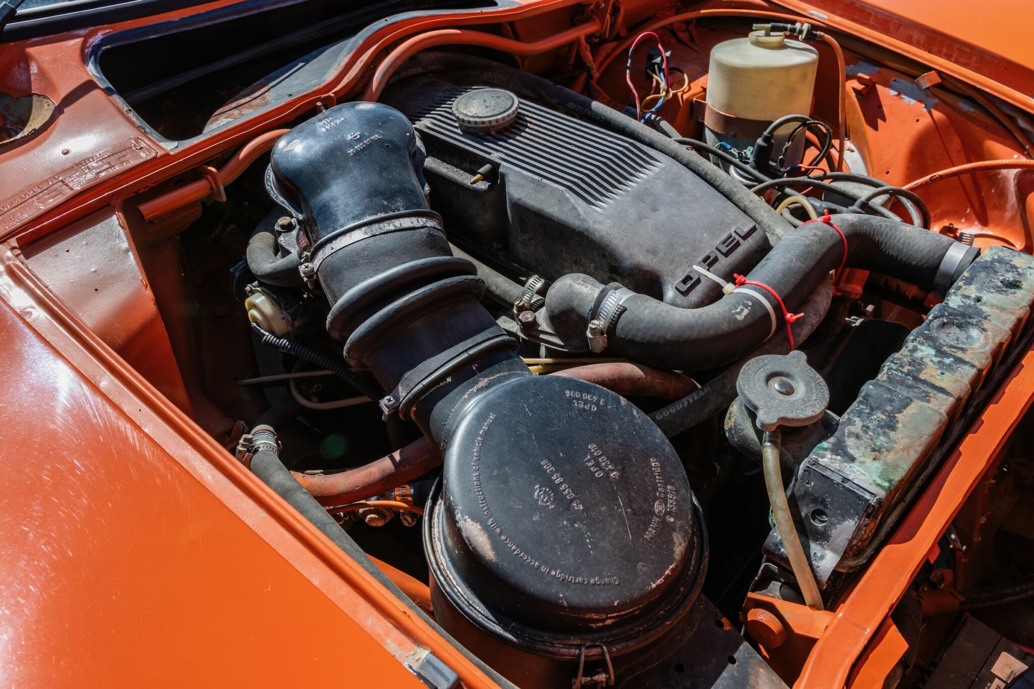 Here’s a closer look at the Opel CIH 1.9-liter engine. It was rated at 102 horsepower, which actually isn’t too bad considering the car weighs under 1,900 pounds. The camshaft in head design is something you don’t see often, with the camshaft mounted in the cylinder head next to the valves rather than above them. Performance-wise, it’s similar to an overhead cam design but allows for a thinner head and subsequently a lower hood line. This one runs great and sounds nice, but the engine bay could use a little work to tidy it up.