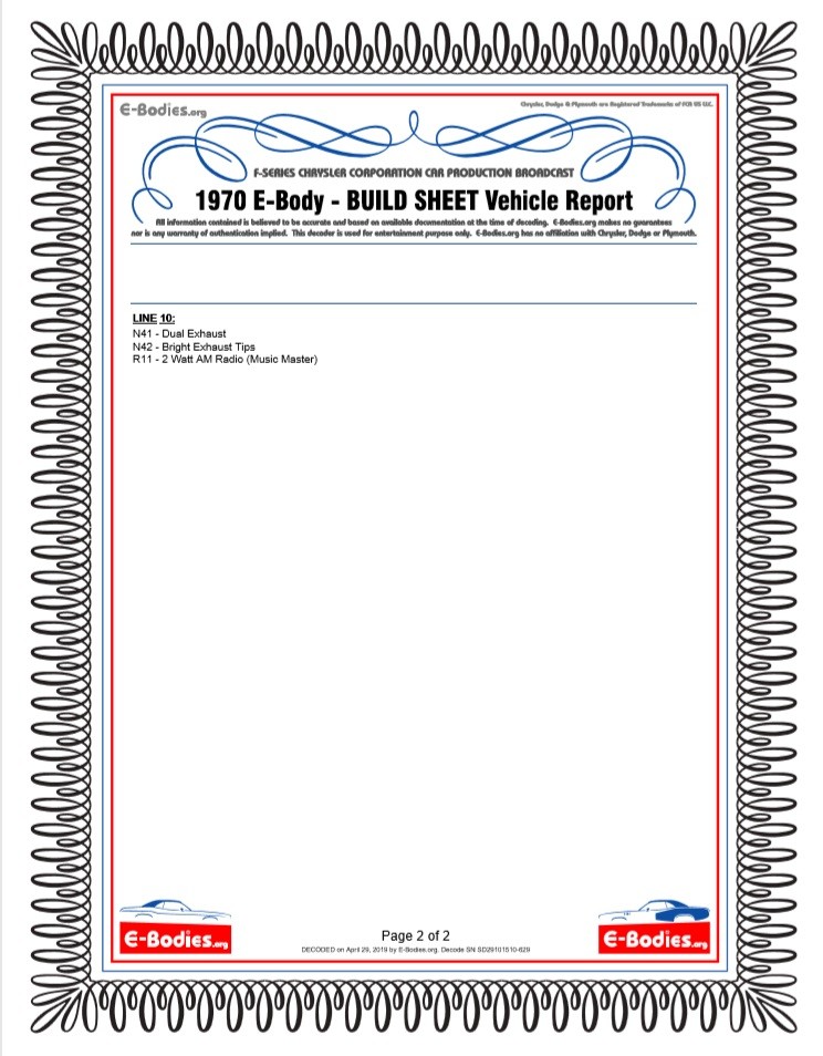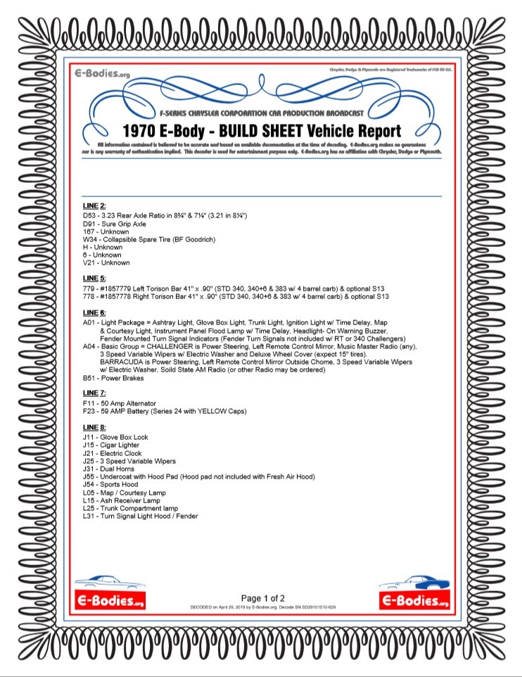 Decoding the car’s VIN, shows that this is a genuine Cuda and is equipped with the H-Code 340 V8. It’s paired to a 4-speed manual, making for a fun and desirable combination. She sent over photos of the Trim tag, the build sheet, the engine numbers, and the transmission numbers. Everything appears to be correct except for the transmission, which has been upgraded from a 3-speed. I managed to decode a fair amount of the Broadcast sheet and fender tag, which revealed that this was a very well optioned car. It received the Sport Hood, dual exhaust with bright tips, the Sure Grip Axle, the lamp package, vinyl roof, Music Master radio and a number of other options.