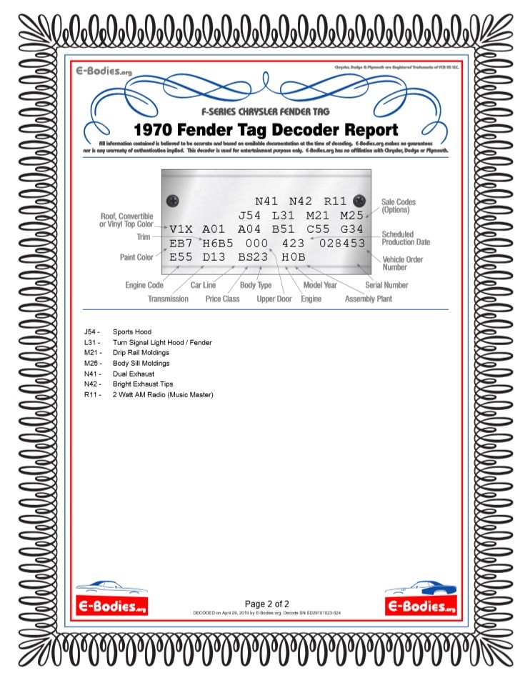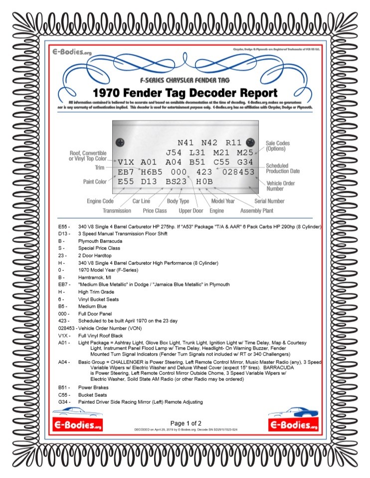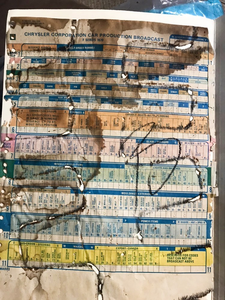 I just finished decoding the fender tag and as much of the broadcast sheet as I can read. I’ve added the results from e-bodies.org to the gallery. The color code shows that it left the factory in Jamaican Blue Metallic, which appears to be the color the car currently is.