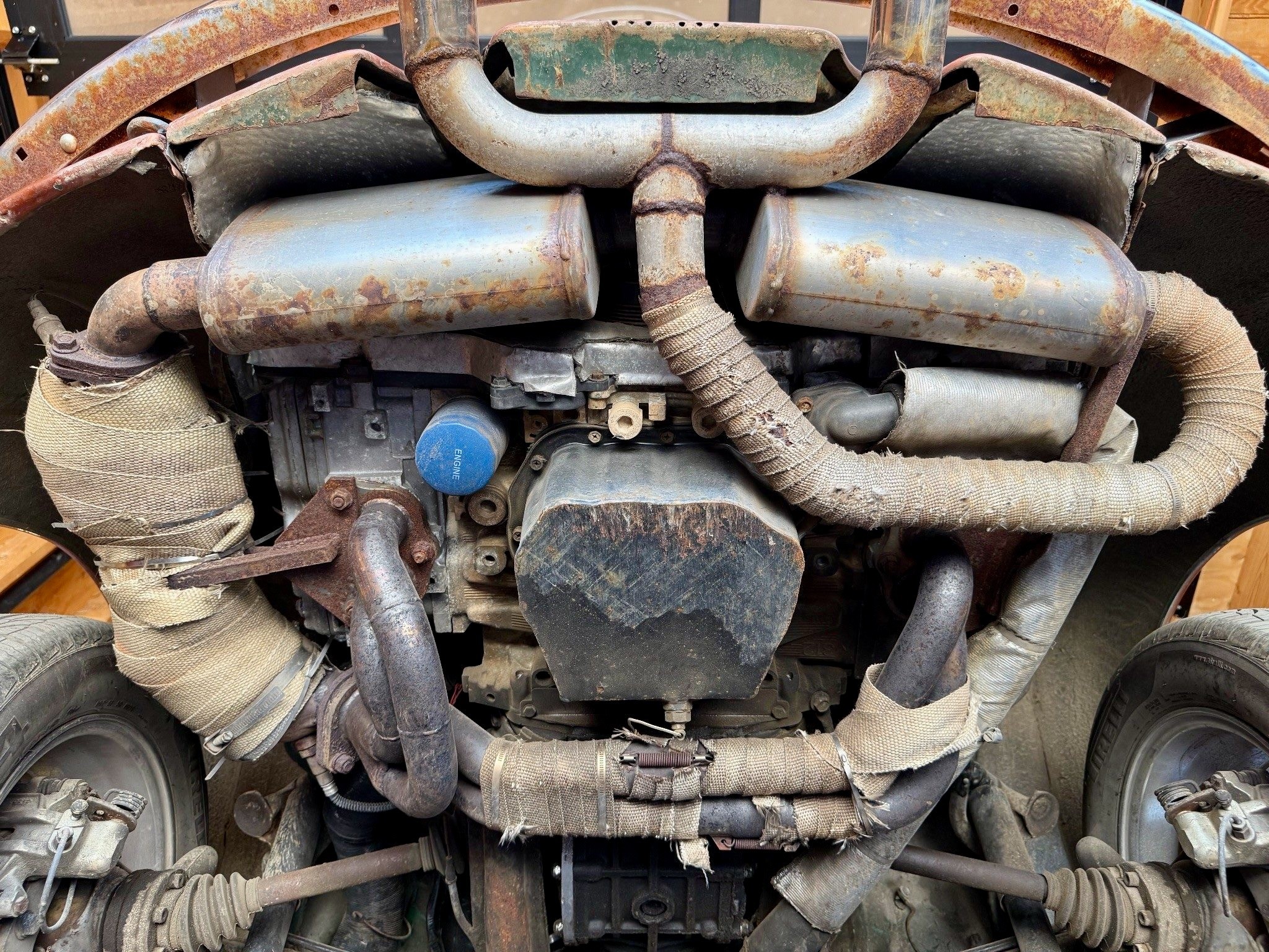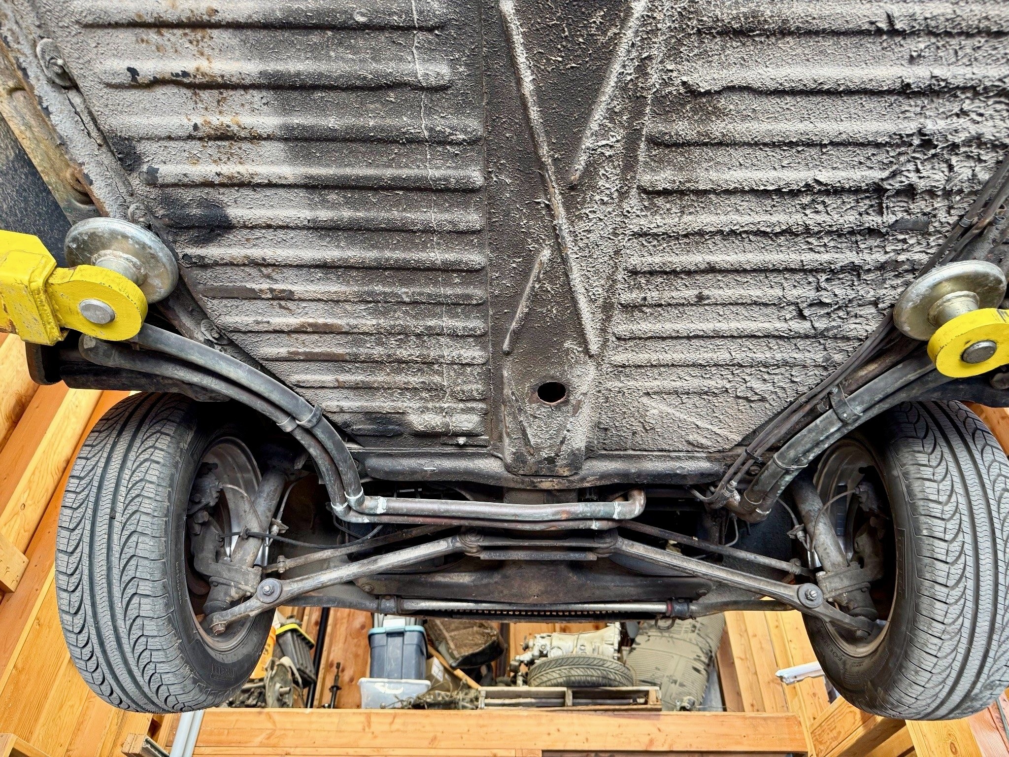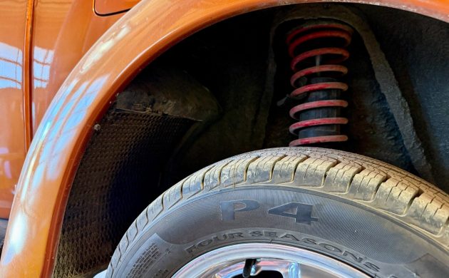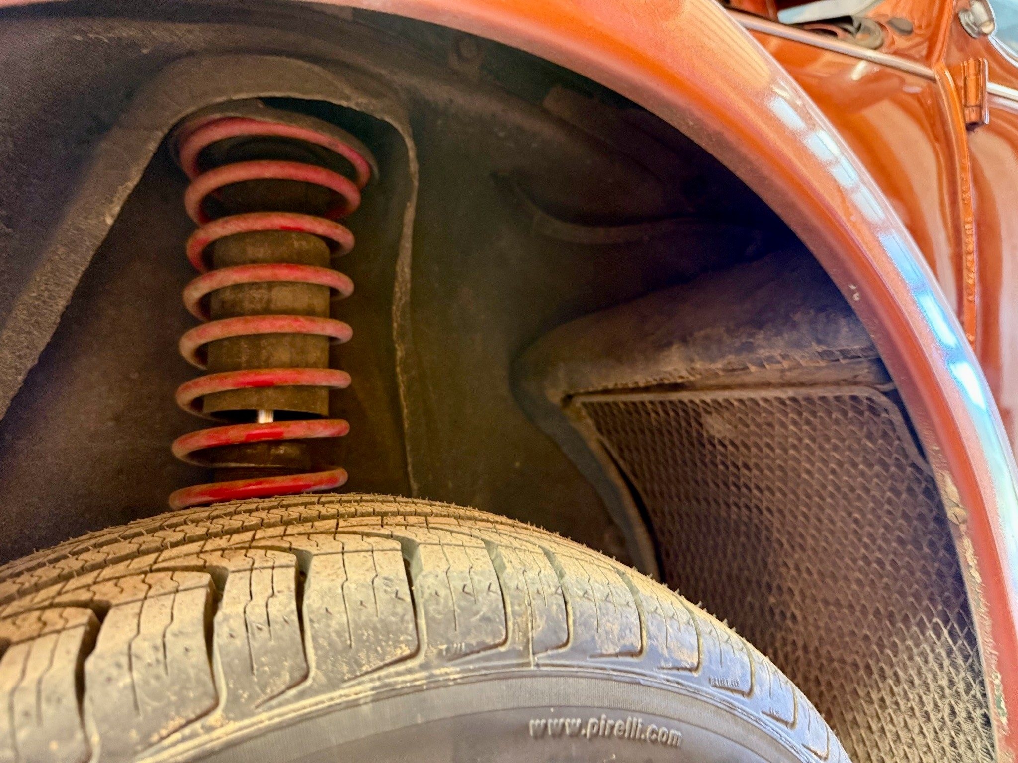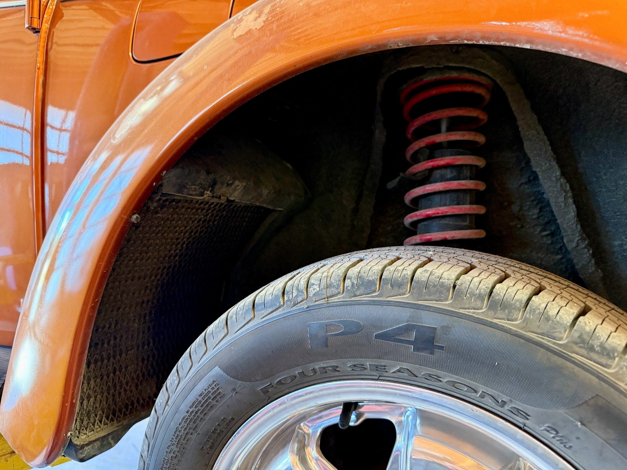 A four-wheel disc brake conversion with a Porsche lug pattern was fitted with Fuchs replica wheels and new Pirelli tires, they are 4.5” in the front and 6” in the rear. The front suspension was lowered, and new struts and rear shocks were installed. Front and rear stabilizer bars were fitted, and an upper strut brace and rear frame brace were installed. To recommission, I replaced the fuel tank, fuel pump, and sending unit. There is an issue with the speedometer, and the odometer operates intermittently. I am working to get the turn signals and wipers to work, and should have that sorted.