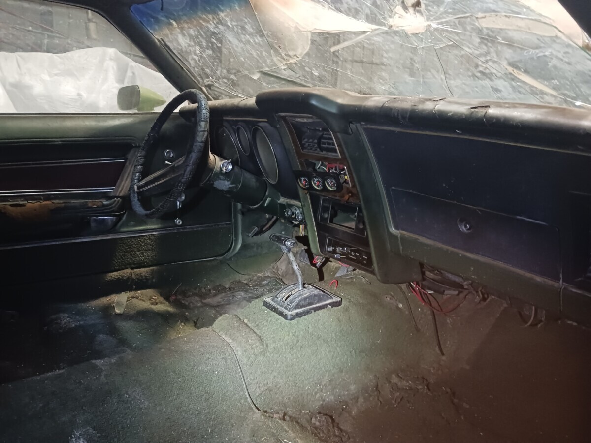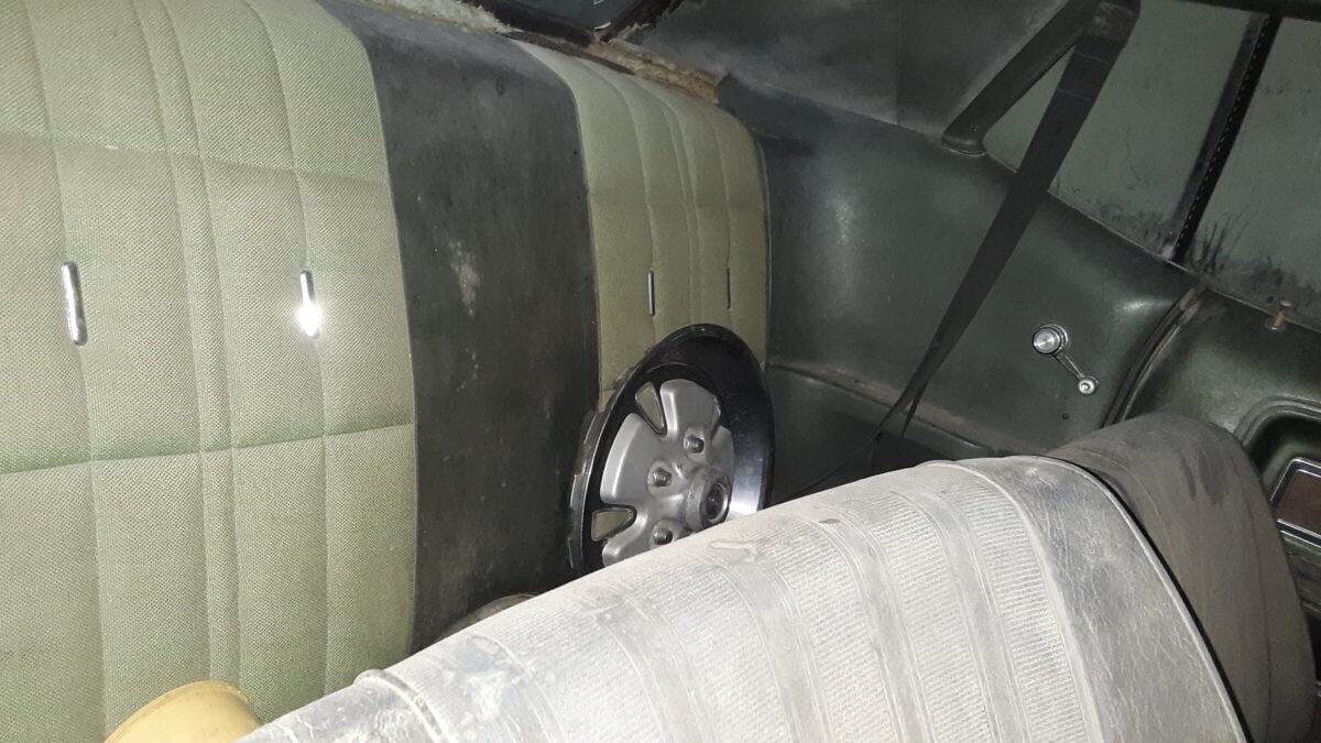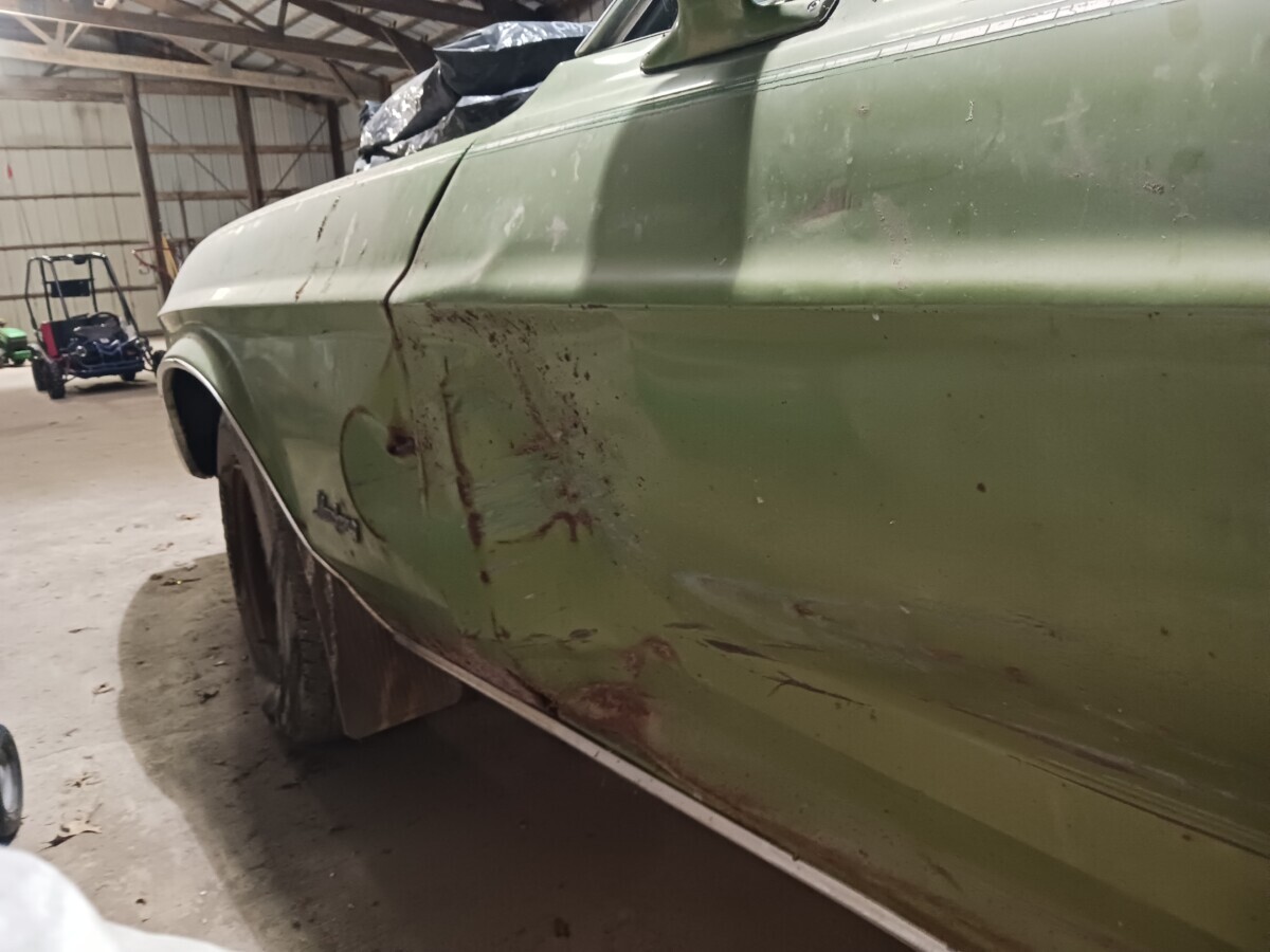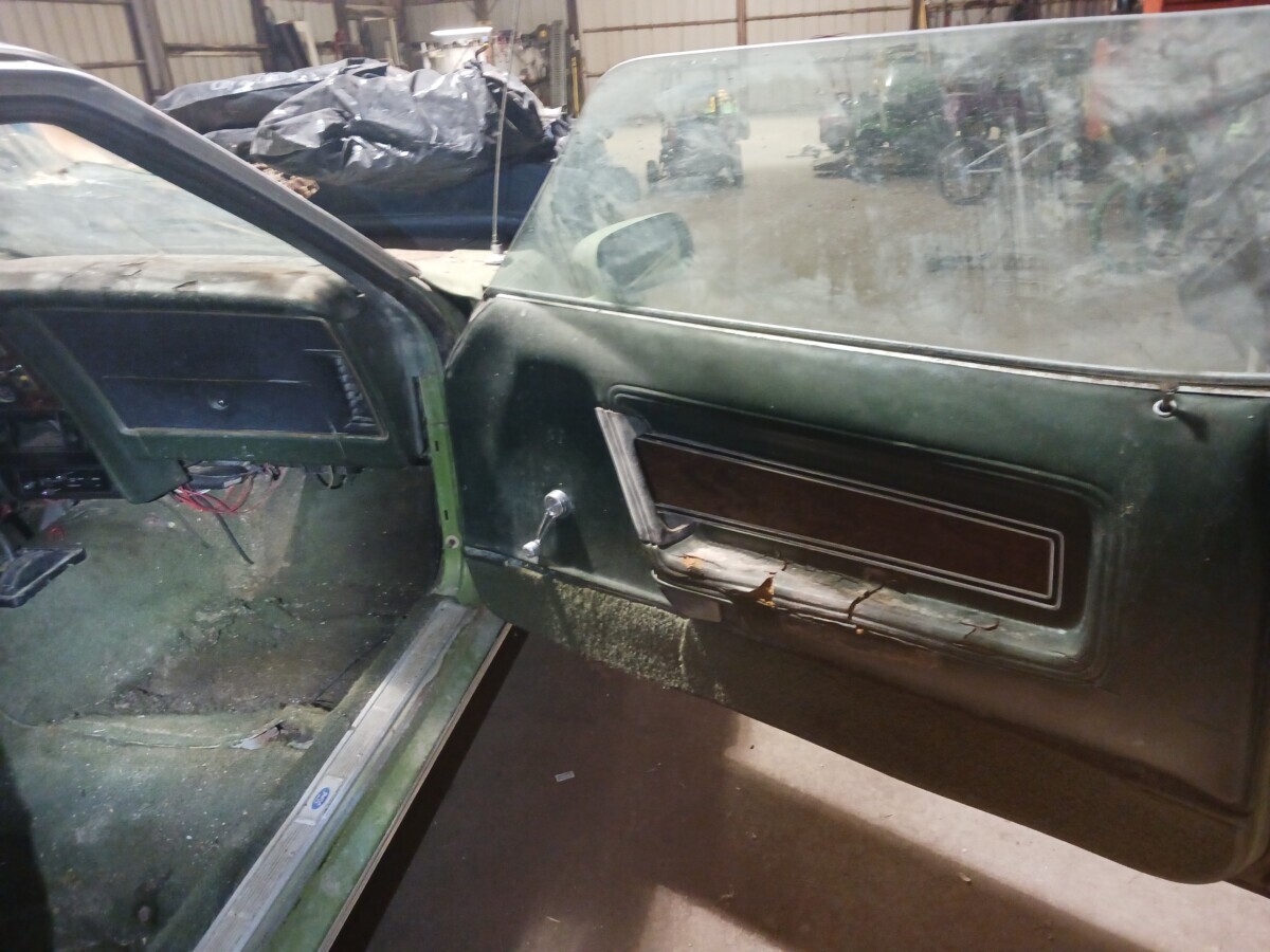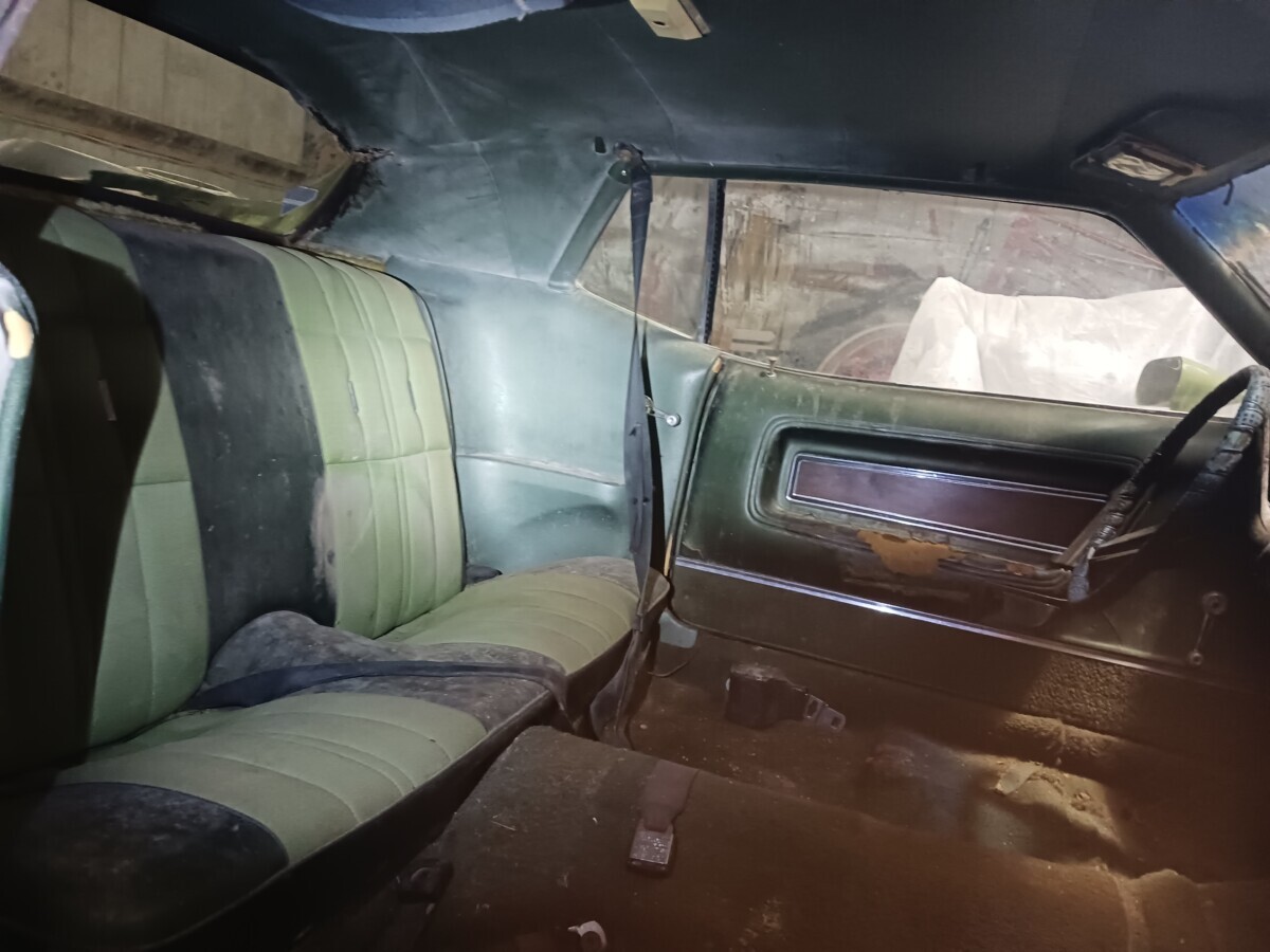 The seats don’t appear to be for a 1972 Mustang (high back buckets) and instead look like the kind you would find in a 67-70 Stang (Maybe Cougar!). One hubcap inside and more standing up at the rear of the barn so that’s a good thing. I’m not sure using the term “t-boned” applies here as it looks like a low speed parking lot incident and not what one would normally expect of a t-bone incident at speed. Good luck to the seller…I think that green paint and vinyl could be cleaned up and this car could scream 1972 again!