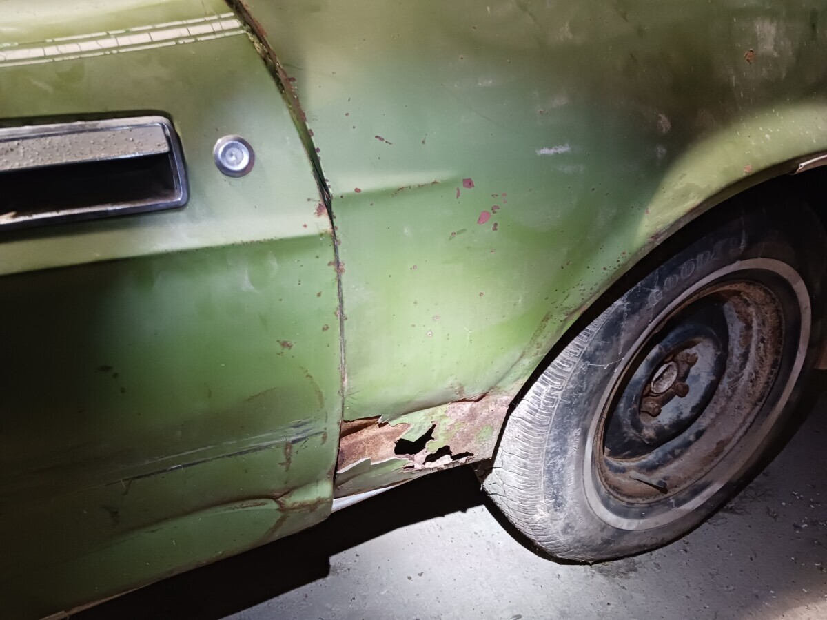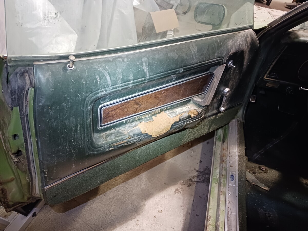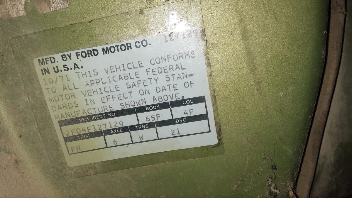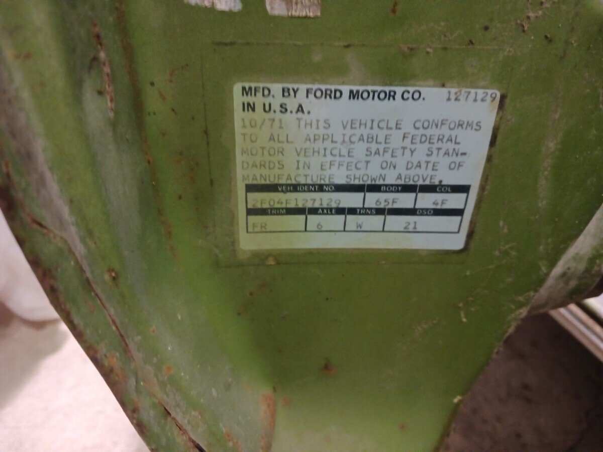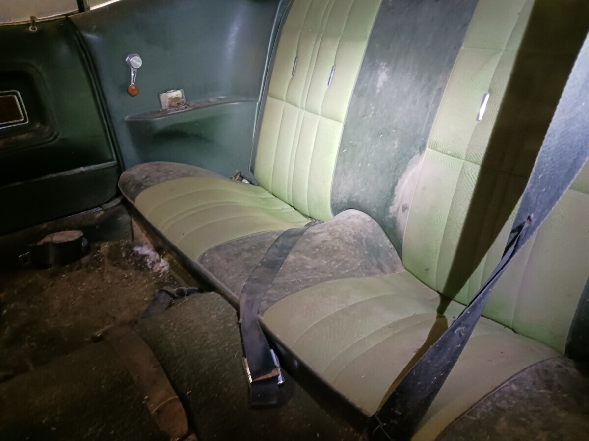 The seats don’t appear to be for a 1972 Mustang (high back buckets) and instead look like the kind you would find in a 67-70 Stang (Maybe Cougar!). One hubcap inside and more standing up at the rear of the barn so that’s a good thing. I’m not sure using the term “t-boned” applies here as it looks like a low speed parking lot incident and not what one would normally expect of a t-bone incident at speed. Good luck to the seller…I think that green paint and vinyl could be cleaned up and this car could scream 1972 again!