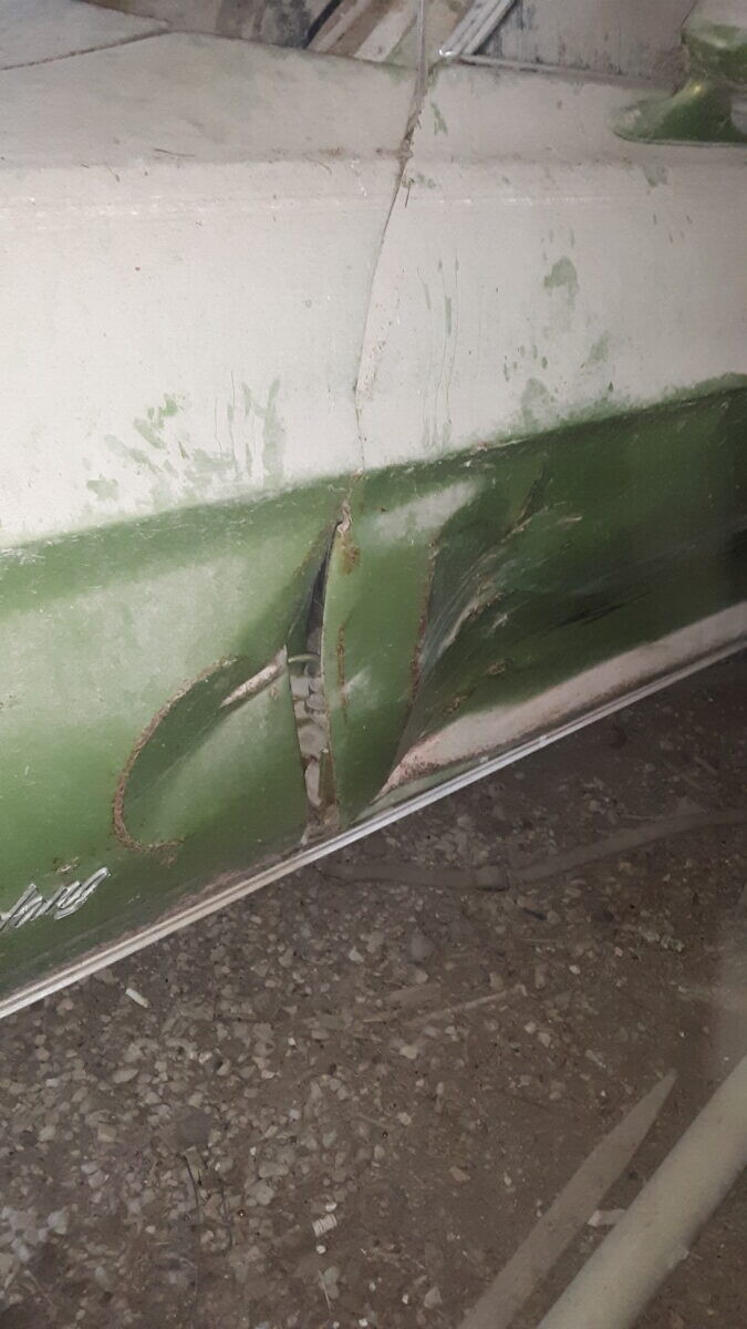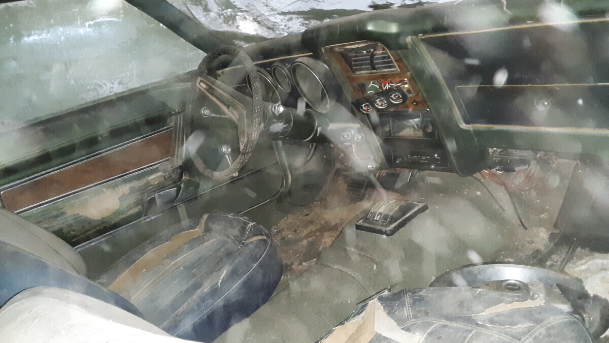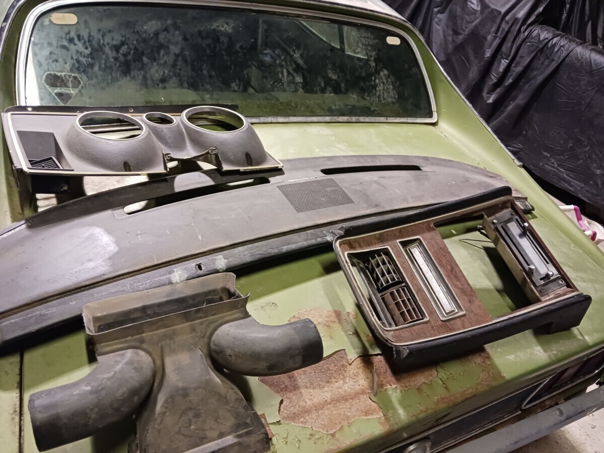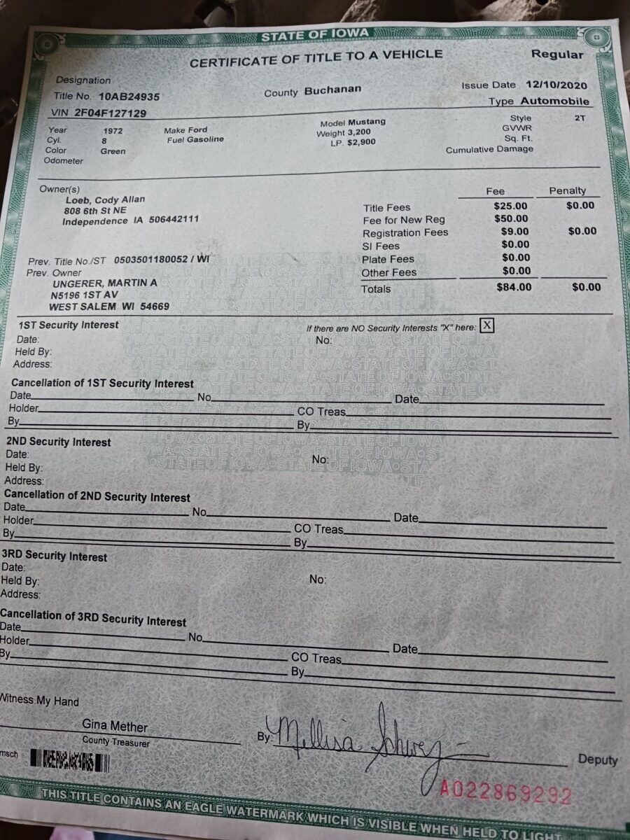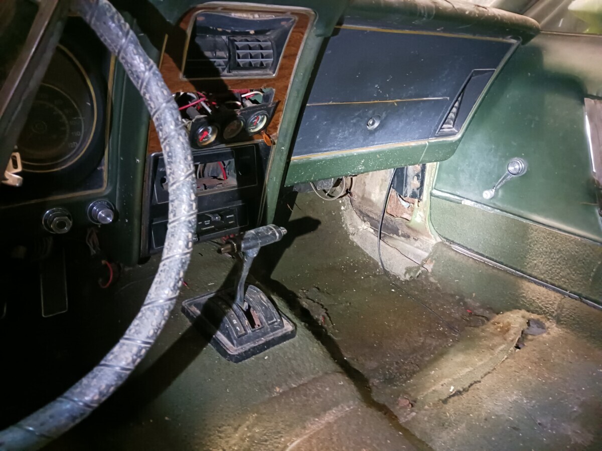The seats don’t appear to be for a 1972 Mustang (high back buckets) and instead look like the kind you would find in a 67-70 Stang (Maybe Cougar!). One hubcap inside and more standing up at the rear of the barn so that’s a good thing. I’m not sure using the term “t-boned” applies here as it looks like a low speed parking lot incident and not what one would normally expect of a t-bone incident at speed. Good luck to the seller…I think that green paint and vinyl could be cleaned up and this car could scream 1972 again!