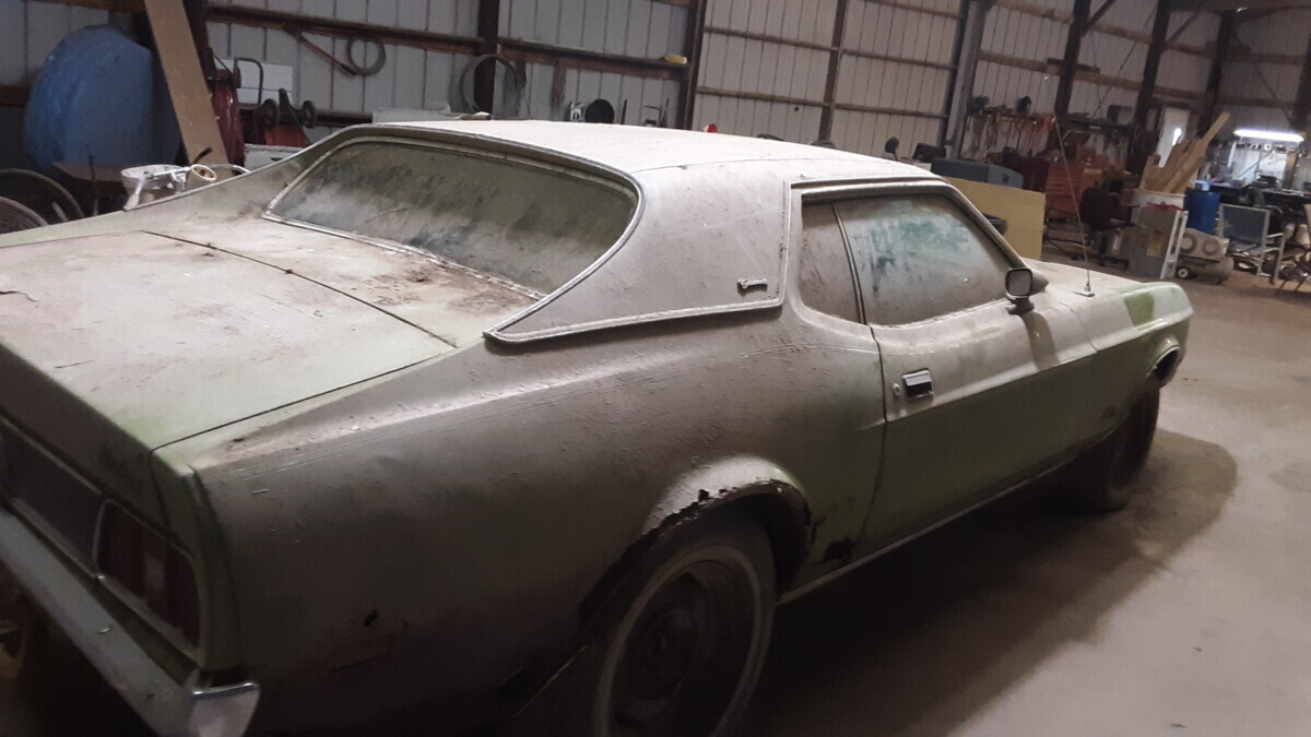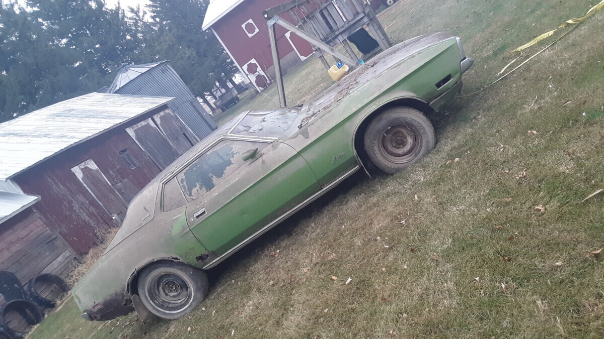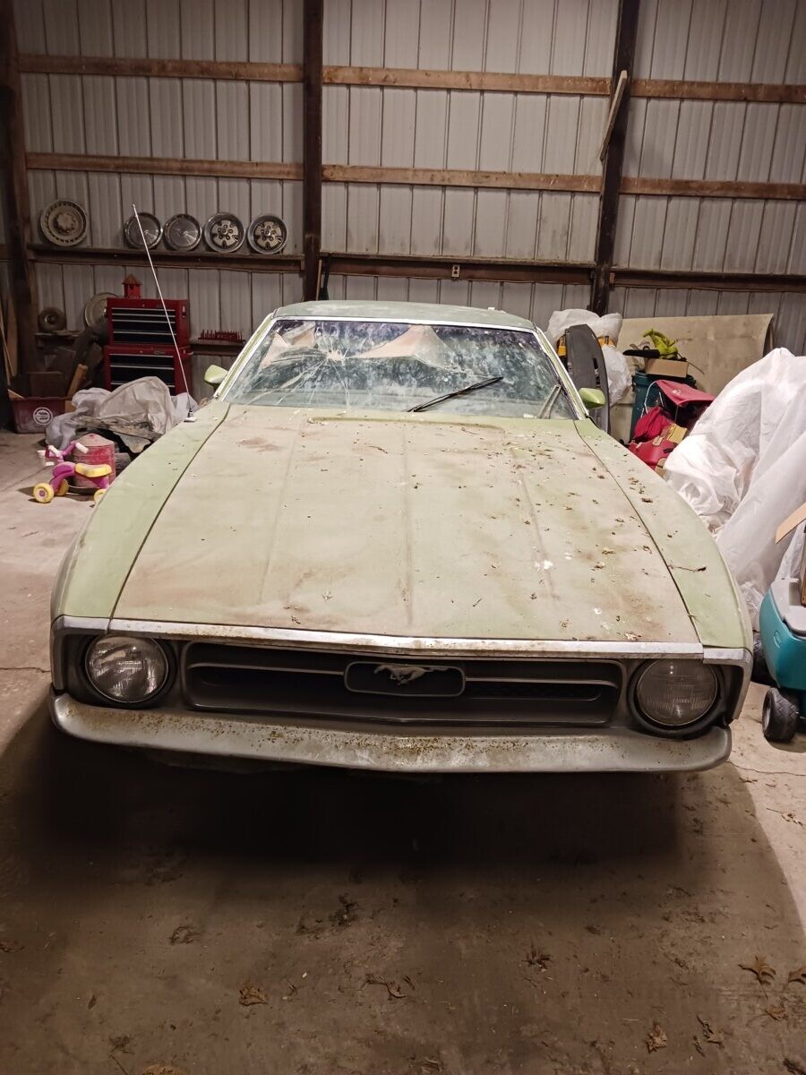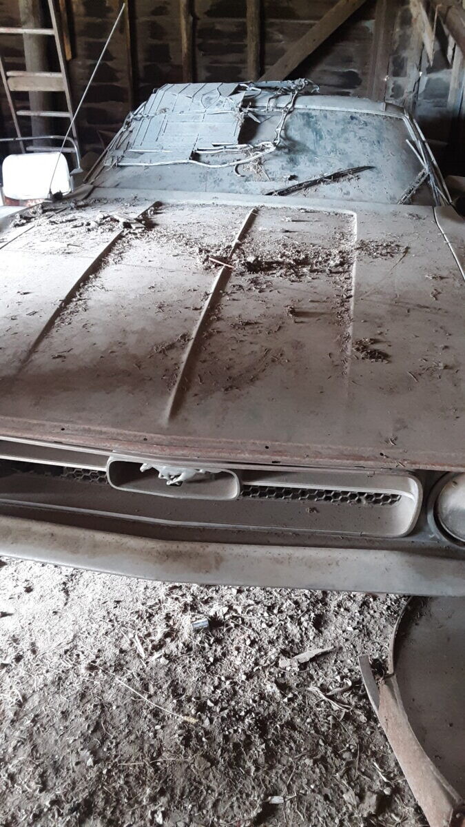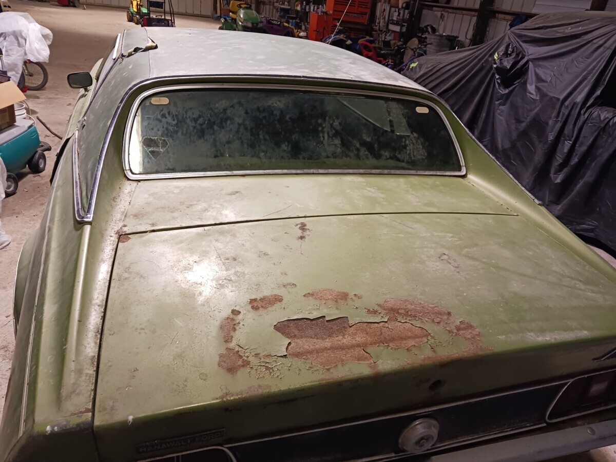 The dirt floor barn was falling down, something fell from the loft and hit the window. I was just glad to get it out before it got crushed. I know it’s not the most desirable model but they can’t all be fastback,mach1 , boss or shelby with manual shift, at least it has a v8.