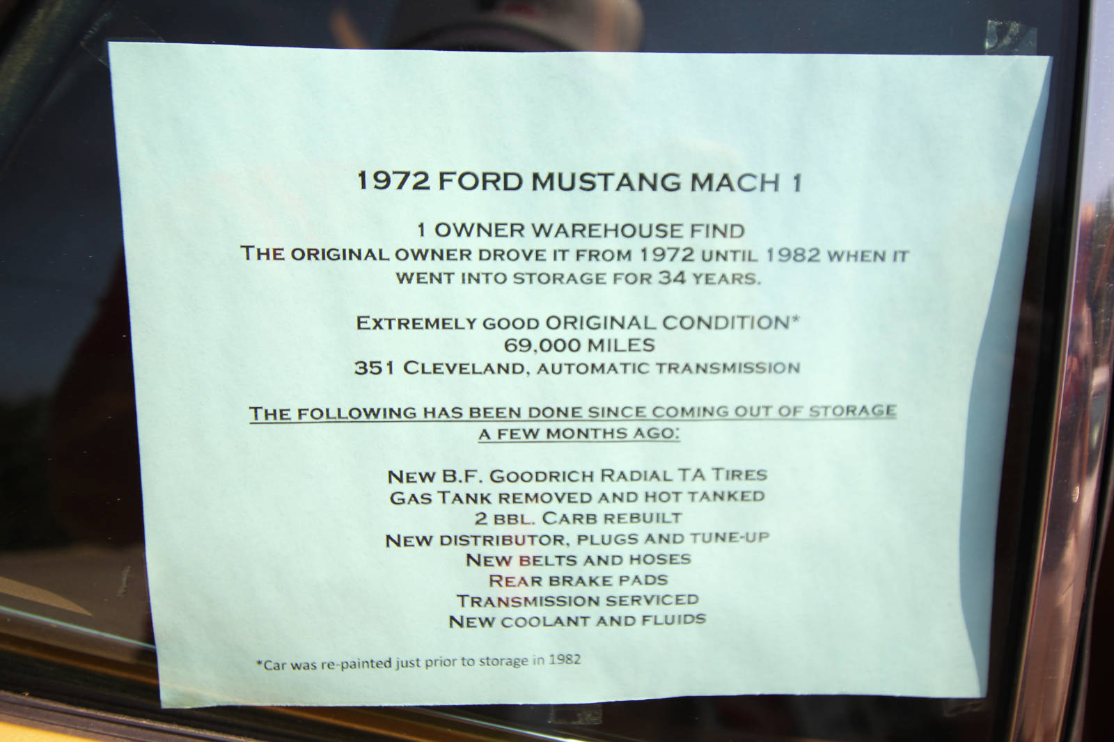 Seller’s Description: 1972 Mustang Mach 1. Still registered to the original owner. Warehouse find. Unrestored in extremely good original condition. 351 Cleveland engine, automatic transmission. The original owner drove it from 1972 until about 1982 when it went into warehouse storage for 34 years. The car was repainted the original color before it went into storage. The following has been done since coming out of storage last year. New B.F. Goodrich Radial TA tires. Gas tank removed and cleaned. Carb rebuilt. Tune-up. New belts and hoses. New rear brakes. Transmission serviced. New coolant and fluids. Engine compartment detailed. The interior is extremely clean. There is a small seam separation in the drivers seat as shown in pictures. The car drives and handles very well.
