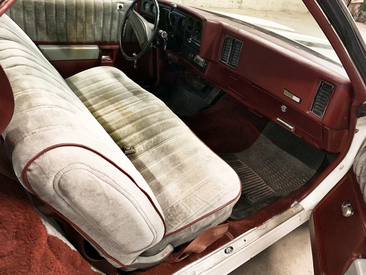 The seats are a plush material. That’s the way they look. They are not dirty. I thought my 84 Mercury Cougar’s interior looked oily when I got it off a trade, but it wasn’t oily after all. I like plush material. It looks good. I don’t see many cars with it.