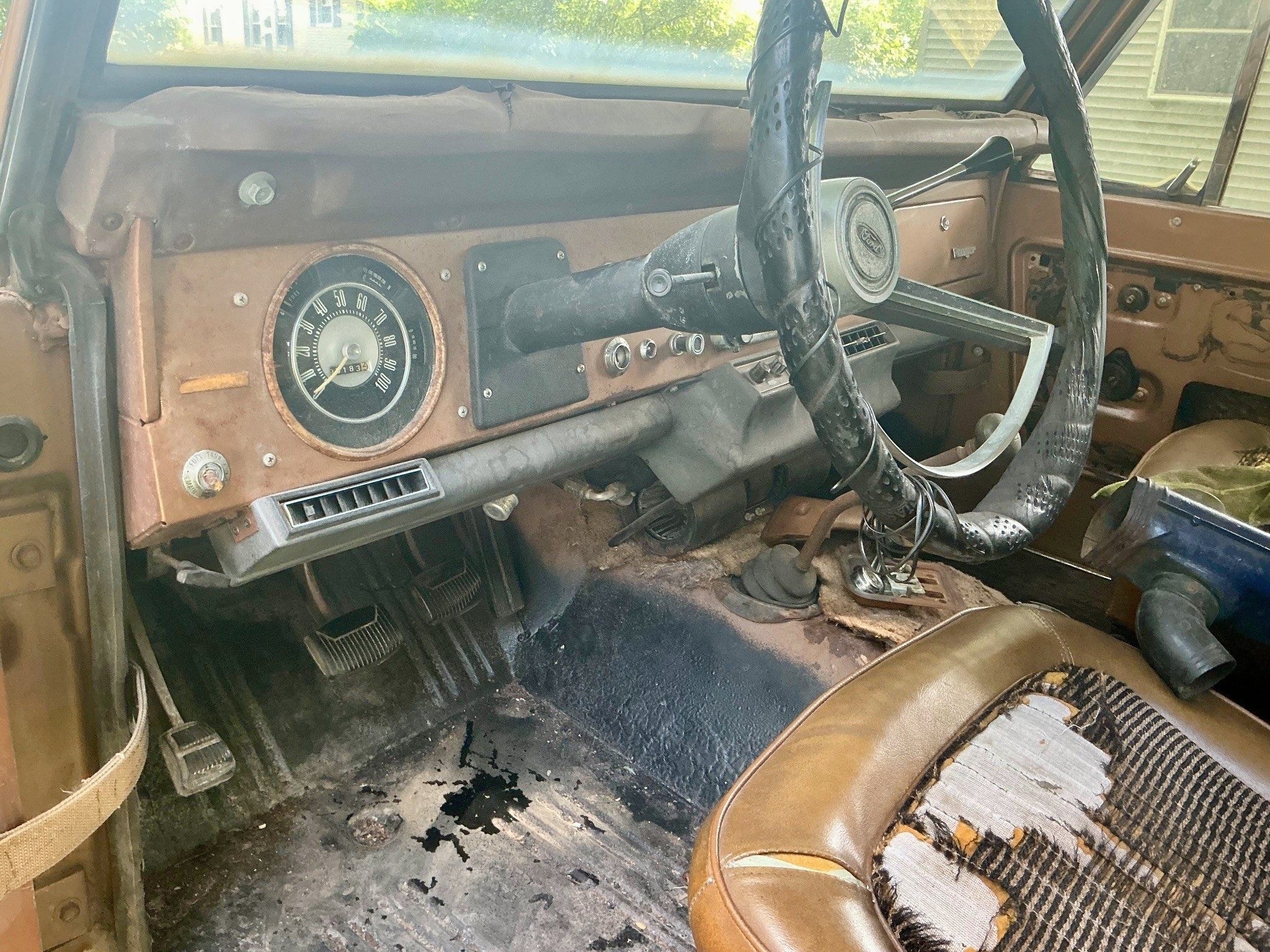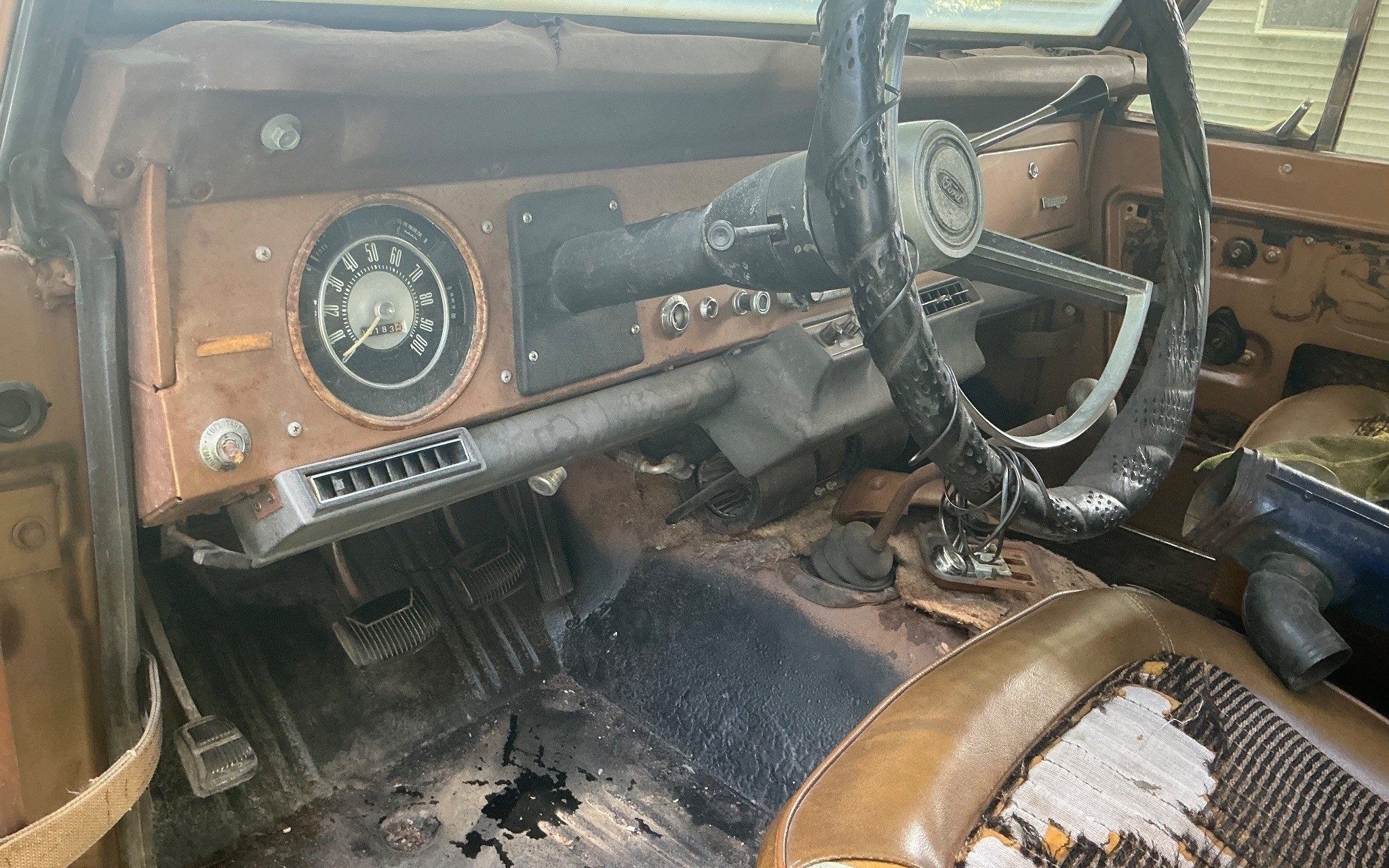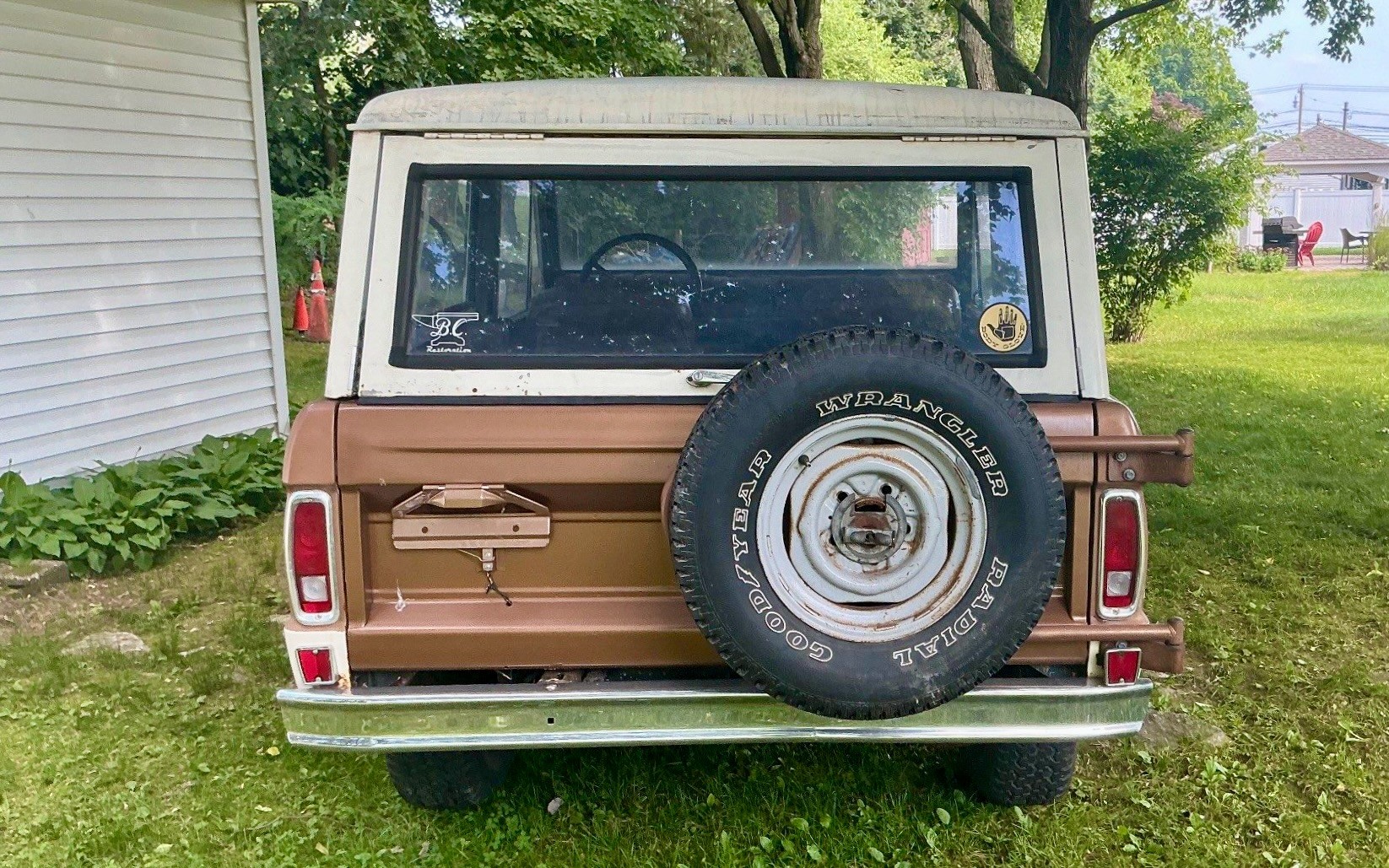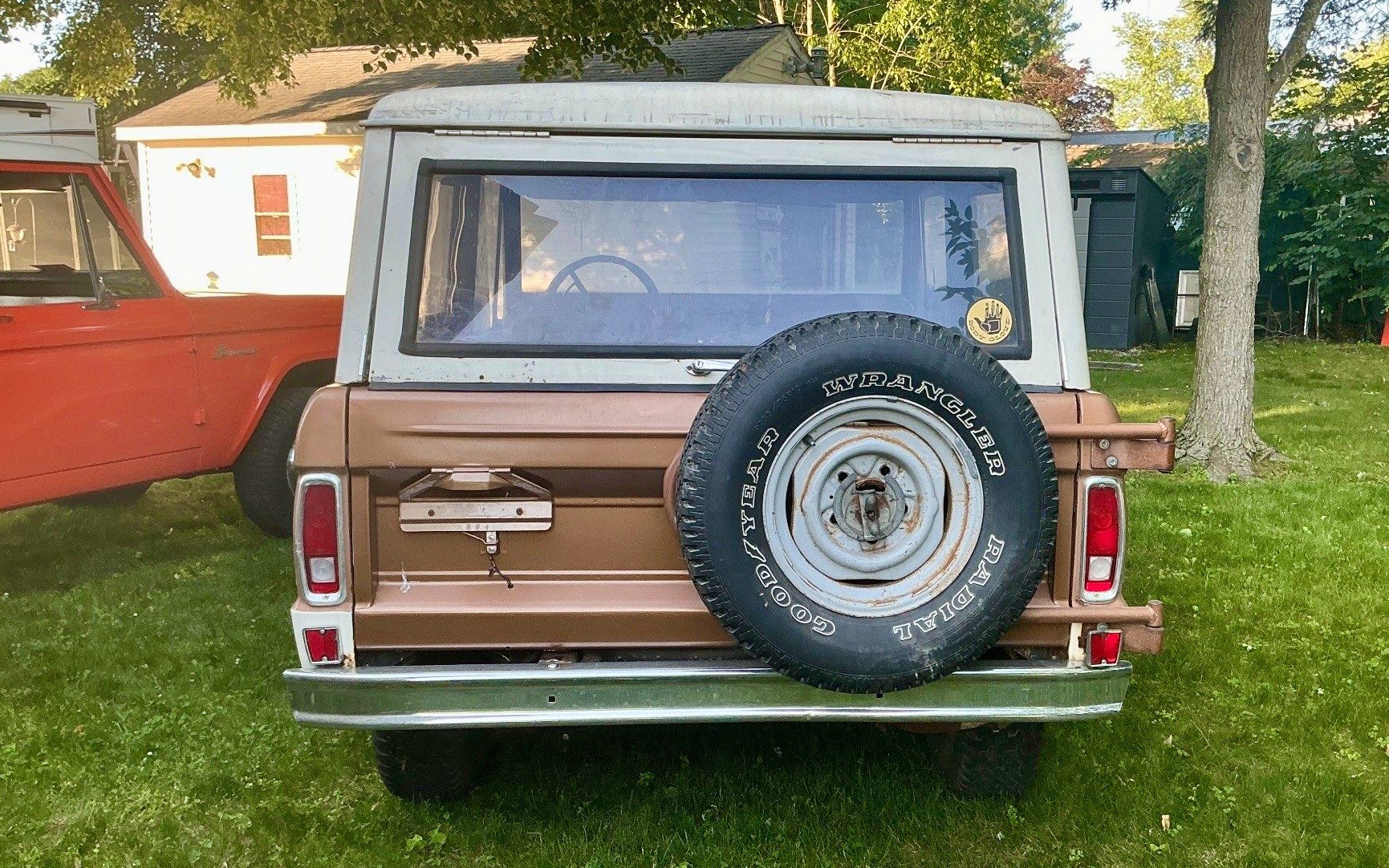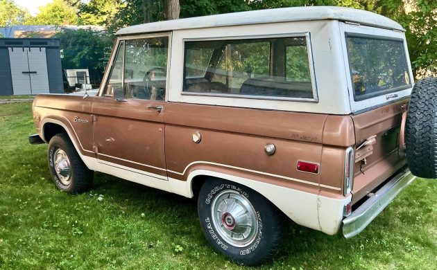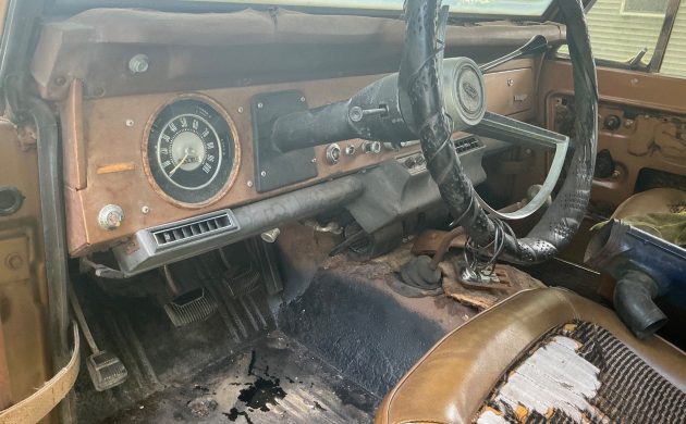 The interior has the “Ranger Package,” too. That included a color-keyed instrument panel, full carpeting (missing here), cloth-and-vinyl seat trim (in ginger on this truck), hood and lower bodyside tape stripes, swing-away spare tire carrier, and more. The interior will need some work, but the Bronco is so popular that you’ll spend days flipping through parts catalogs from various suppliers. One option that the original owner did not order was the automatic transmission, meaning that you’ll get a fully synchronized three-speed manual.