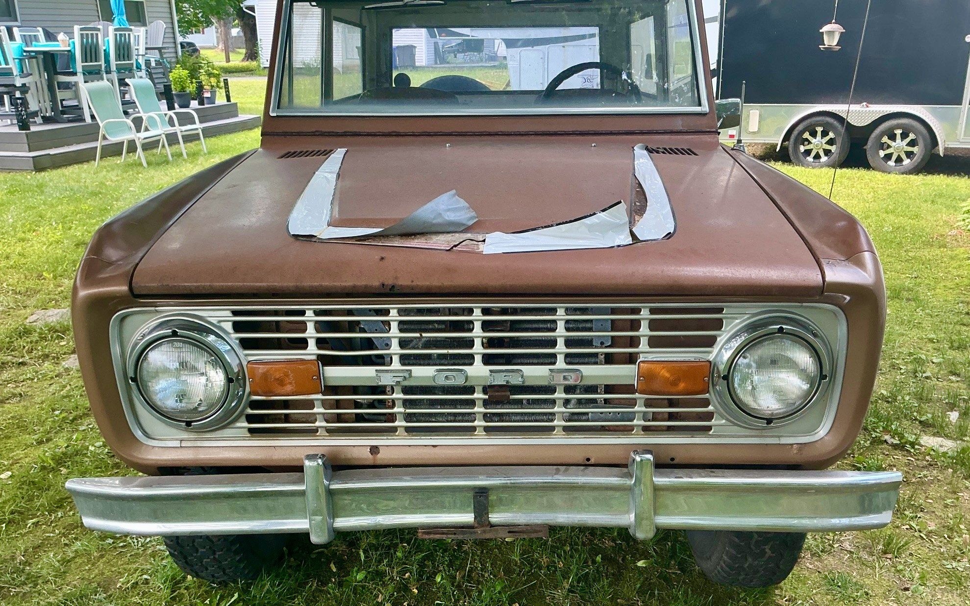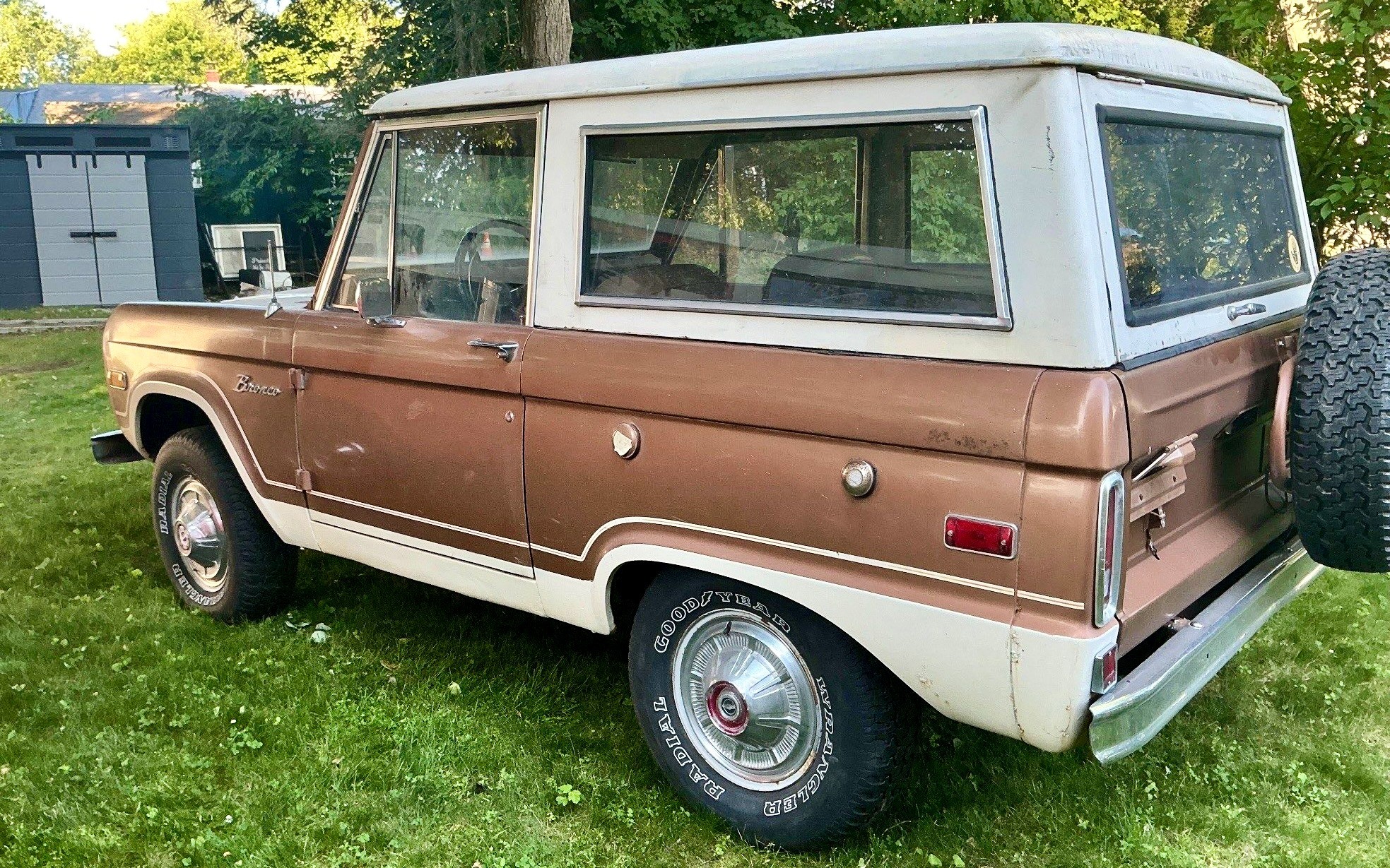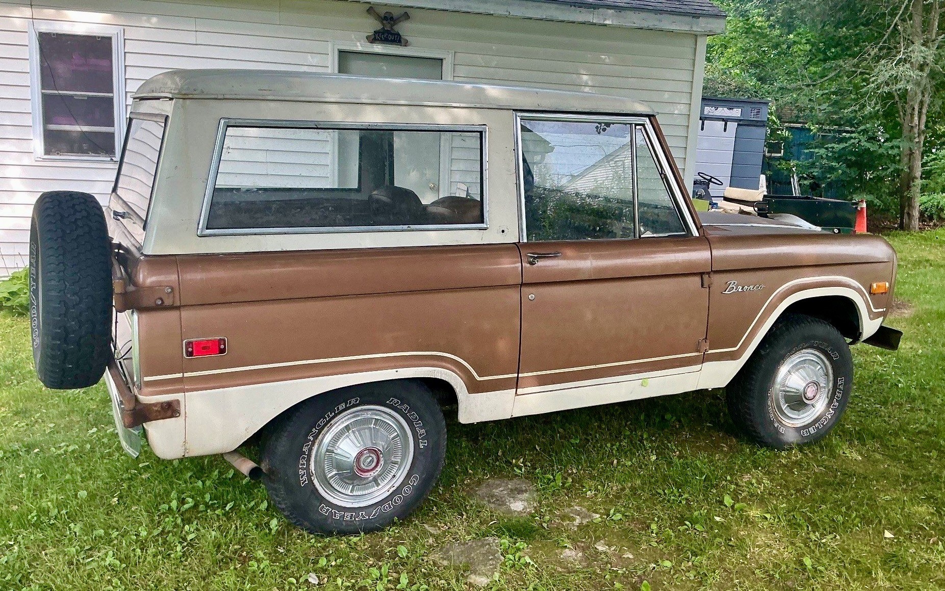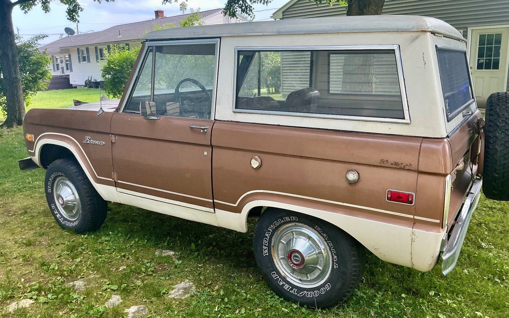 The interior has the “Ranger Package,” too. That included a color-keyed instrument panel, full carpeting (missing here), cloth-and-vinyl seat trim (in ginger on this truck), hood and lower bodyside tape stripes, swing-away spare tire carrier, and more. The interior will need some work, but the Bronco is so popular that you’ll spend days flipping through parts catalogs from various suppliers. One option that the original owner did not order was the automatic transmission, meaning that you’ll get a fully synchronized three-speed manual.