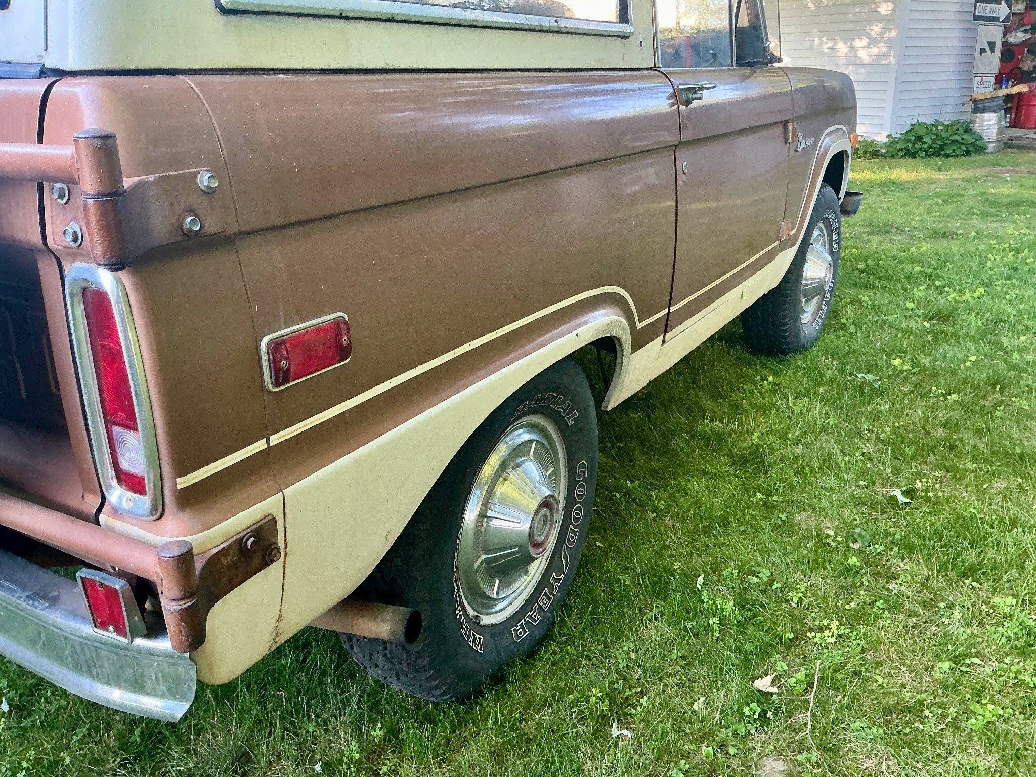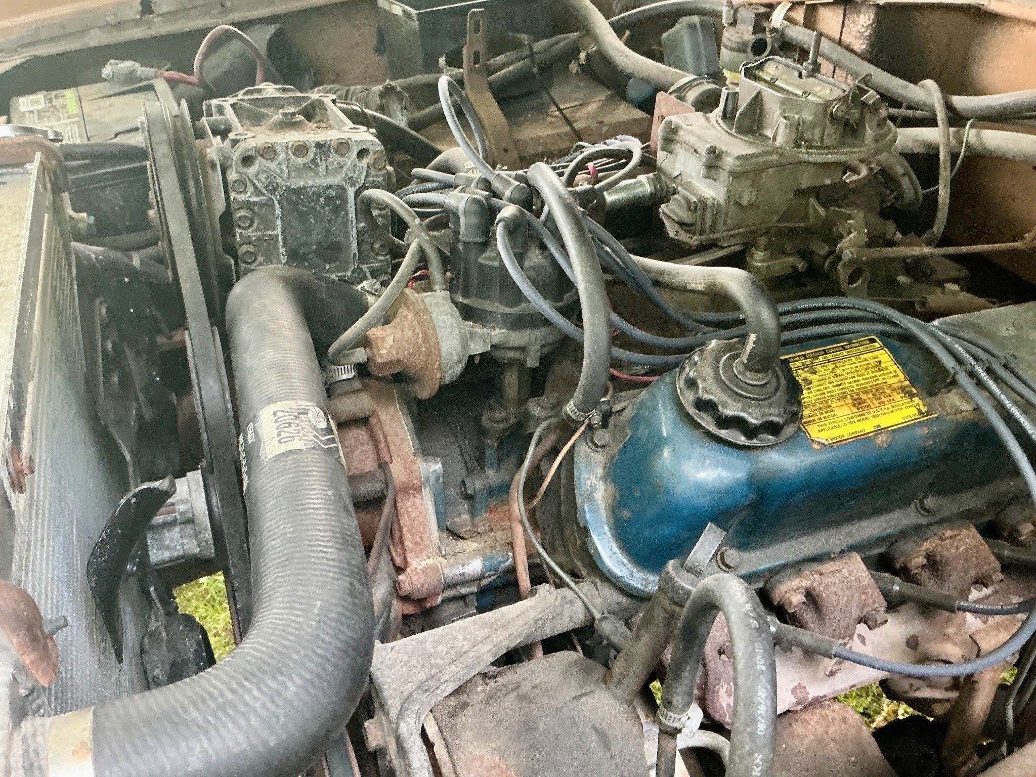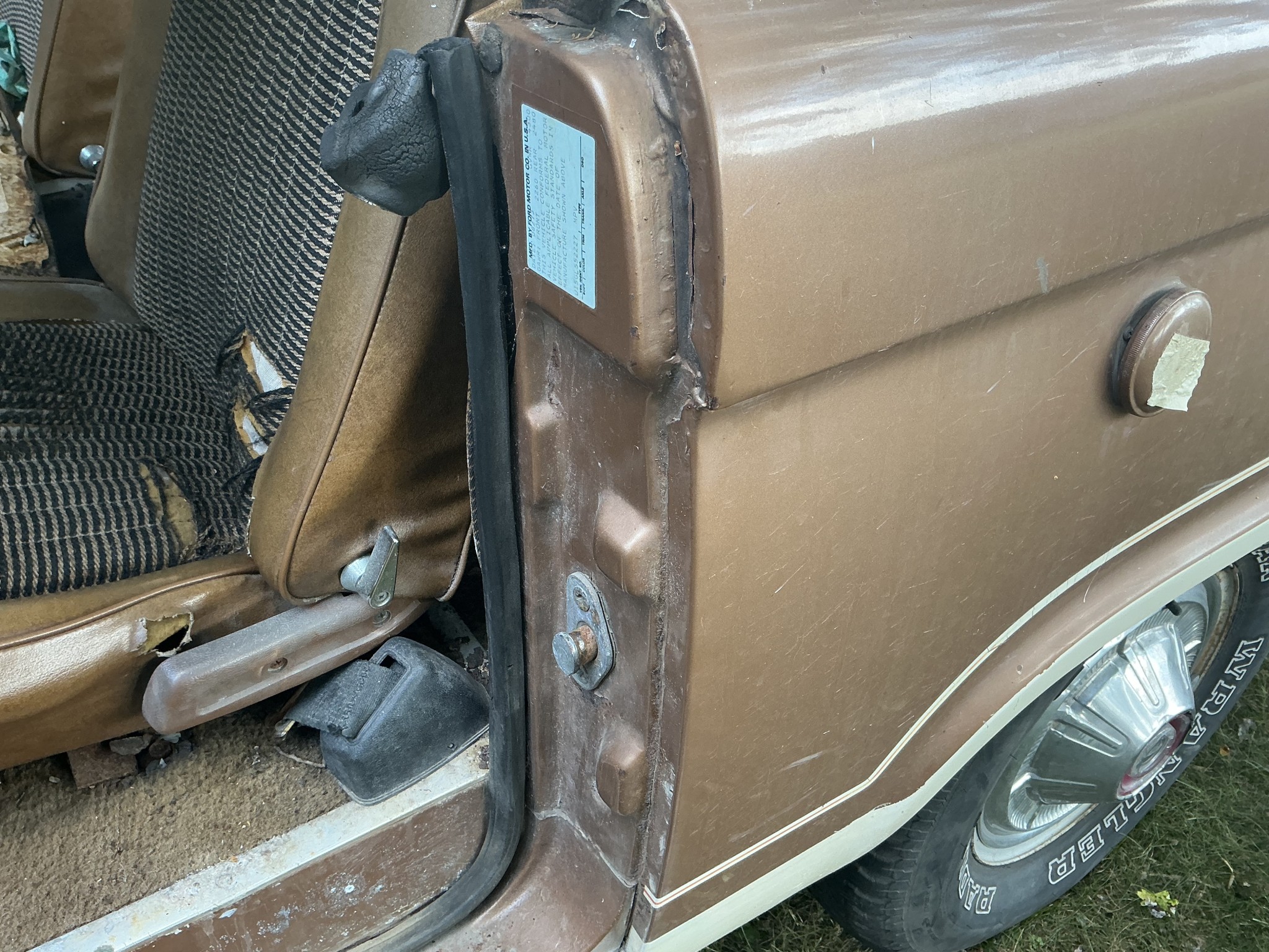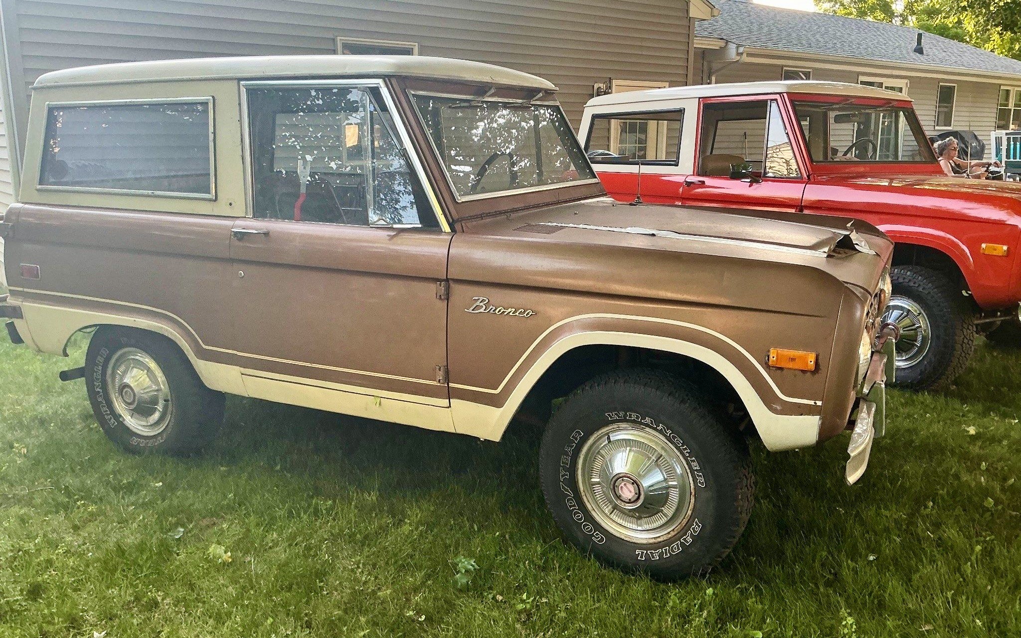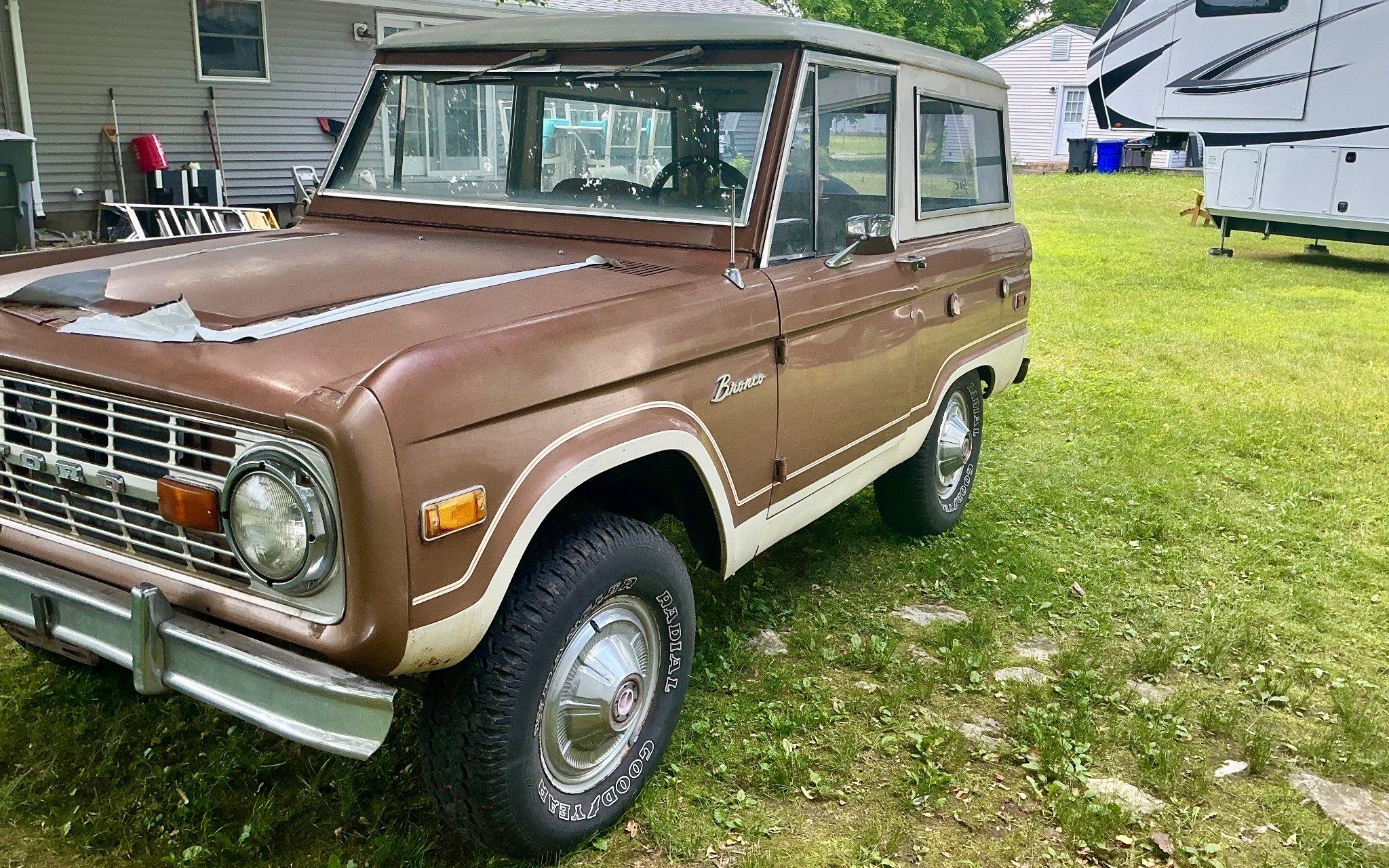 The interior has the “Ranger Package,” too. That included a color-keyed instrument panel, full carpeting (missing here), cloth-and-vinyl seat trim (in ginger on this truck), hood and lower bodyside tape stripes, swing-away spare tire carrier, and more. The interior will need some work, but the Bronco is so popular that you’ll spend days flipping through parts catalogs from various suppliers. One option that the original owner did not order was the automatic transmission, meaning that you’ll get a fully synchronized three-speed manual.
